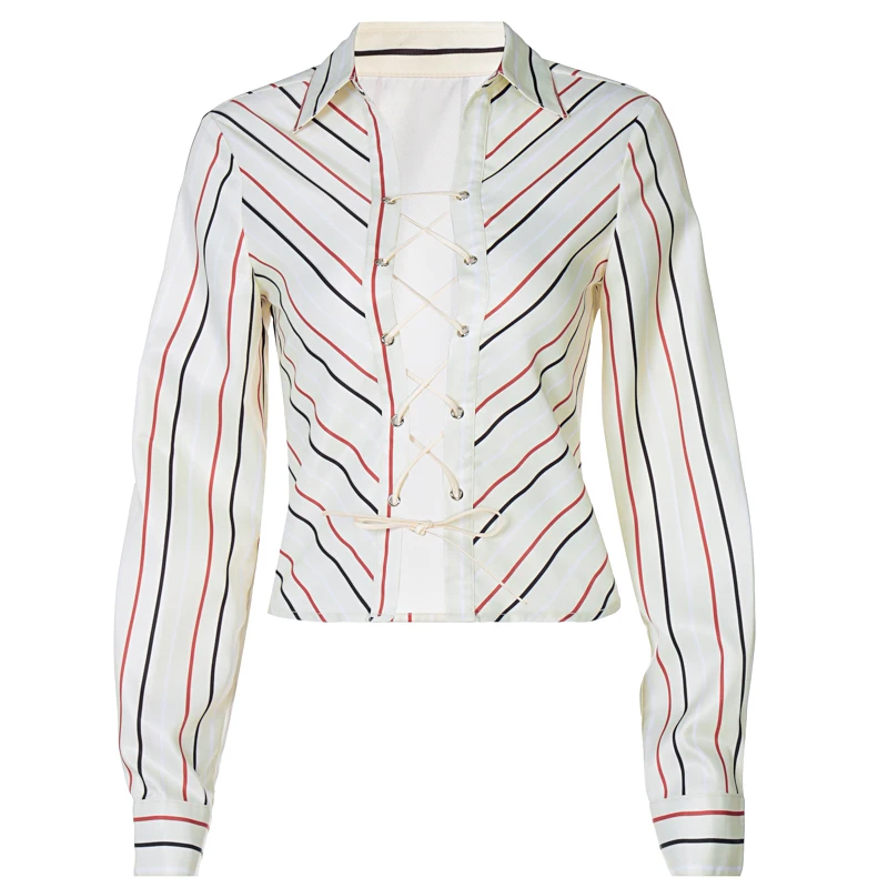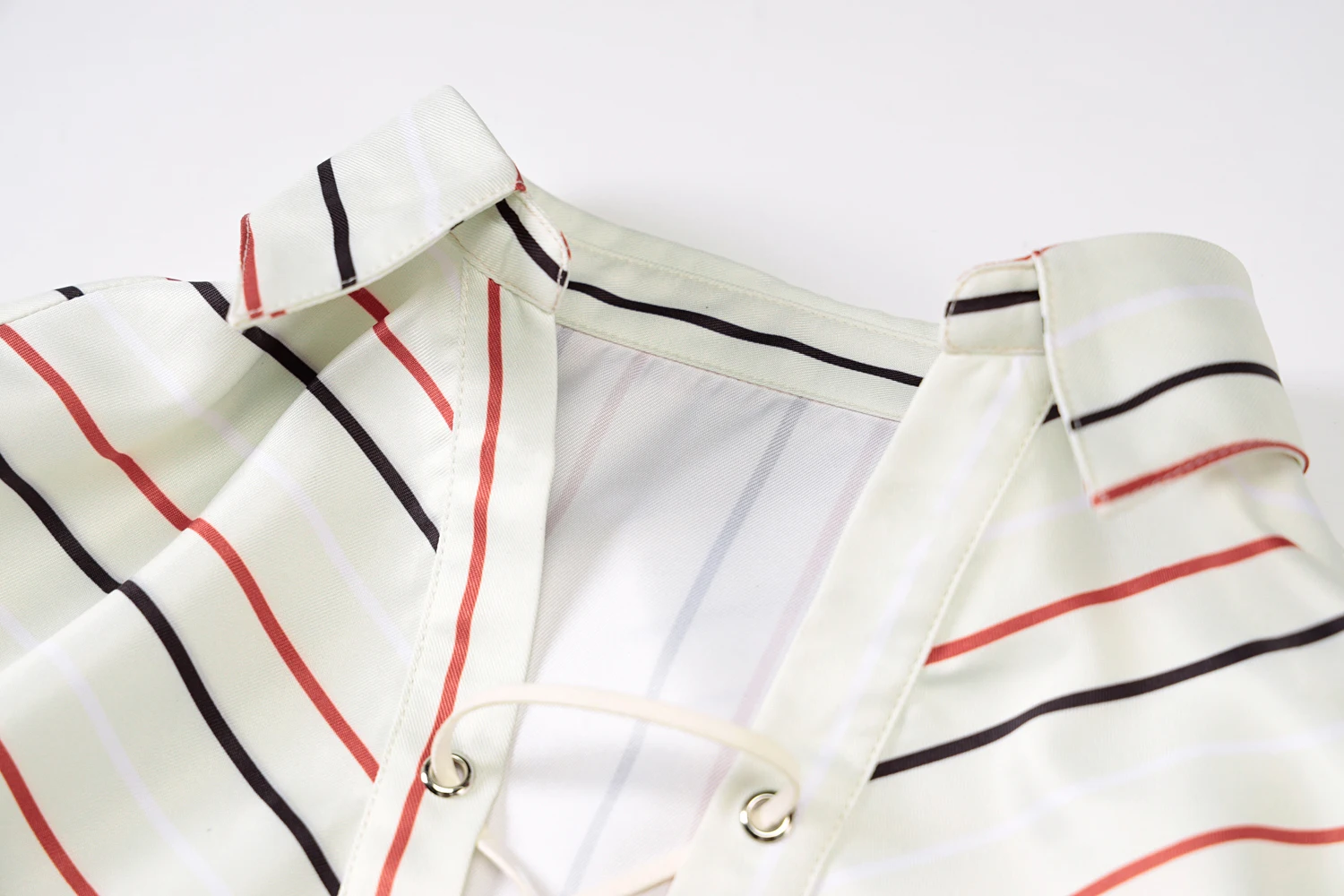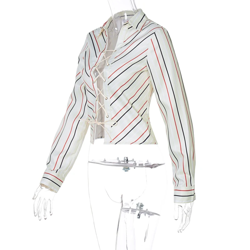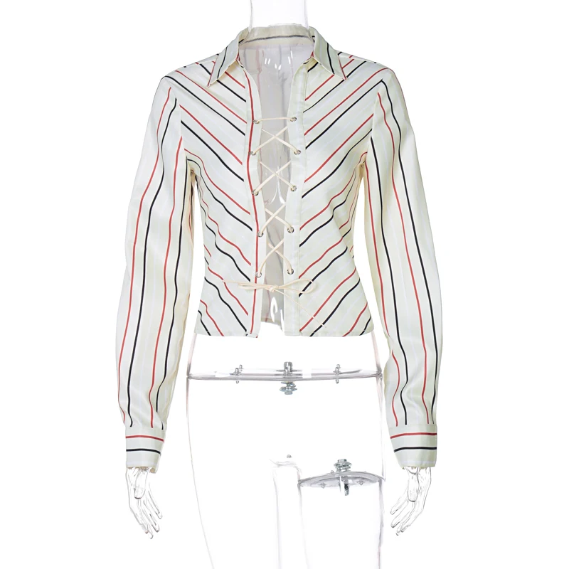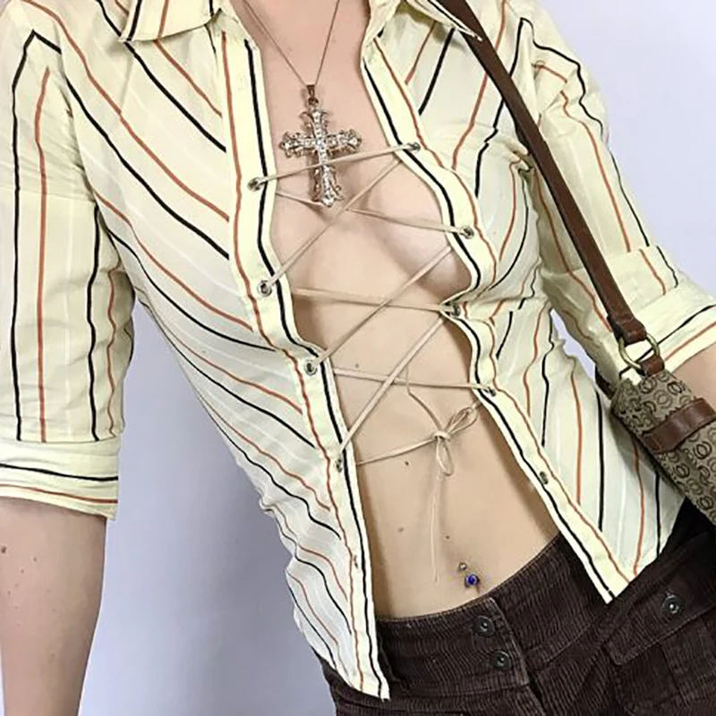 victoria’s vogue 2022 Long Sleeve Striped Bandage Tops Summer Women Fashion Vintage Tshirts Streetwear Tees