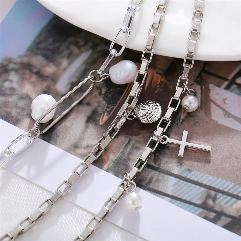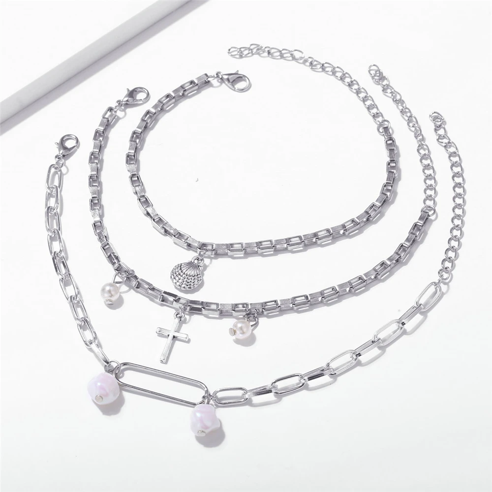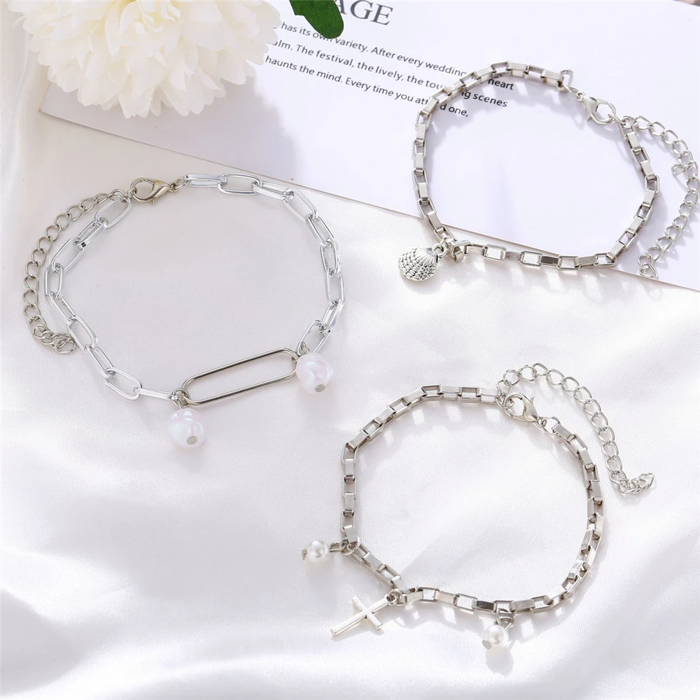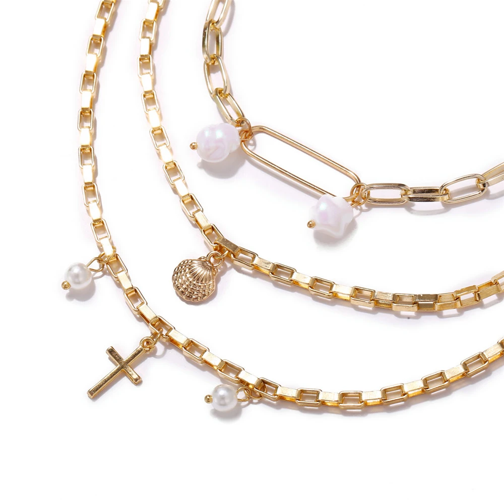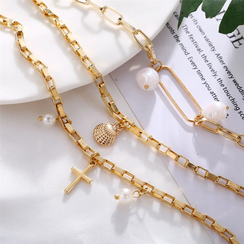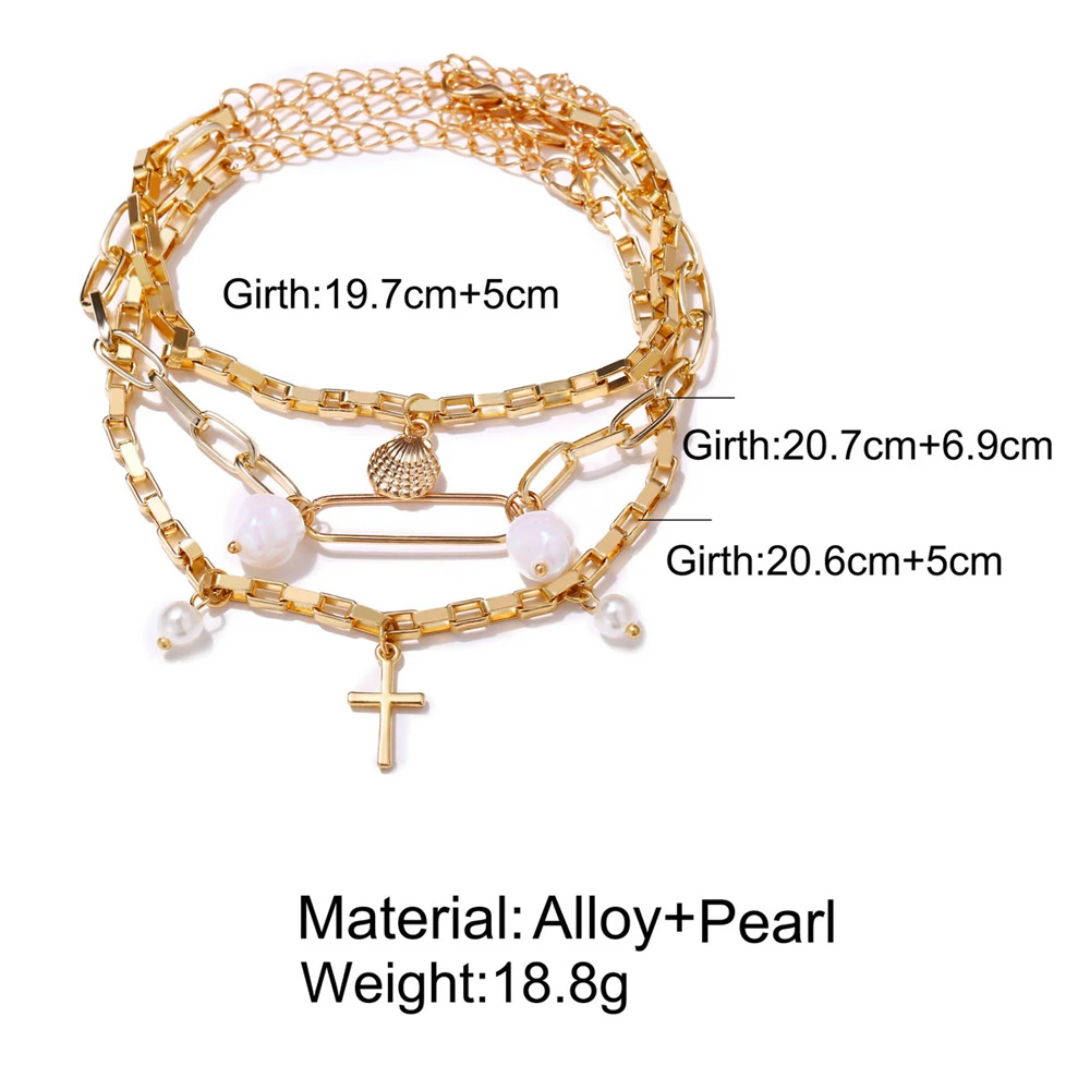 victoria’s vogue 2022 New Vintage Gold Shell Faux Pearl Cross Pendant Fashion Bracelets For Women Boho Multiple Layers Bracelet Set Jewelry