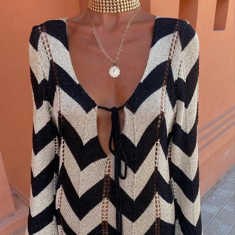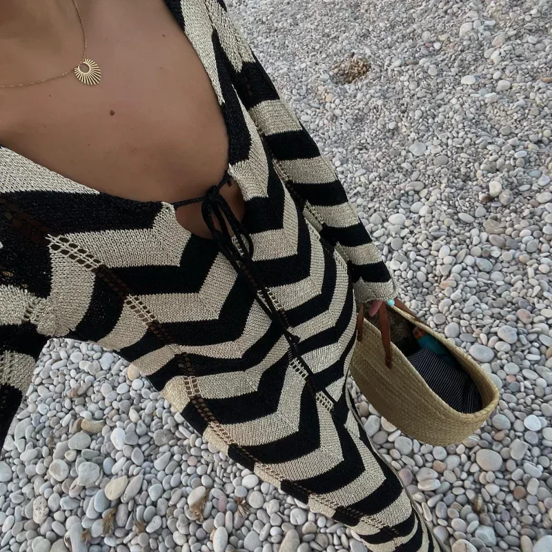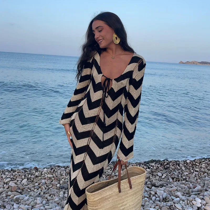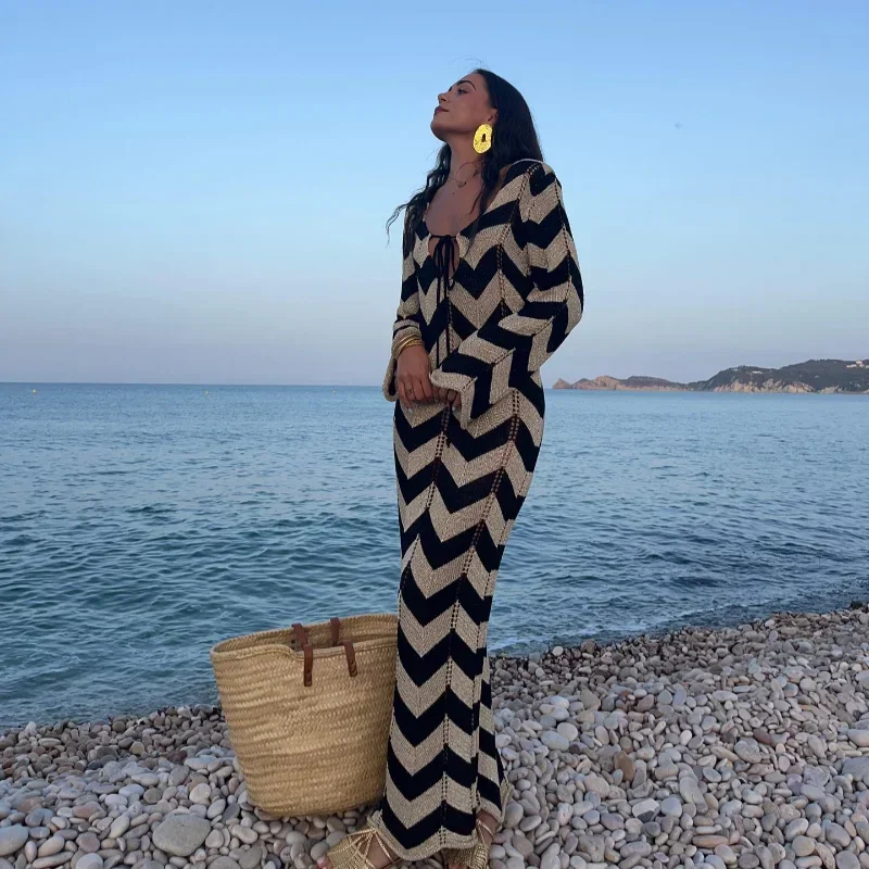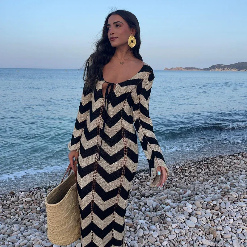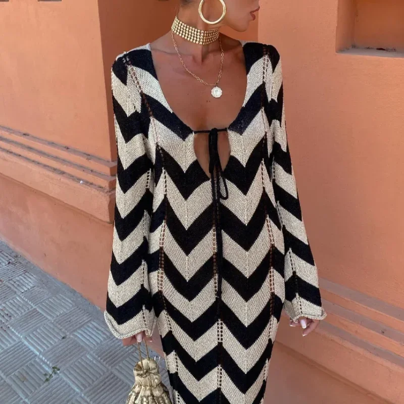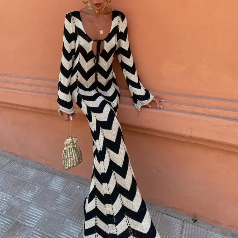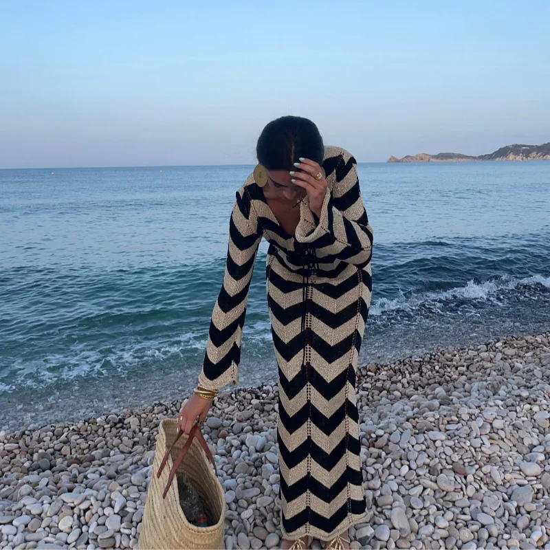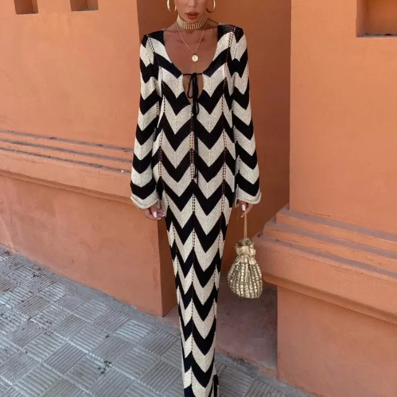 Victoria’s Vogue 2024 Elegant Hookflower Striped Knitted Long Dress Women V-neck Hollow Out Lace Up Long Sleeve Vestido Lady Vacation Robes