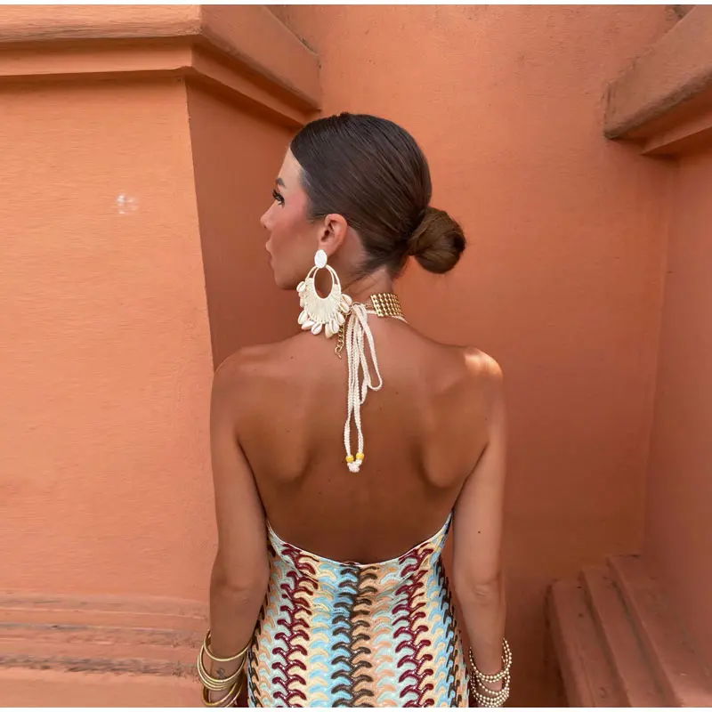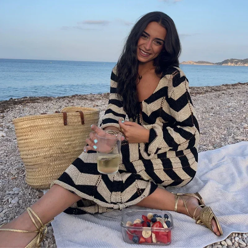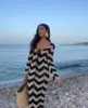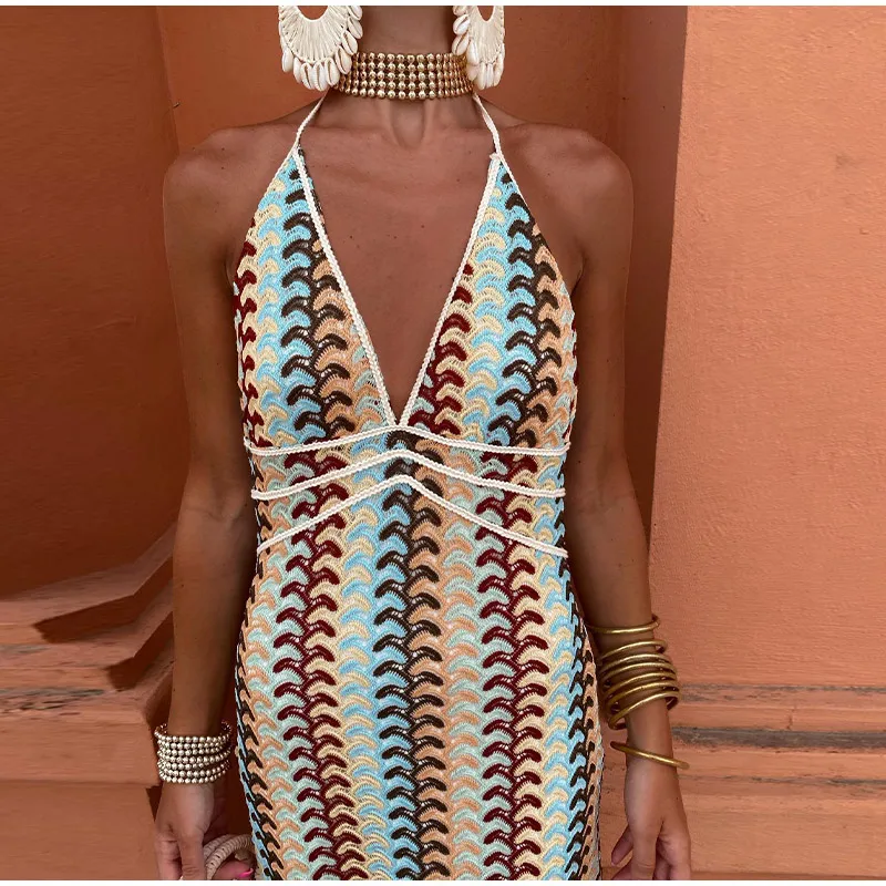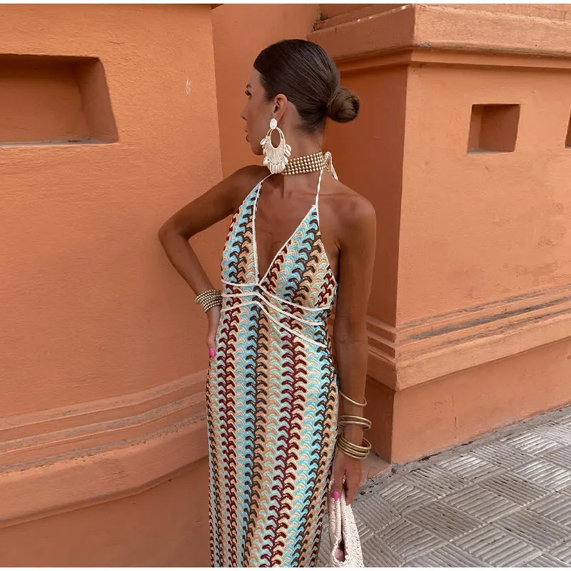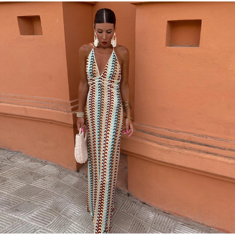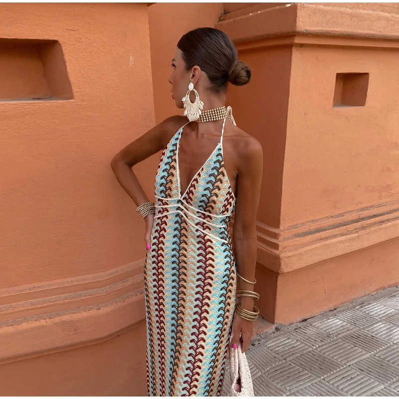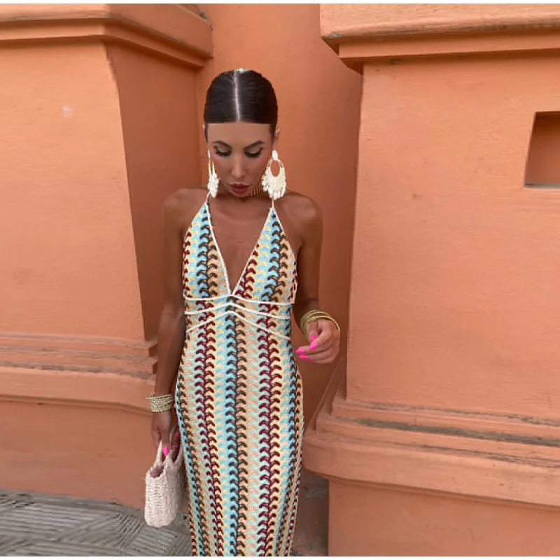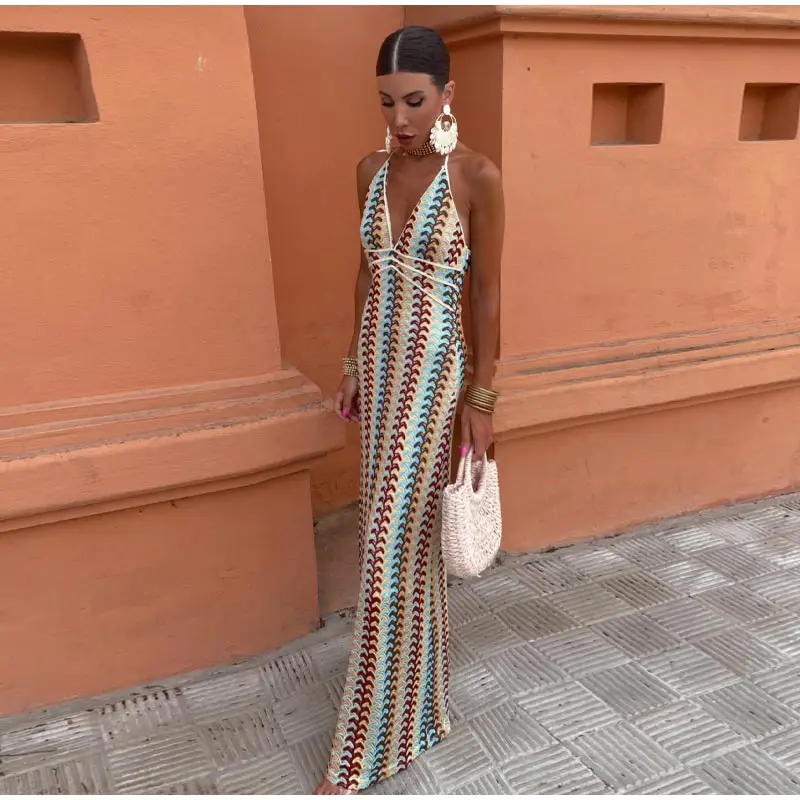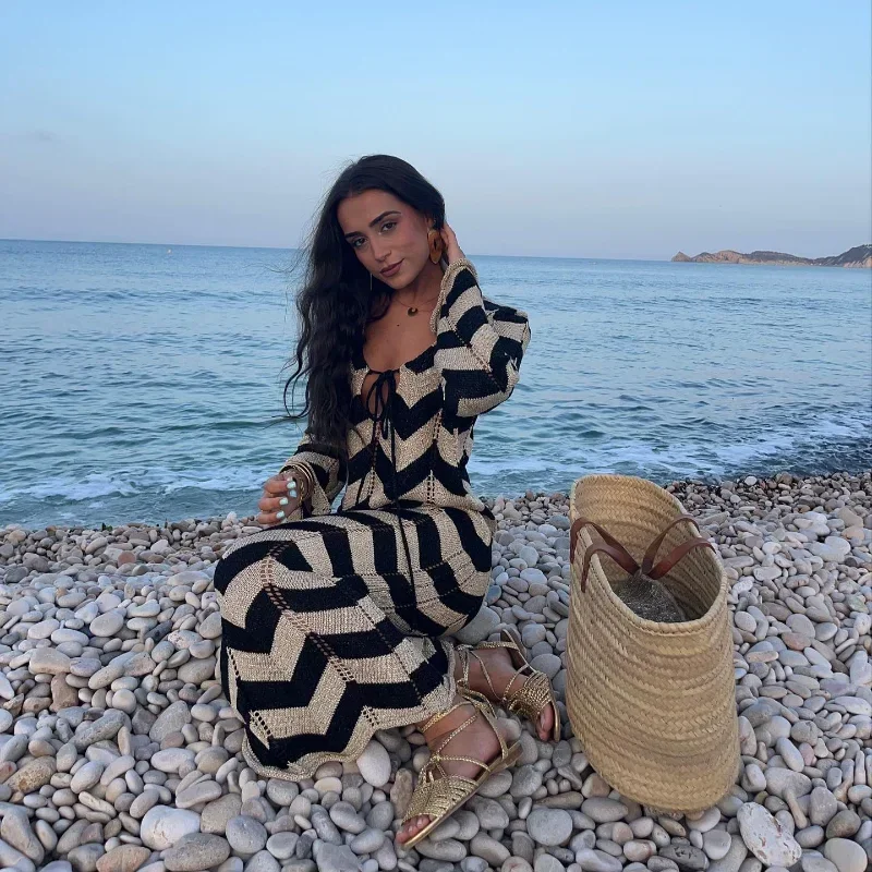 Victoria’s Vogue 2024 Elegant Hookflower Striped Knitted Long Dress Women V-neck Hollow Out Lace Up Long Sleeve Vestido Lady Vacation Robes