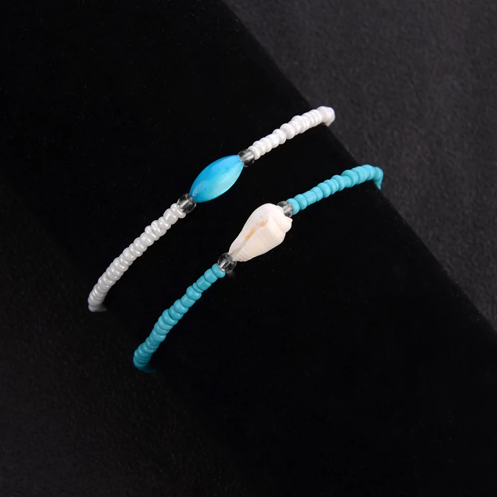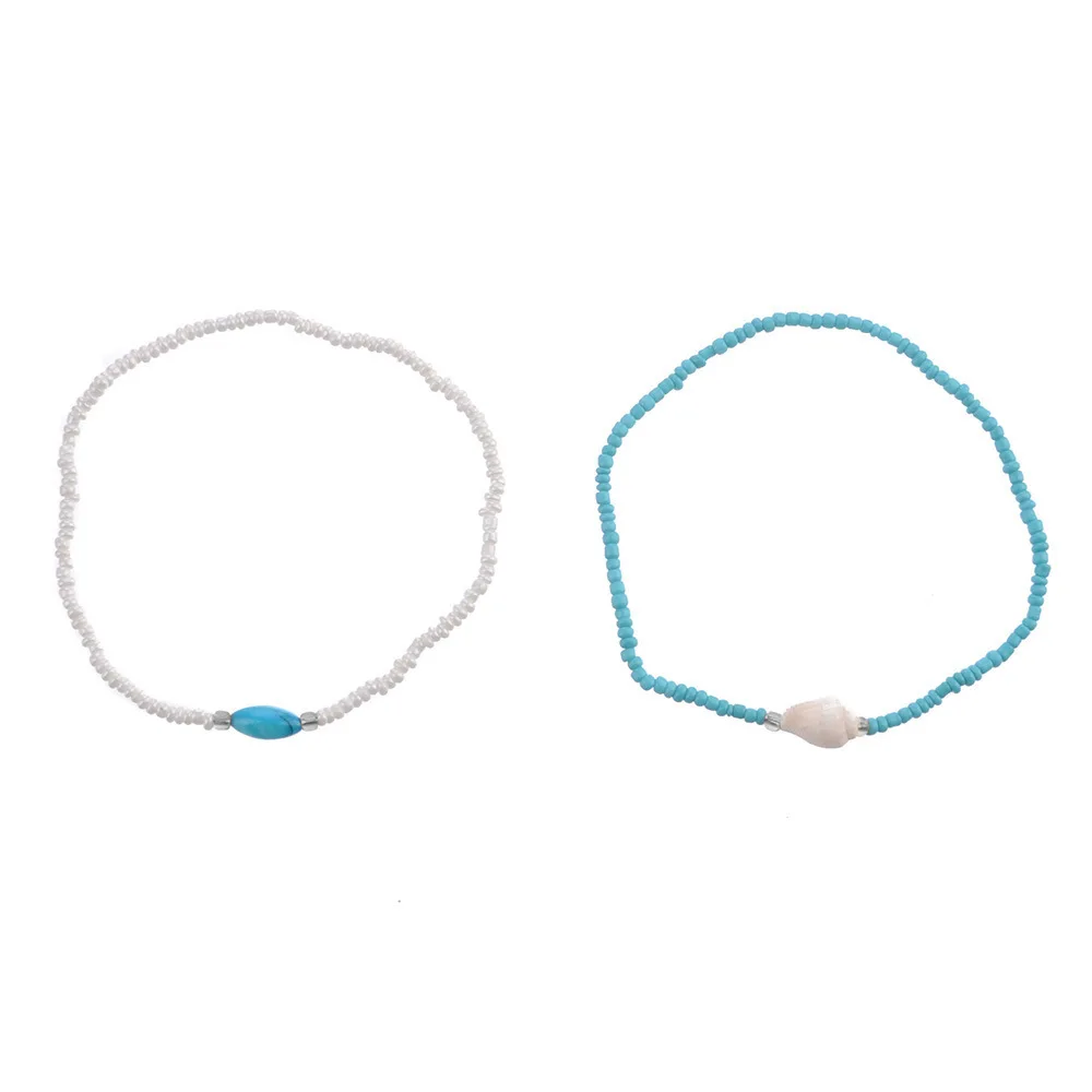 Victoria’s Vogue 2Pcs/Set Bohemia Blue White Beads Anklets For Women Shell Conch Leg Foot Bracelet Sandal Ankle Chain Boho Summer Beach Jewelry