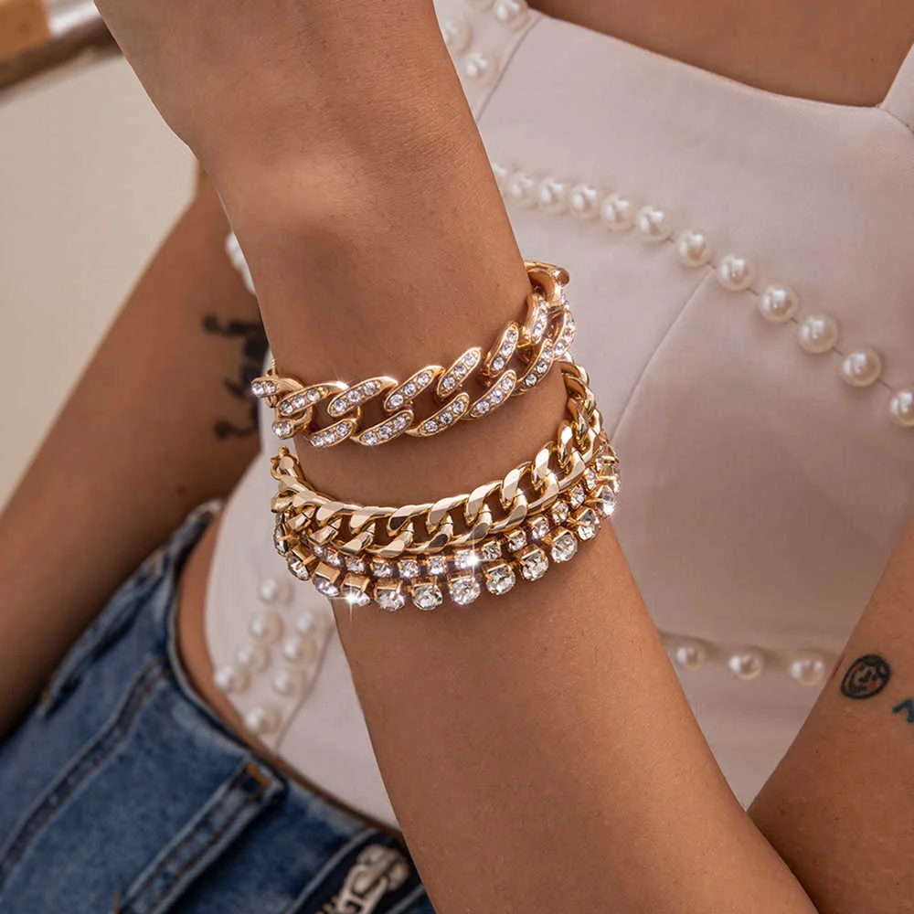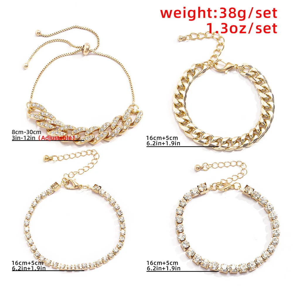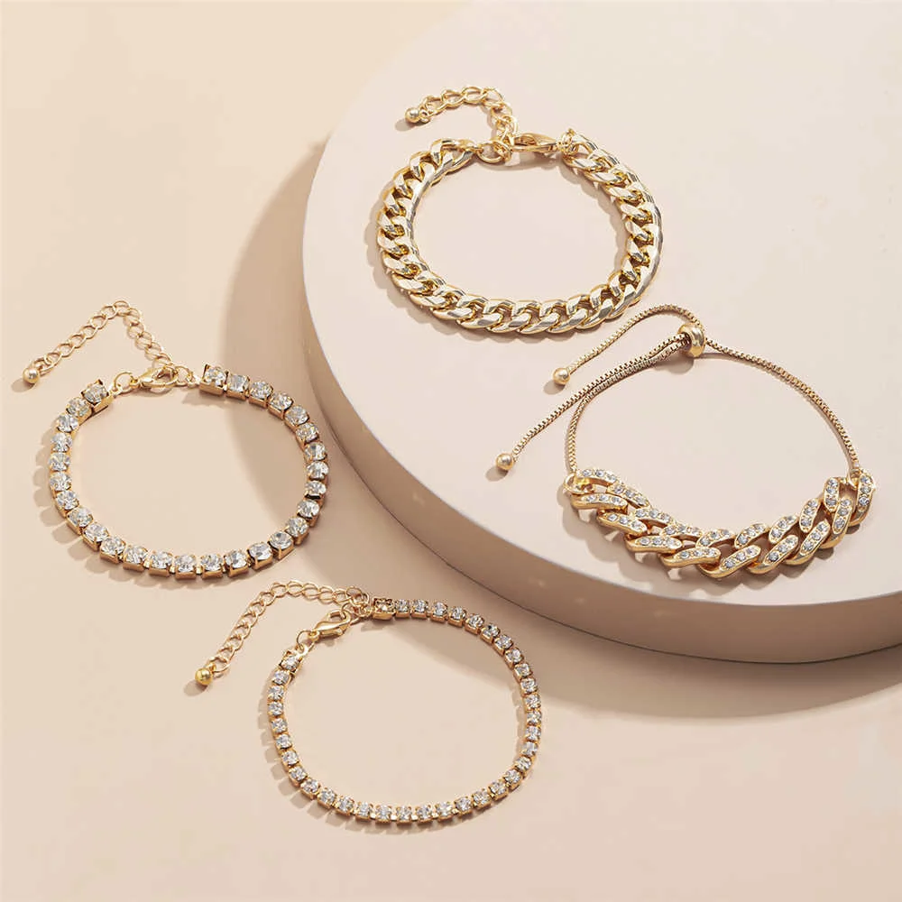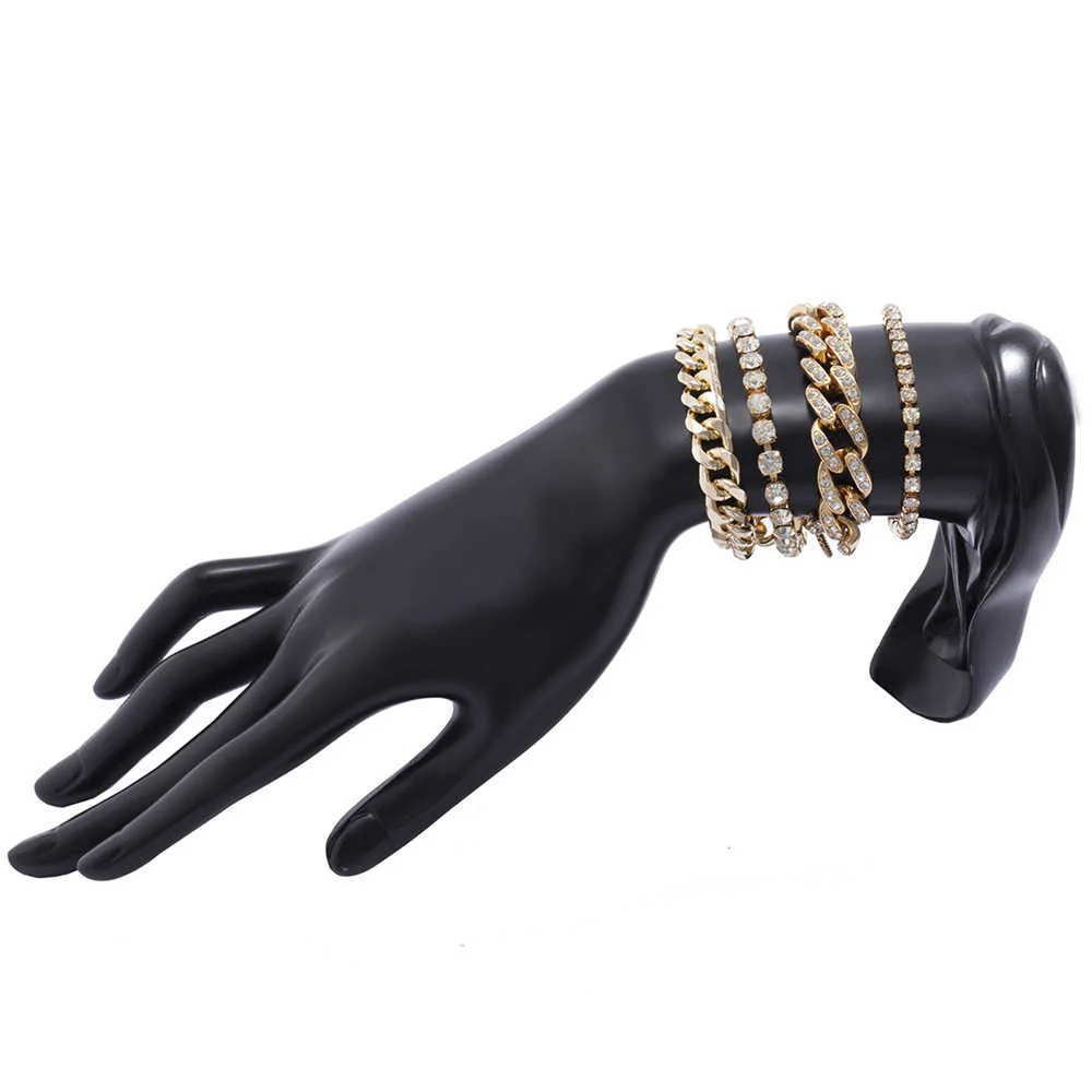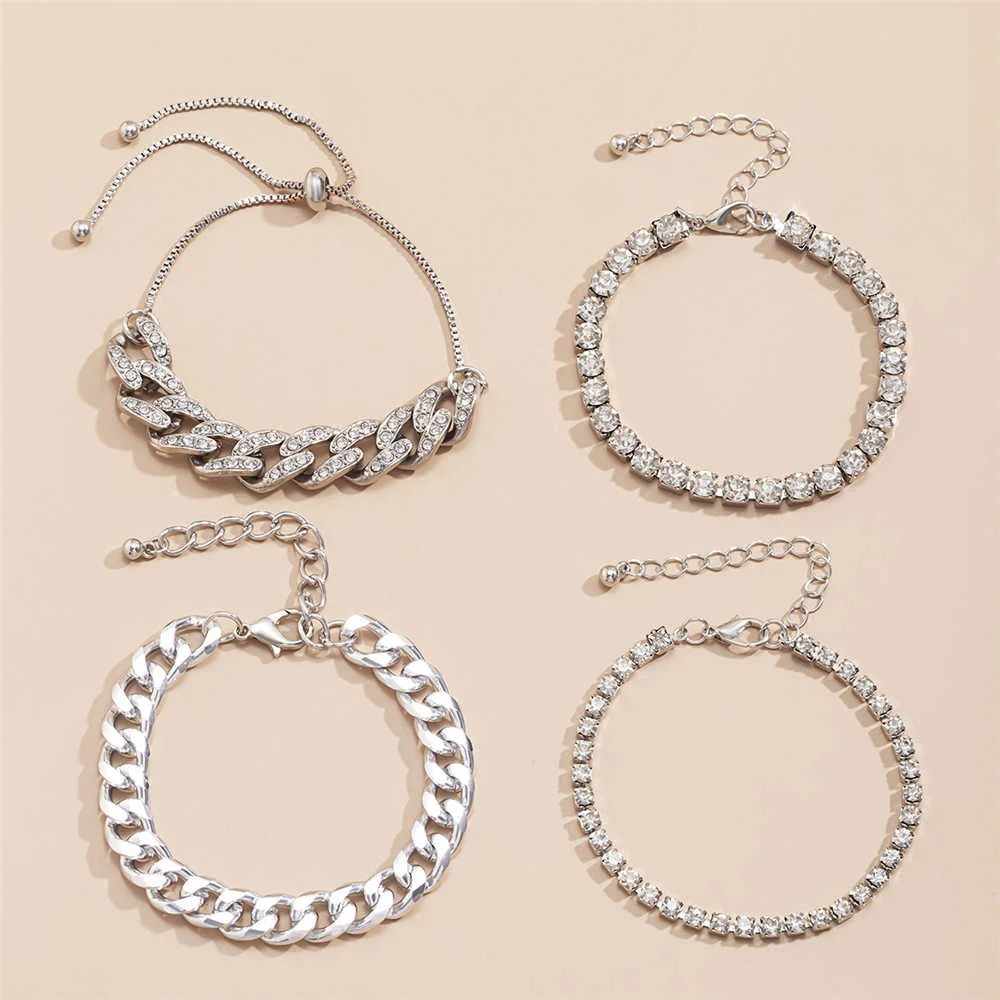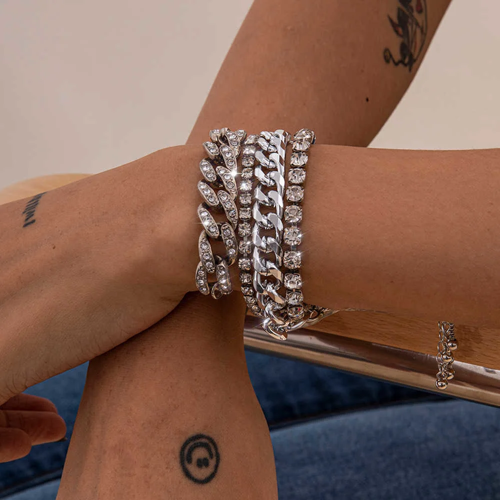 victoria’s vogue 4Pcs/Set Adjustable Full Iced Out Rhinestone Curb Cuban Chain Bracelets Bangles for Women Chunky Thick Wrist Jewelry