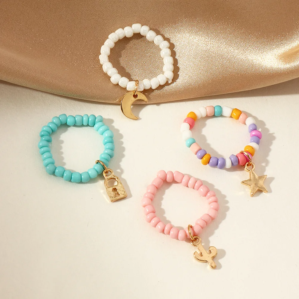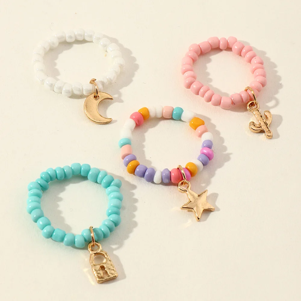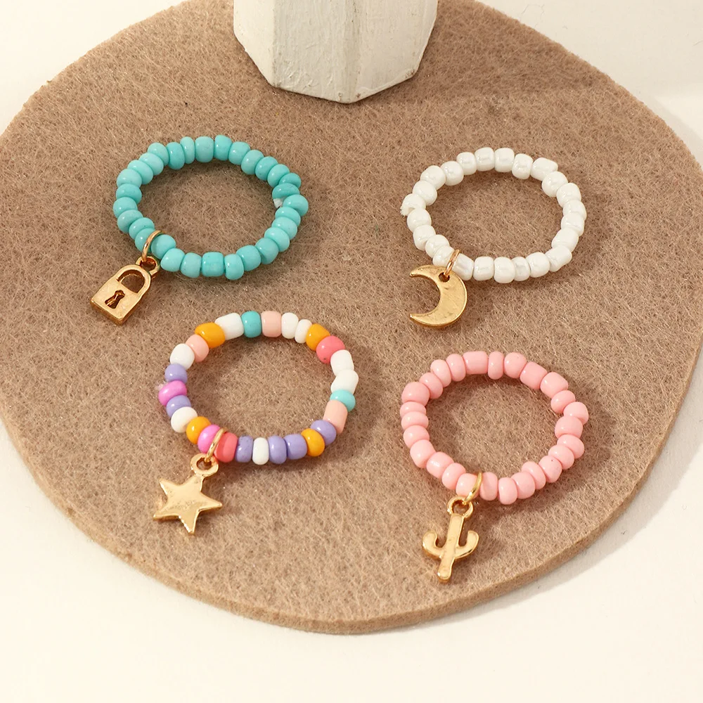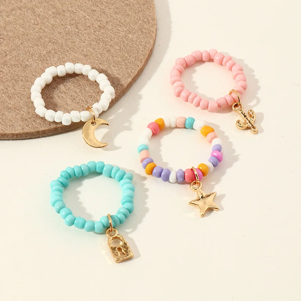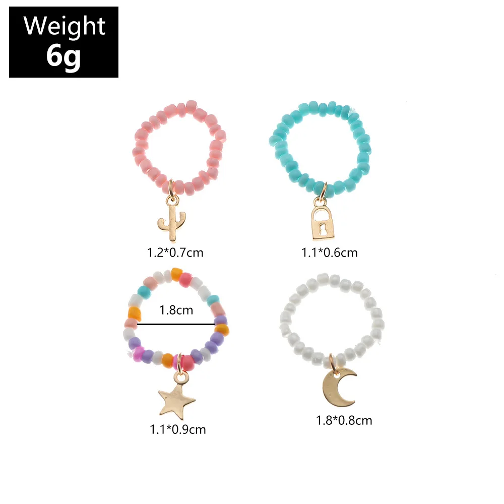 Victoria’s Vogue 4Pcs/set Fashion Colorful Rice Bead Rings Star Moon Pendant Ring Set Adjustable Handmade Fun Finger Ring For Women Girls Jewelry