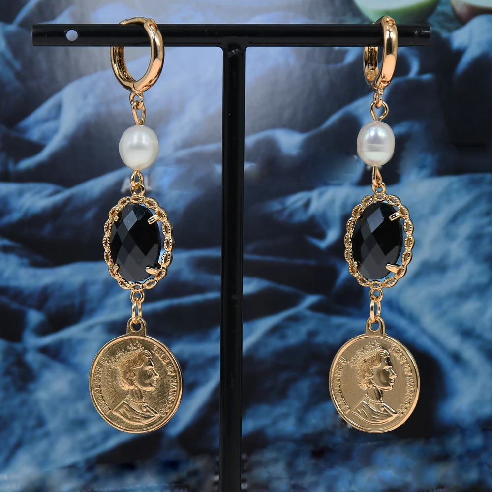 Victoria’s Vogue 6 Colors Crystal Charm Pendant Earring Real Freshwater Pearl Queen Coin Earring Coop Hoop Earrings for Women Party Friday Prom