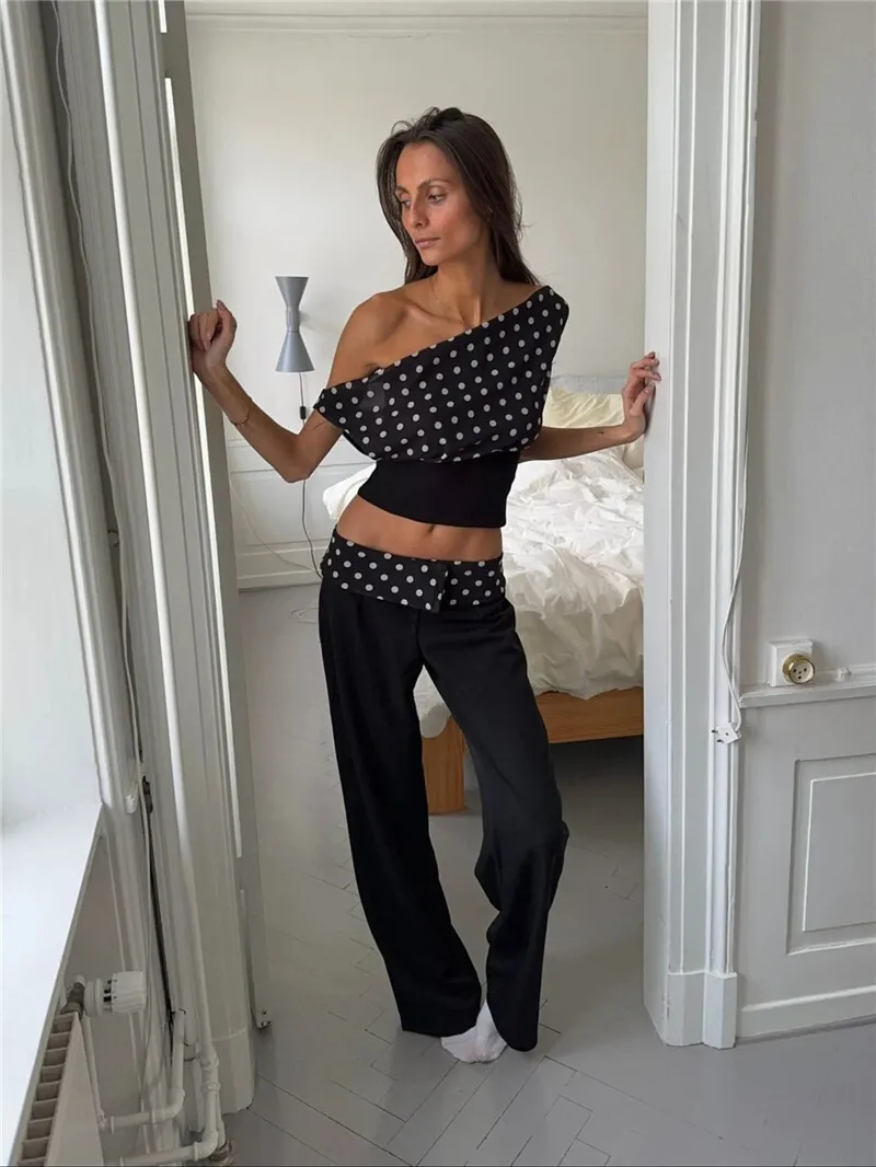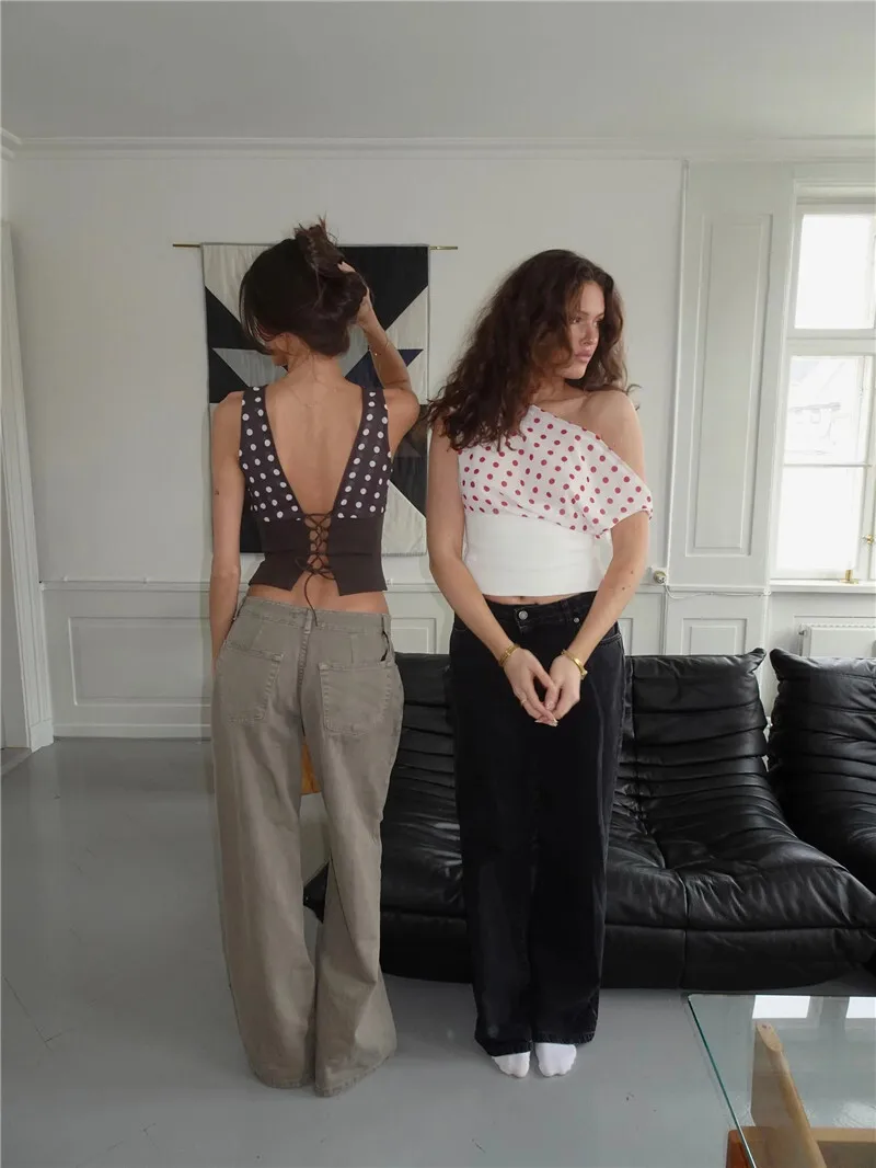 Upgrade your summer wardrobe with this stylish backless polka dot crop top, designed for women who love trendy, confident, and effortless fashion. Featuring a chic off-shoulder and asymmetrical neckline, this top highlights your collarbones and shoulders while creating a bold and feminine look. The sleeveless tank design keeps it light and breathable, making it perfect for warm-weather styling.