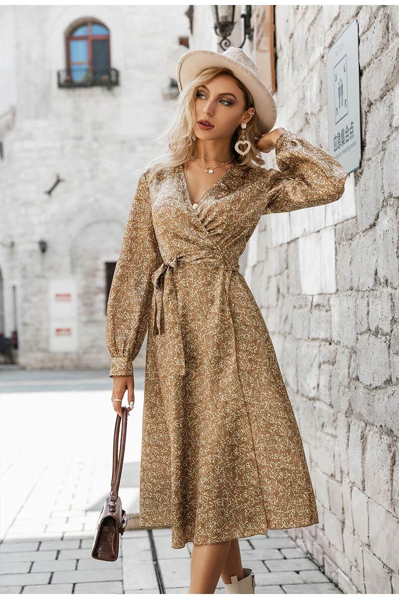 victoria’s vogue Beach straight floral women midi dress V-neck lace up female maxi vestido A-line full bishop sleeves ladies wrap dresses