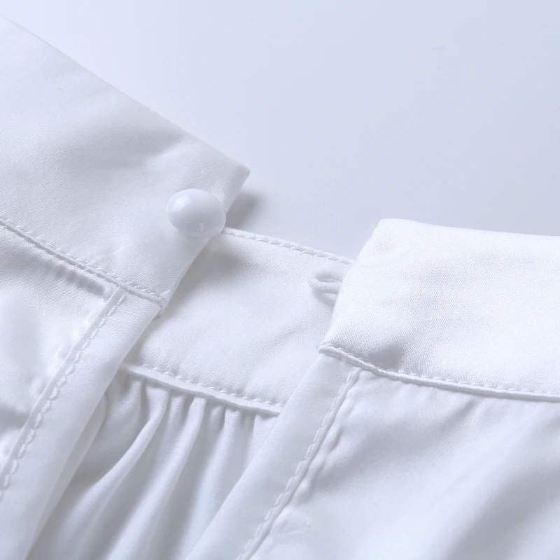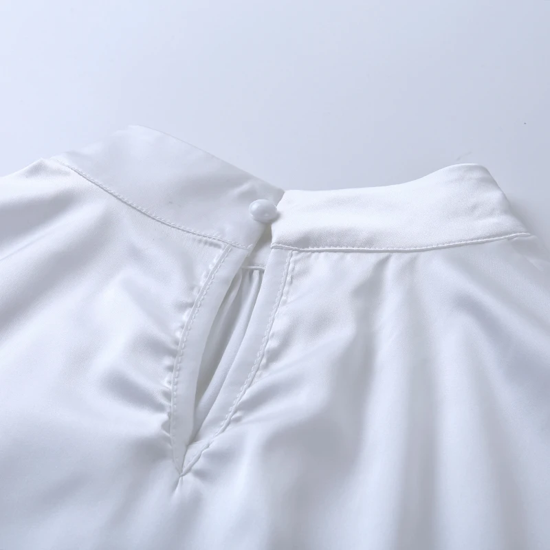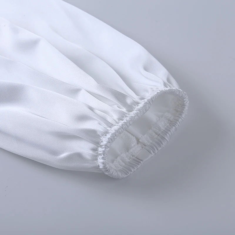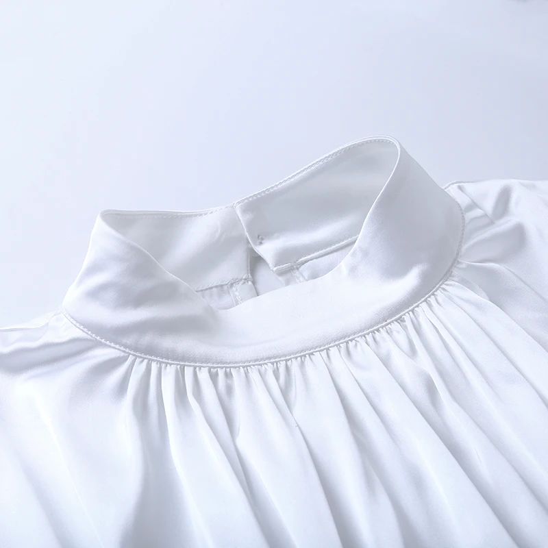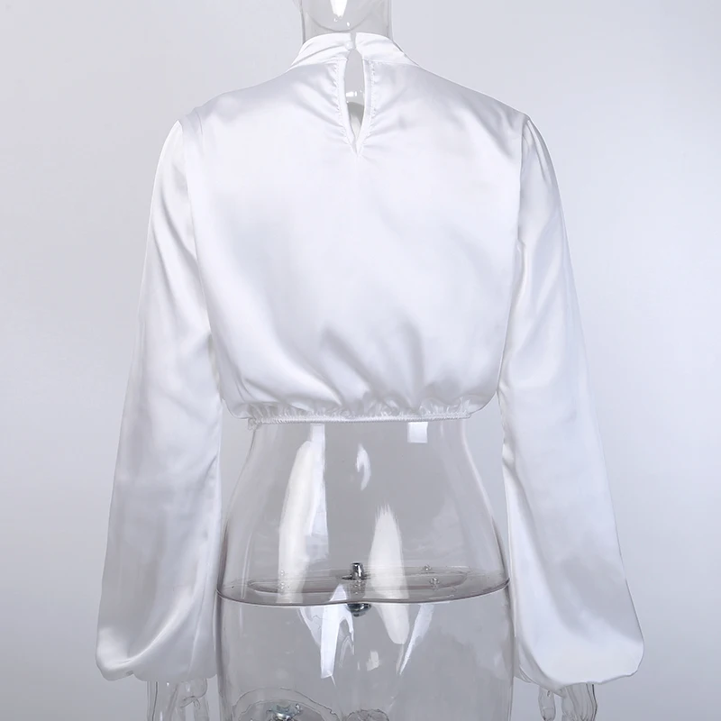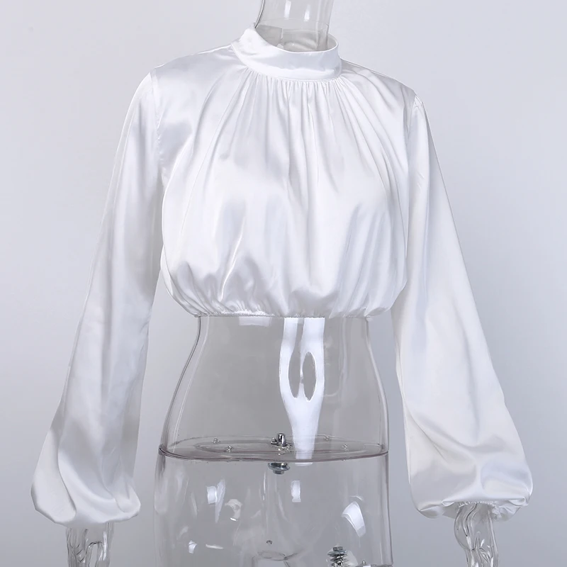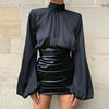 victoria’s vogue Black Lantern Sleeve Hight Neck Satin Blouse Women Slim Solid Ruched Cropped Elastic Fashion Spring Elegant Ladies Top