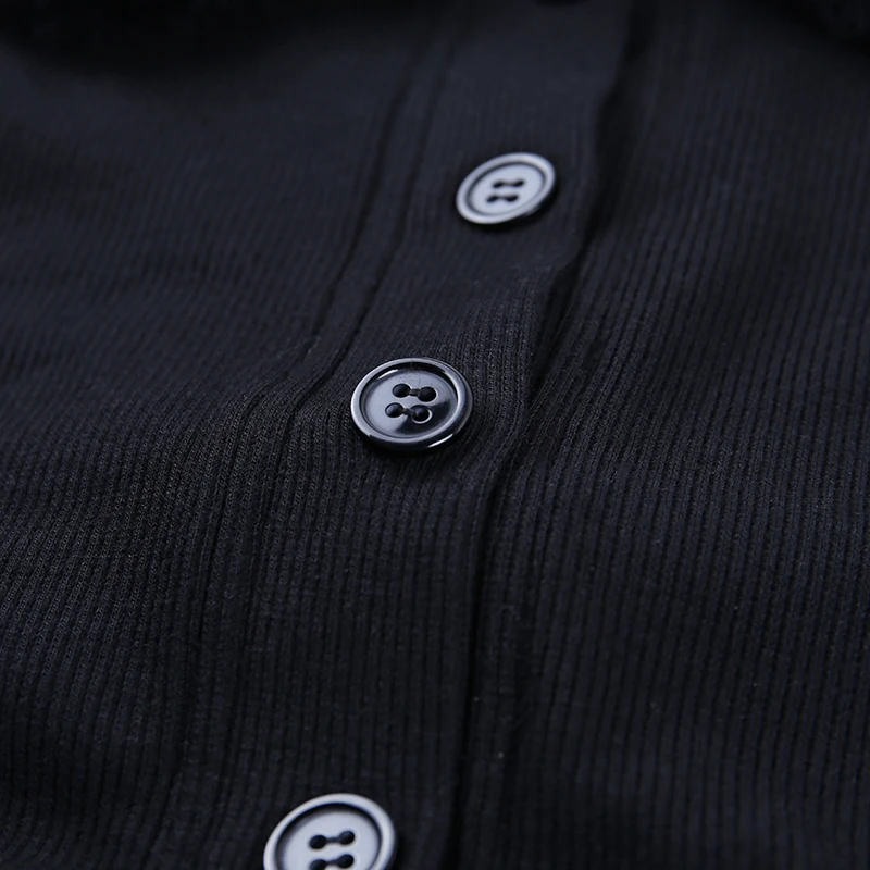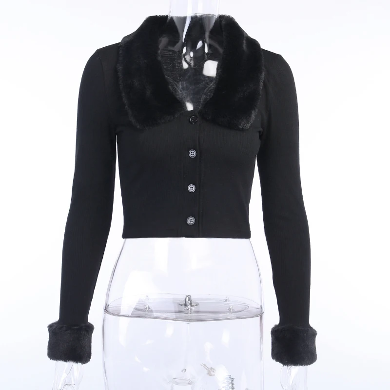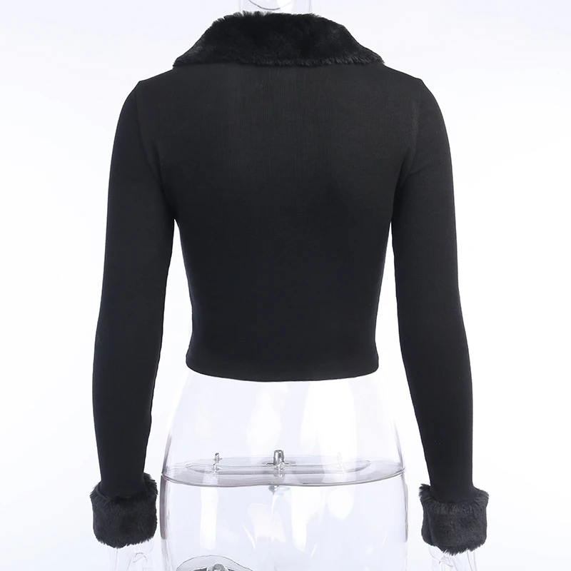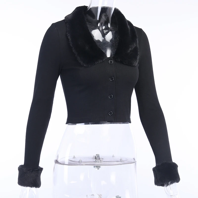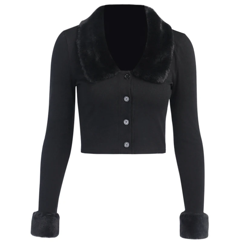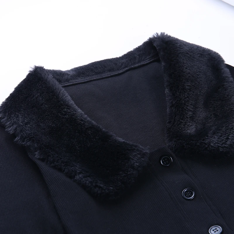 victoria’s vogue Black Long Sleeve Women Fluffy Turn-down Collar Button Autumn Women Shirt Warm Cropped Top Slim Elastic Casual Tops