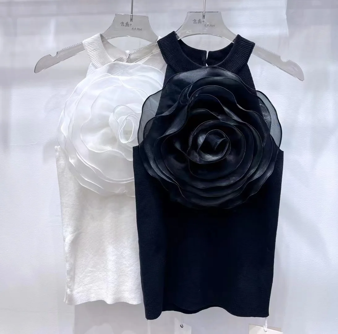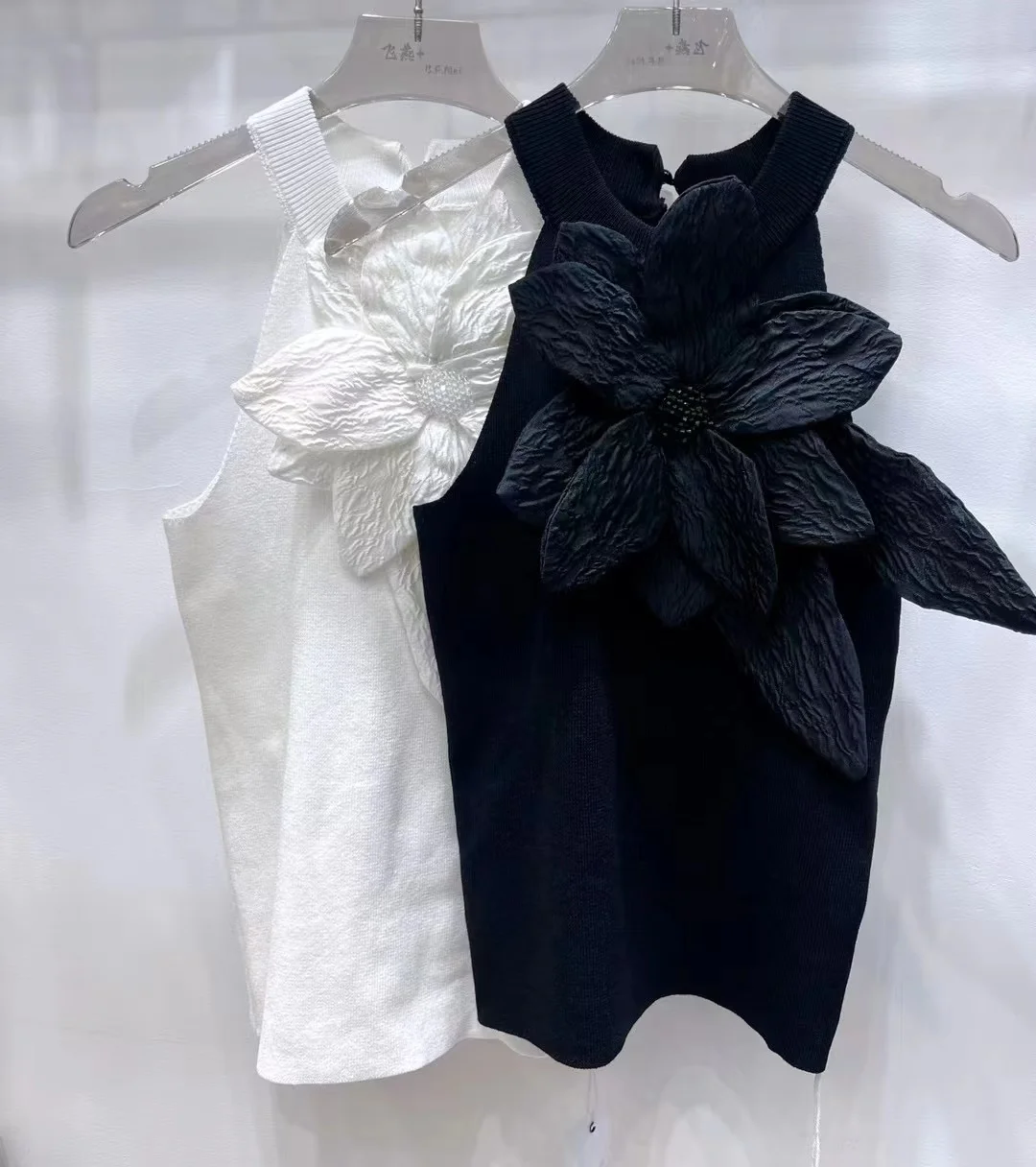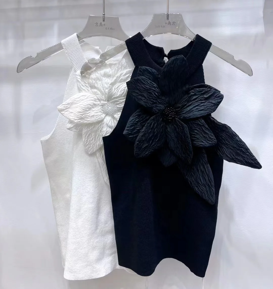 Victoria’s Vogue Black White 3D Diamonds Flower Stitch Sleeveless Knitted Top Slim Fit Halter Vest 2024 Sring Summer Knitwear Sexy Crop Tank Top