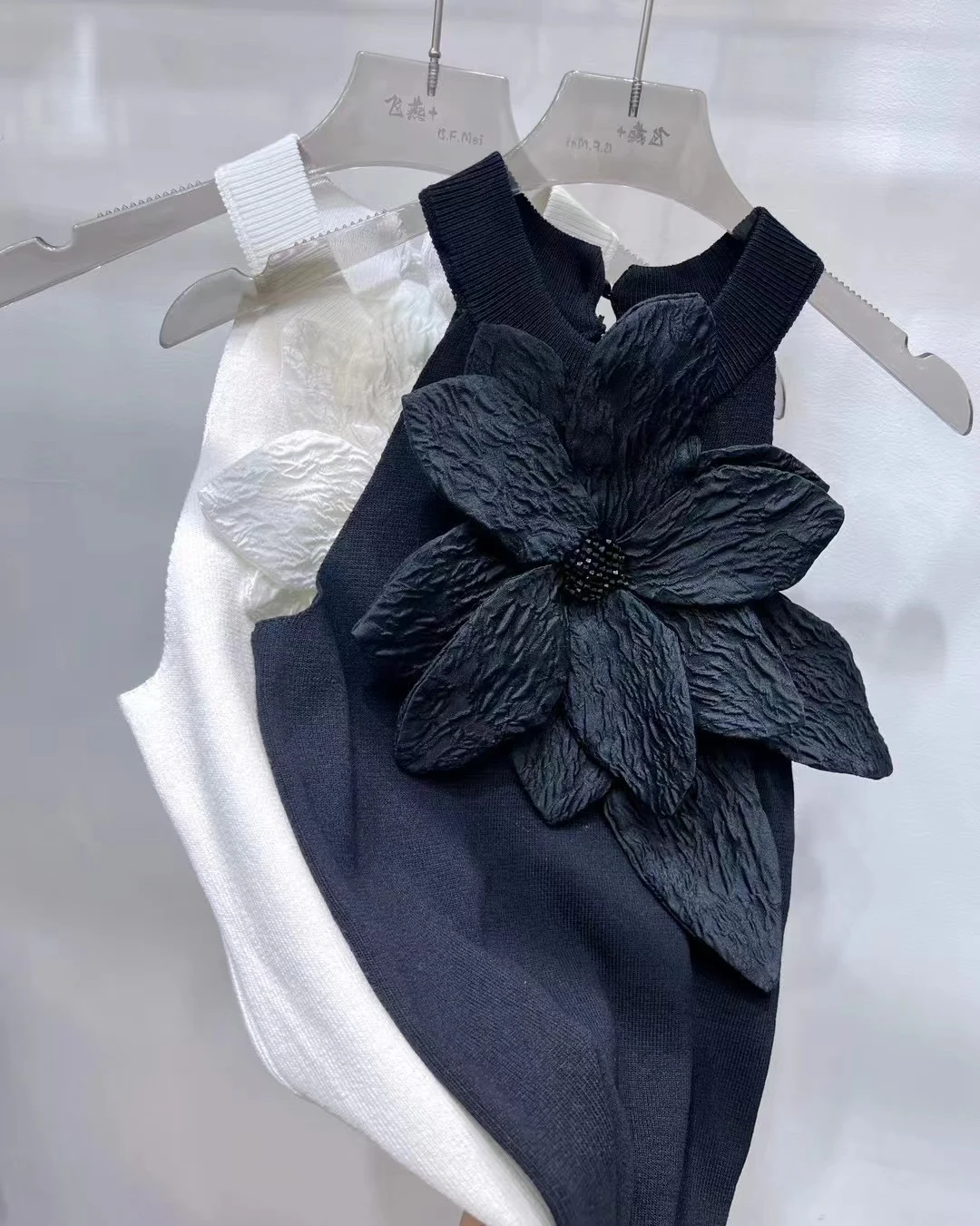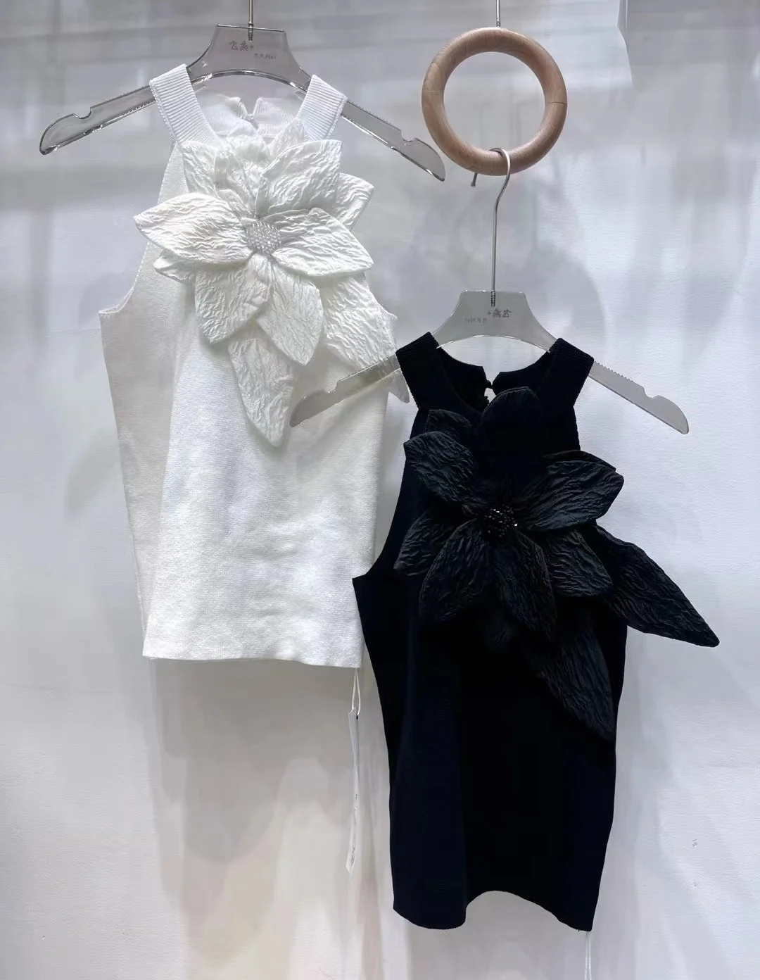 Black White 3D Diamonds Flower Stitch Sleeveless Knitted Top Slim Fit Halter Vest 2024 Sring Summer Knitwear Sexy Crop Tank Top