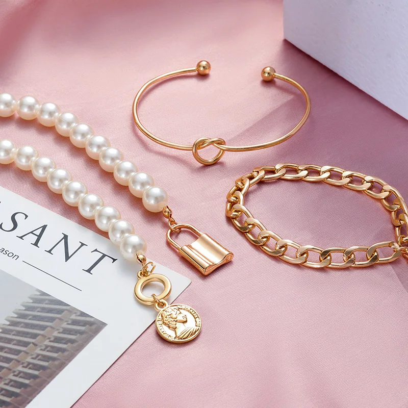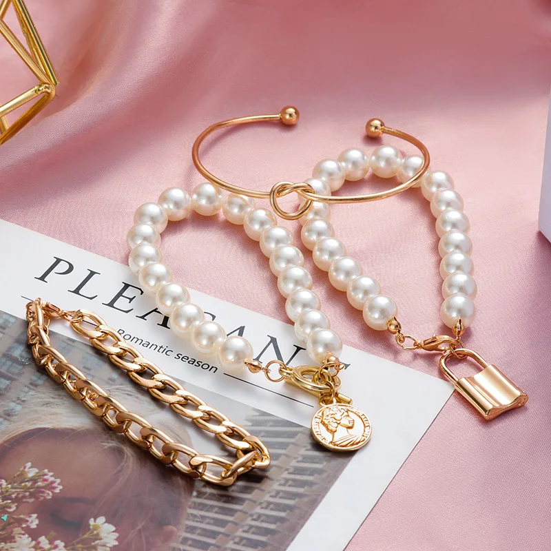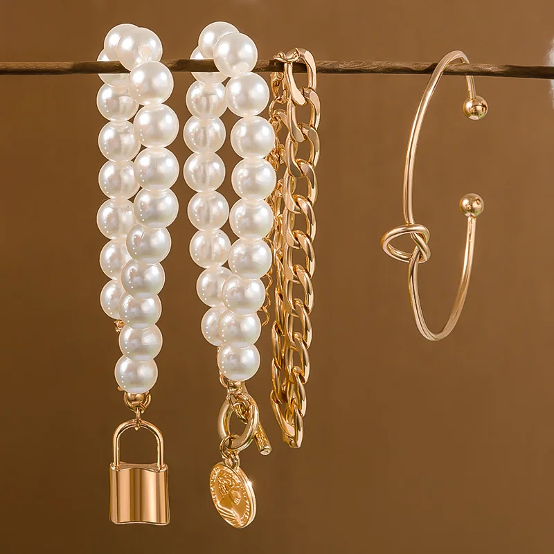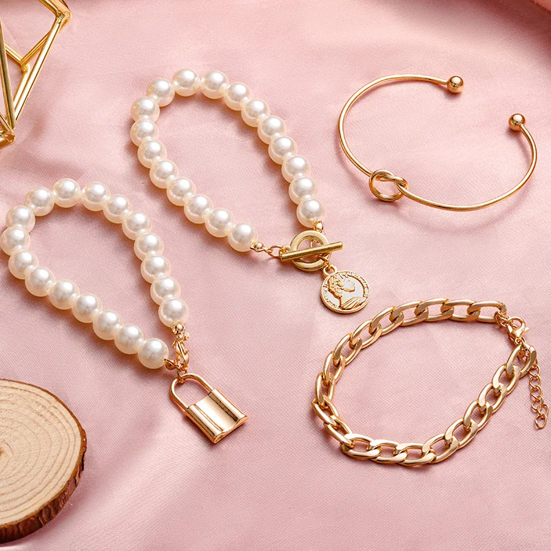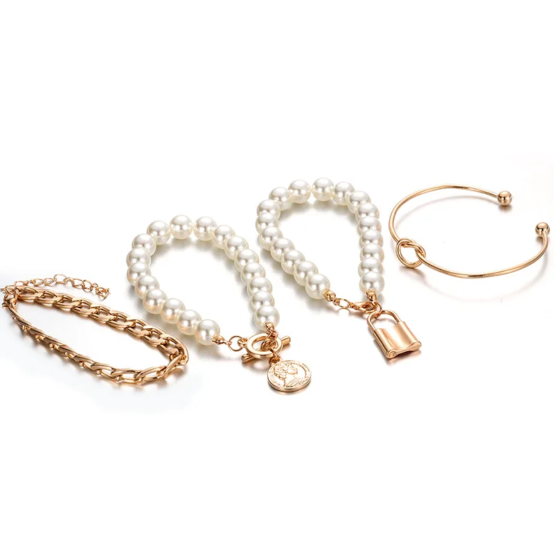 victoria’s vogue Bohemian Gold Tassel Pearl Bracelets for Women Geometric Round Coin Beads Lock Hand Chain Charm Bracelet Set Party Jewelry Gift