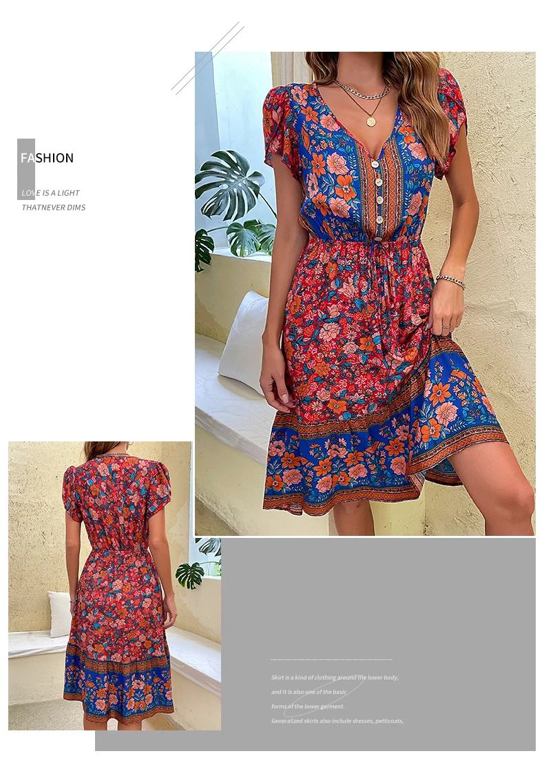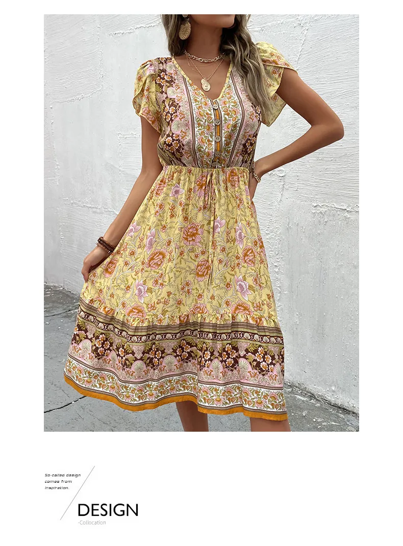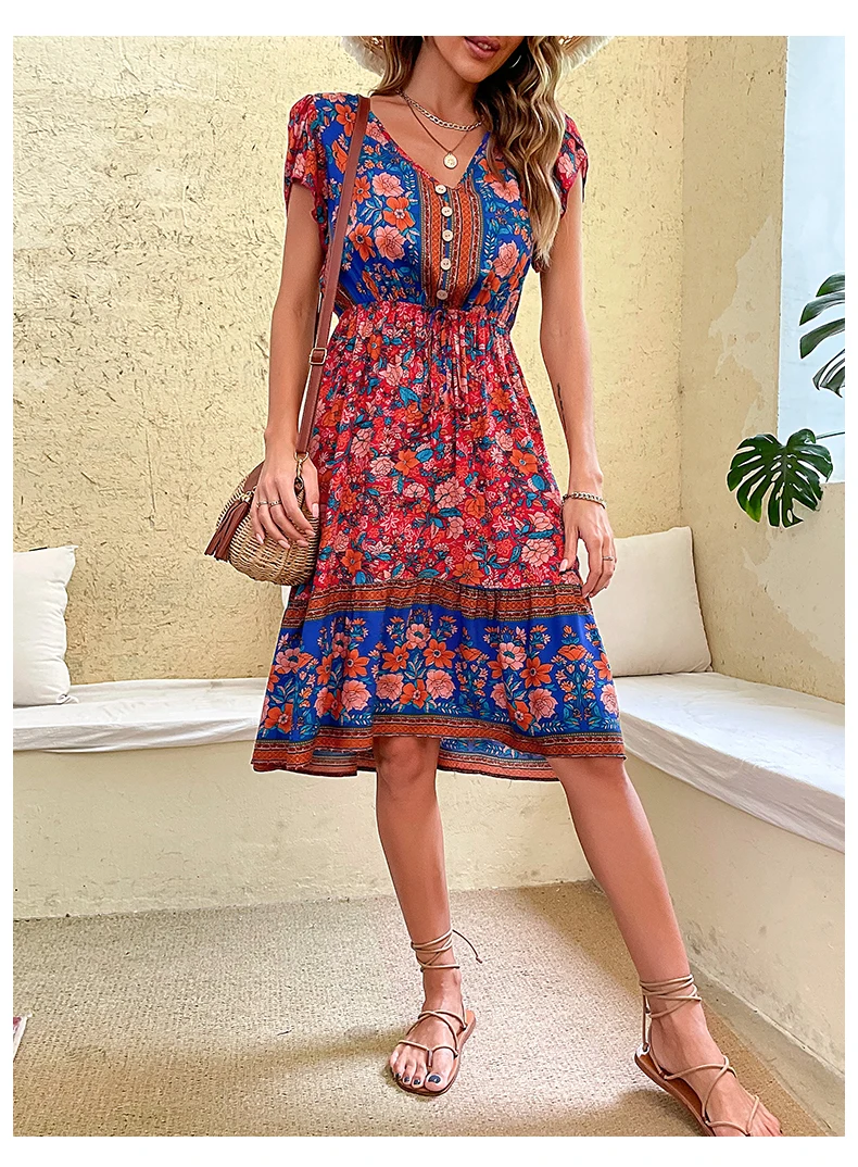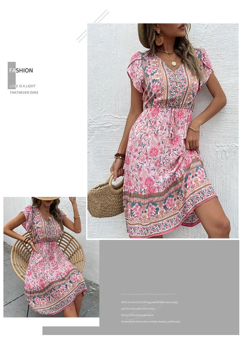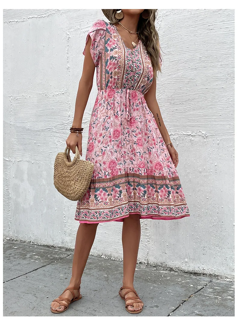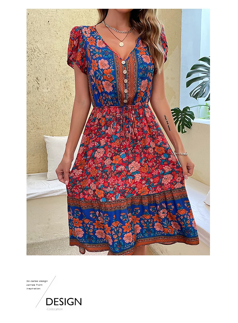 Victoria’s Vogue Boho Floral Print Dress V Neck Short Sleeve Drawstring Waist Loose Flowy Bohemian Midi Dresses for Women Fashion