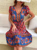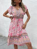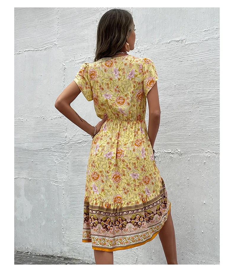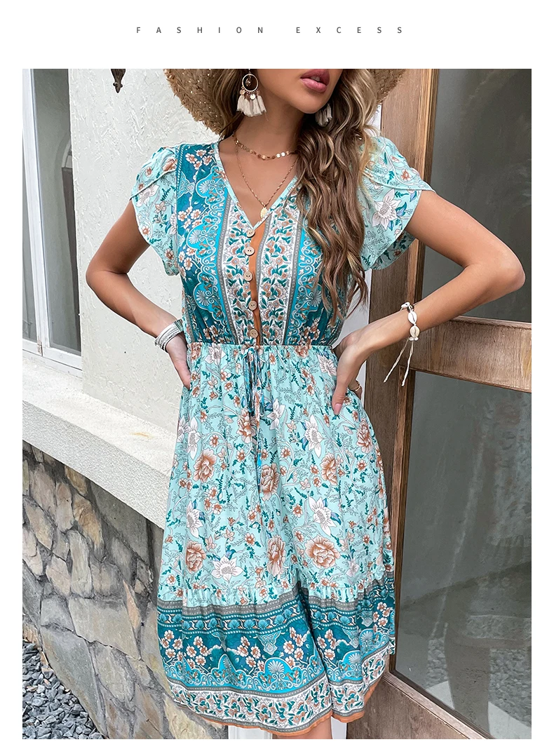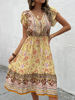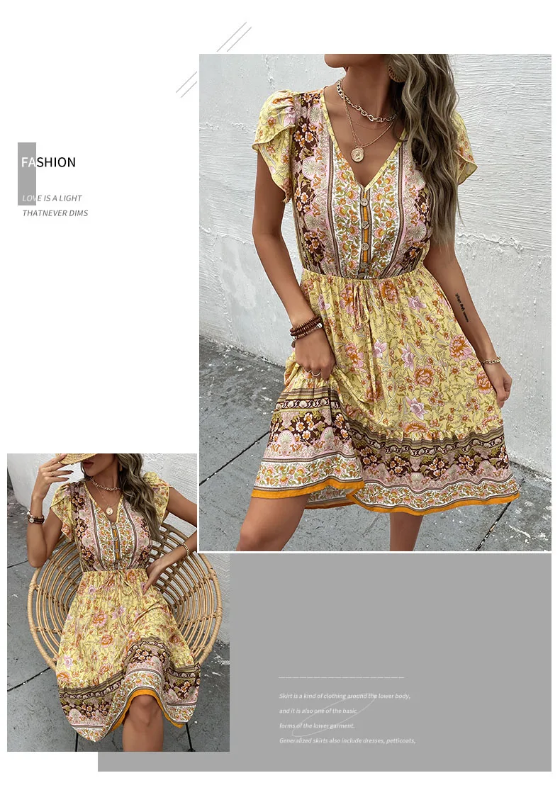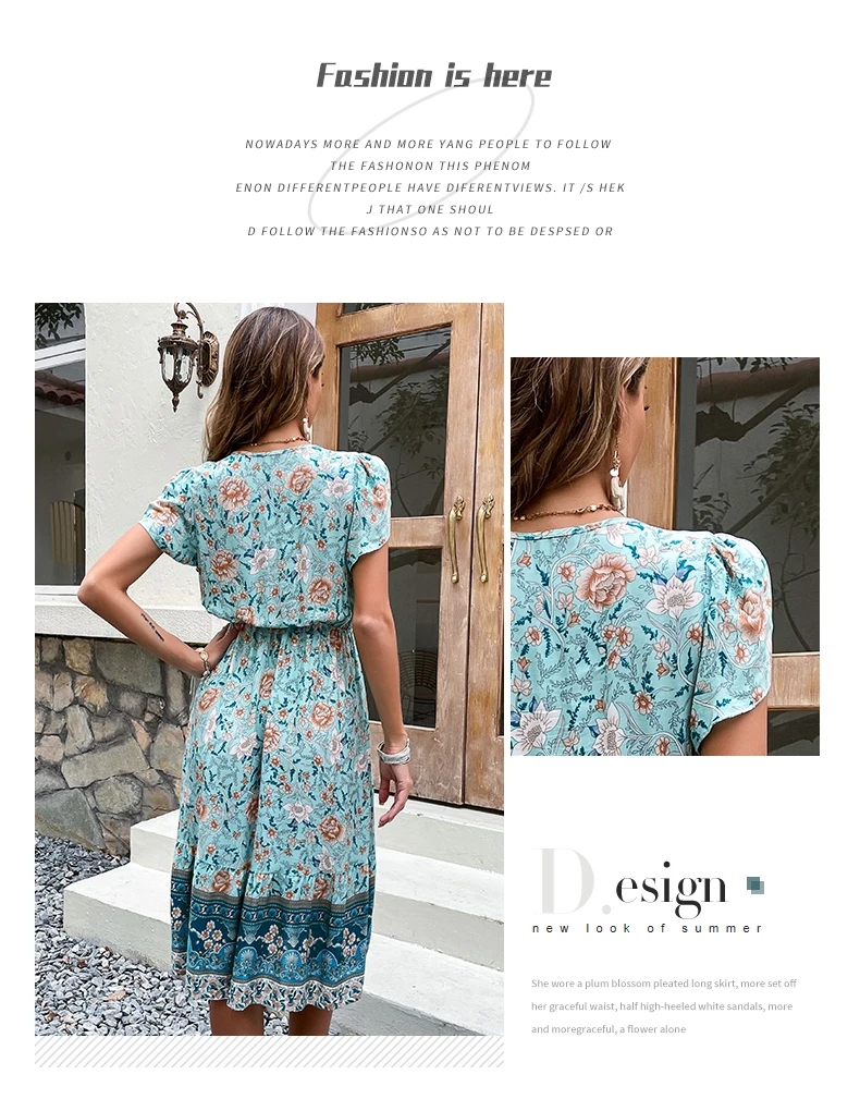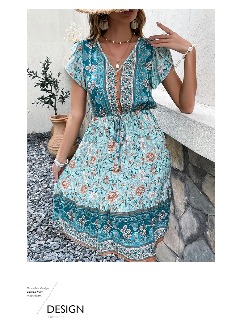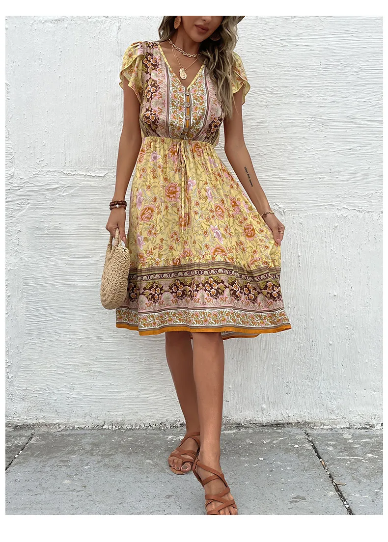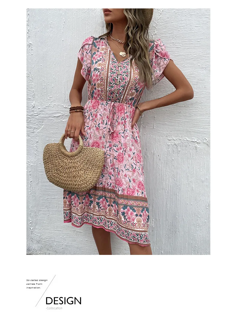Victoria’s Vogue Boho Floral Print Dress V Neck Short Sleeve Drawstring Waist Loose Flowy Bohemian Midi Dresses for Women Fashion
