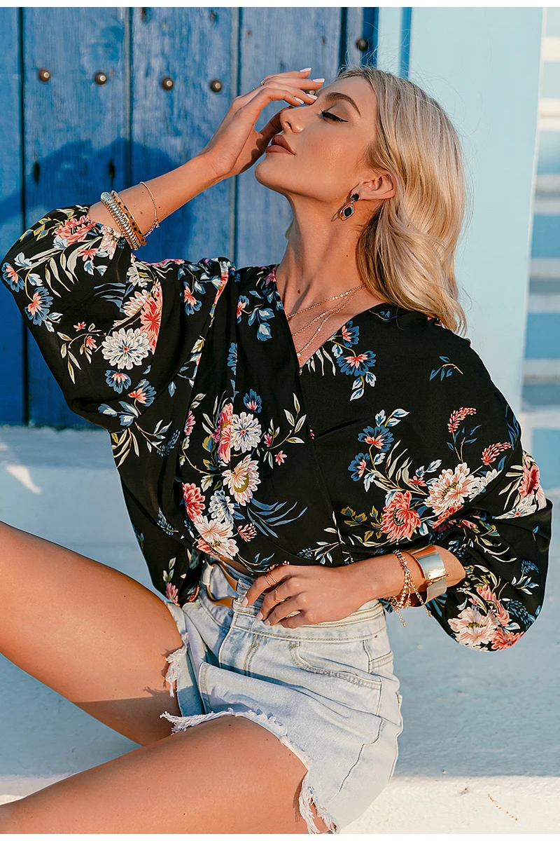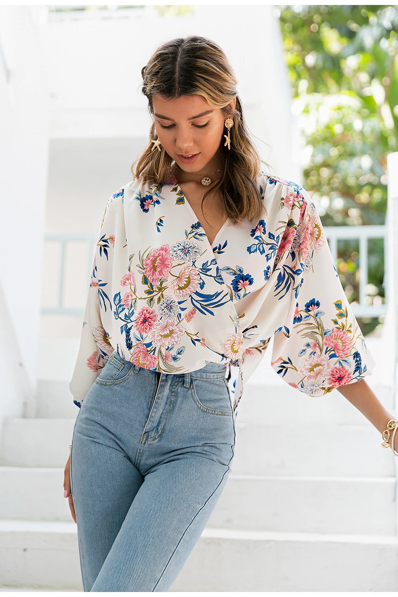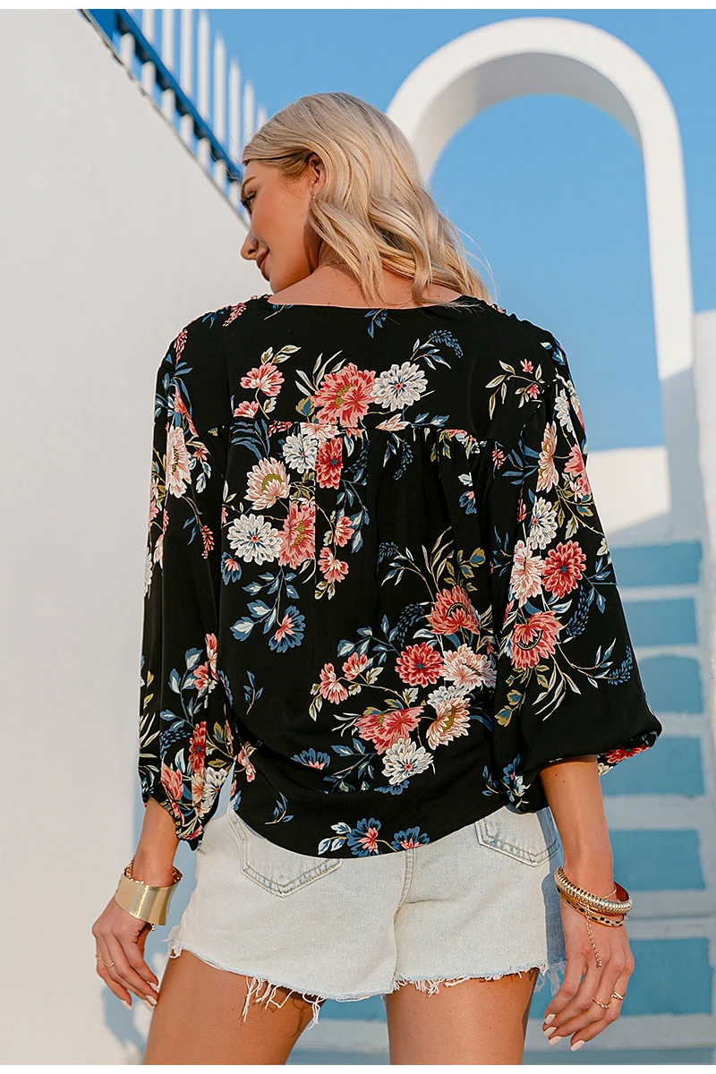 victoria’s vogue Casual printed women blouse Loose Summer puff sleeve V-neck floral top Fashion holiday style mid-sleeve female blouse