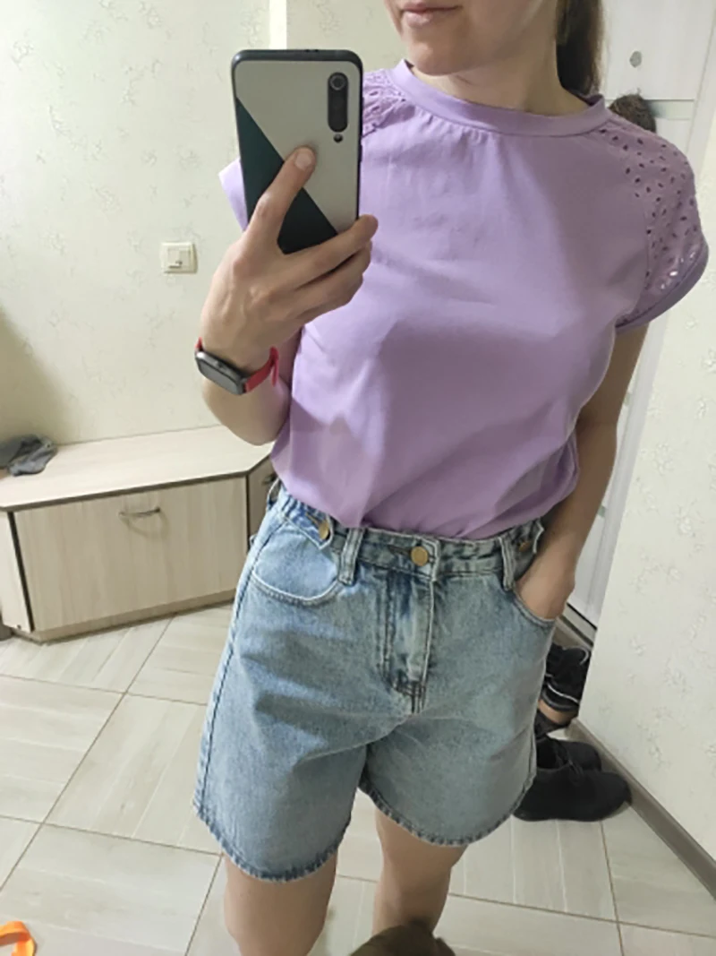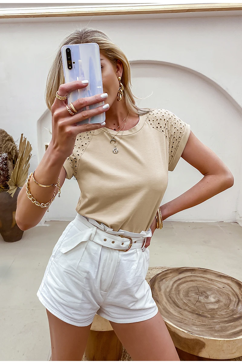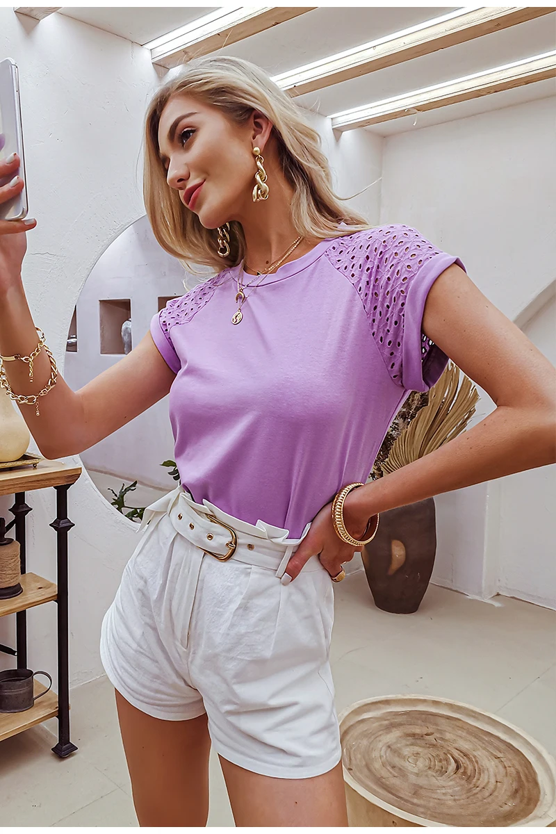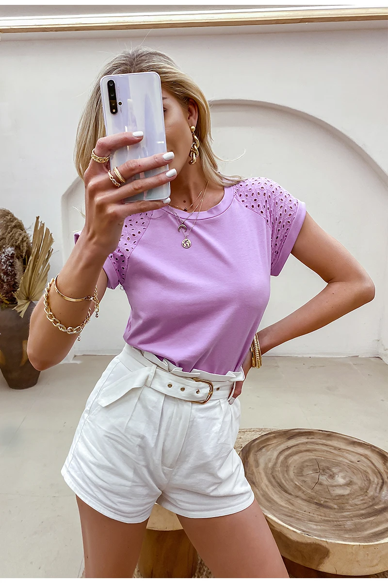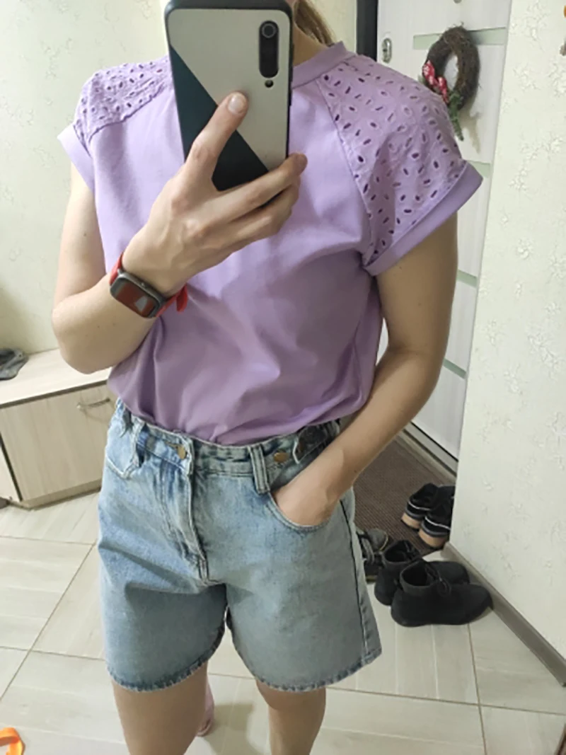 victoria’s vogue Casual solid Lace stitching cotton women T-shirt summer Hollow out sleeves o-neck female tops leisure Basic T-shirt new