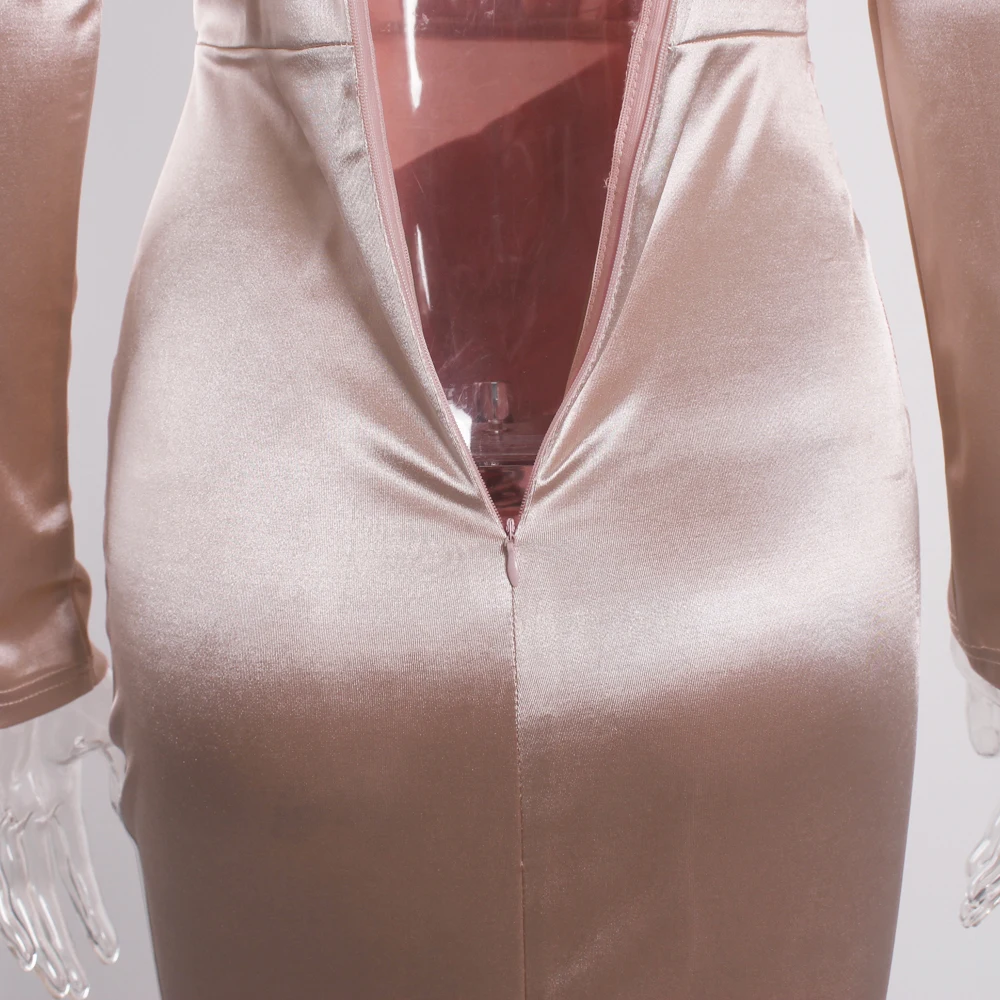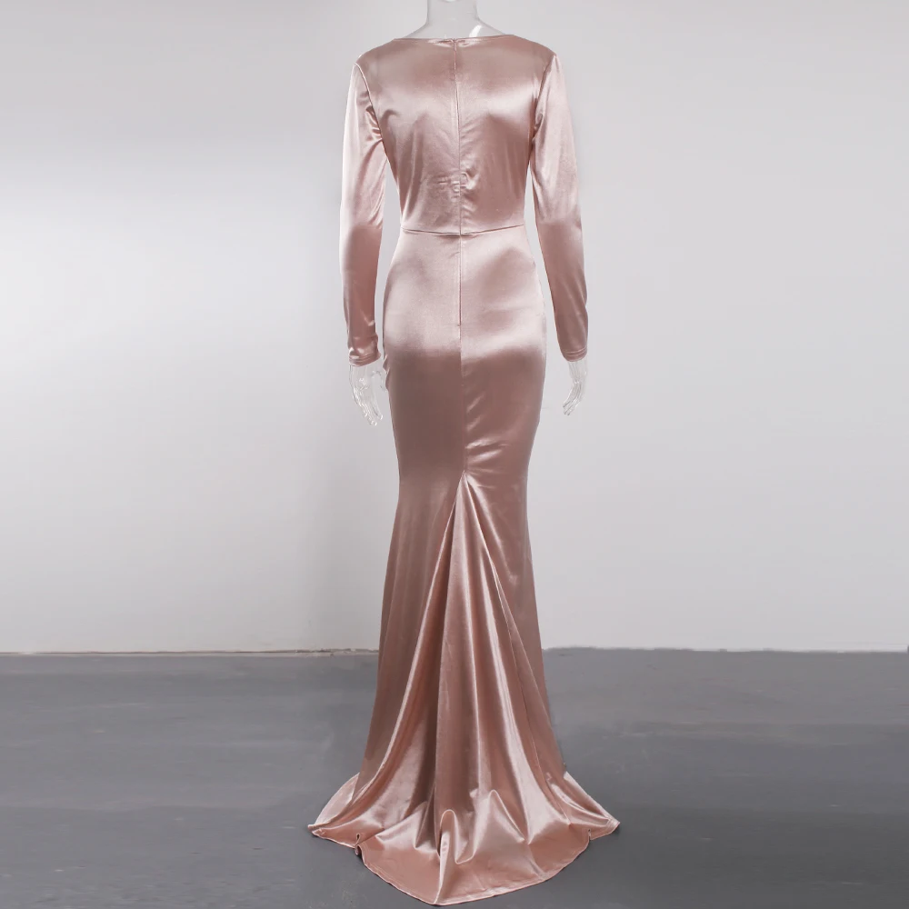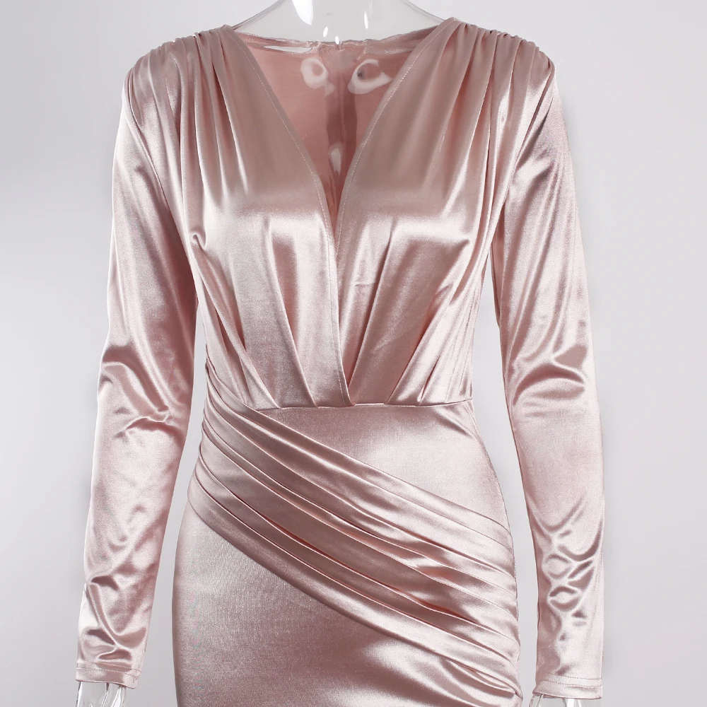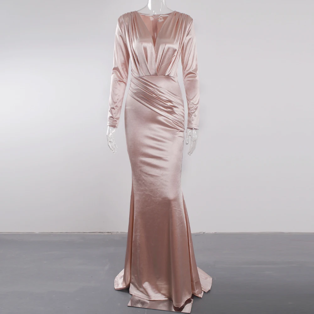 victoria’s vogue Deep V Neck Full Sleeved Light Pink Pleated Long Evening Party Dress Stretch Satin Floor Length Event Gown Prom Robe