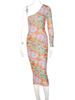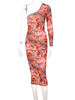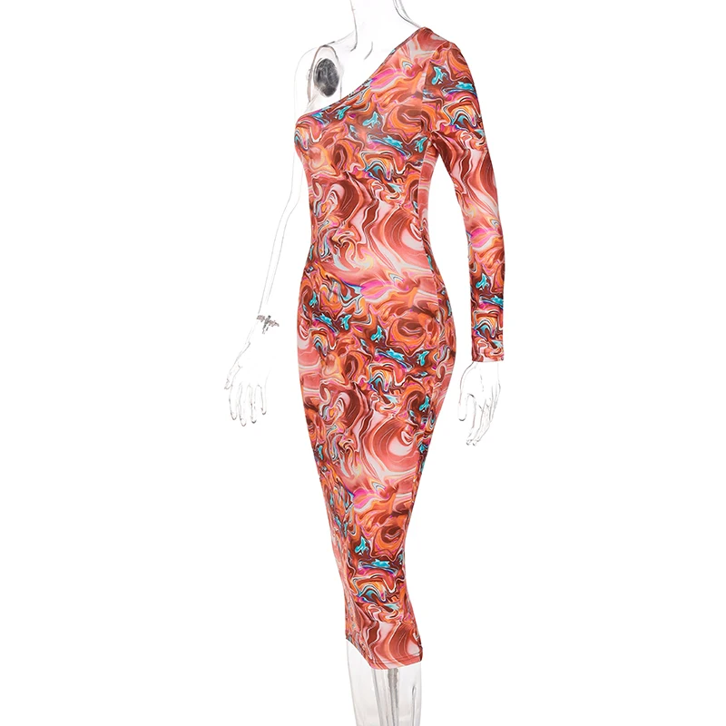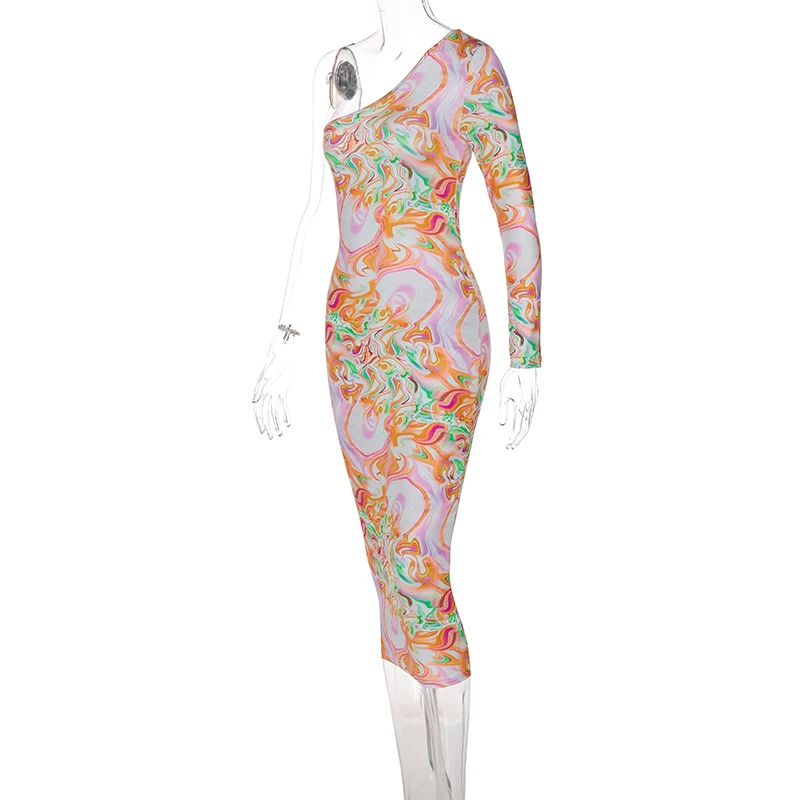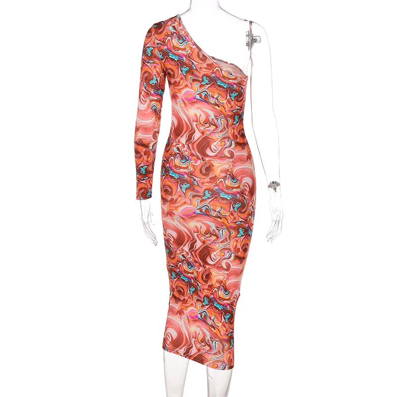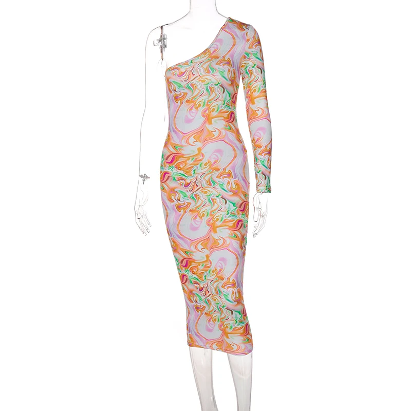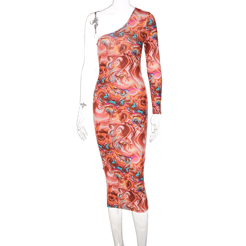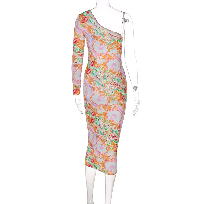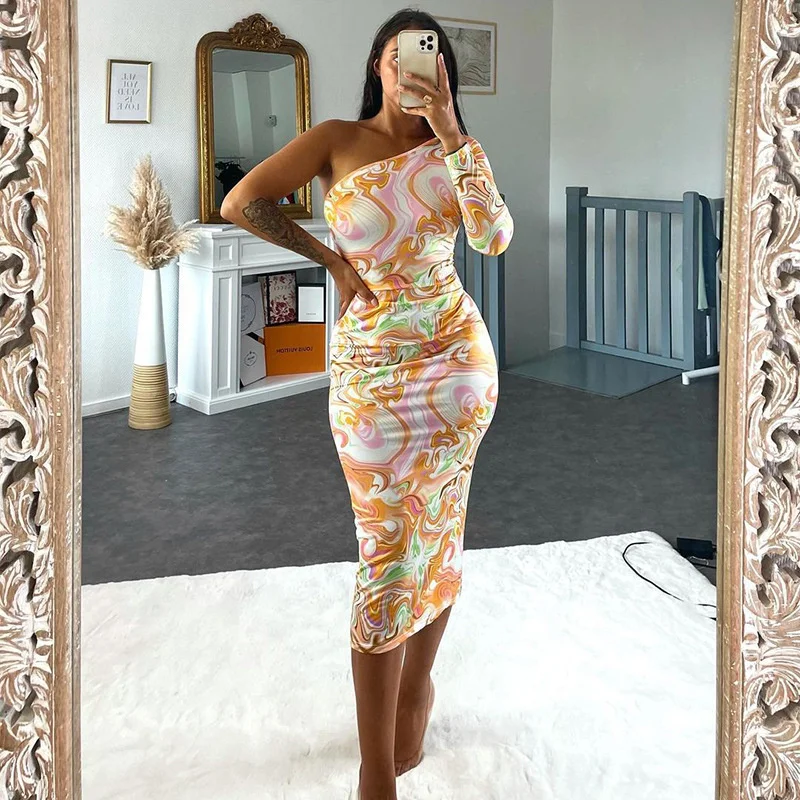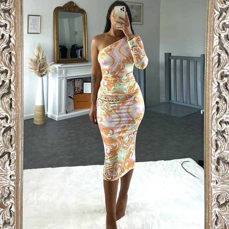 victoria’s vogue Diagonal Collar Print Dresses Women 2022 Spring Casual Elegant Female Overalls Sexy Single Shoulder Bodycon Midi Dress