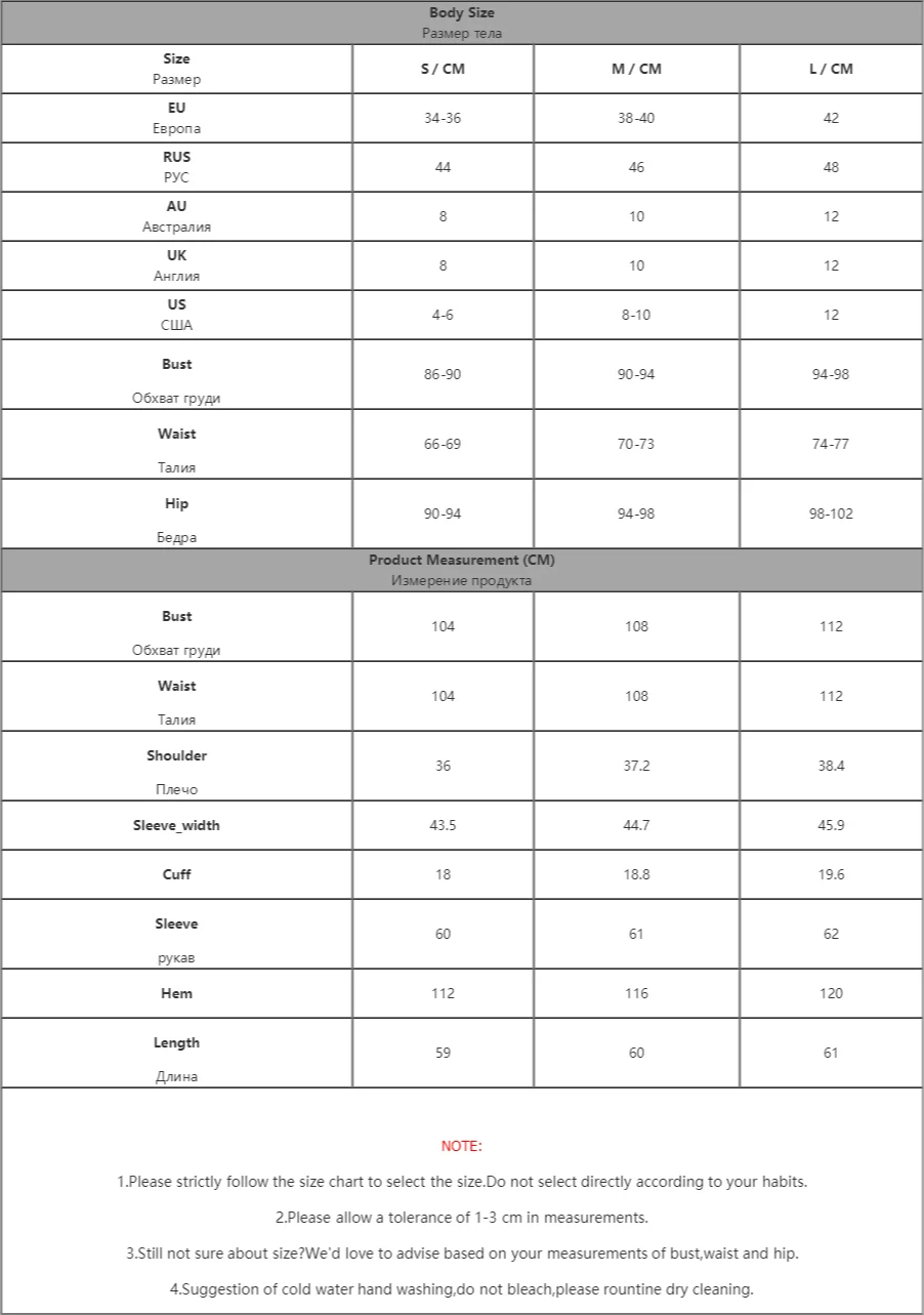 NOTE: 1.Please strictly follow the size chart to select the size.Do not select directly according to your habits. 2.Please allow a tolerance of 1-3 cm in measurements. 3.Still not sure about size?We’d love to advise based on your measurements of bust,waist and hip. 4.Suggestion of cold water hand washing,do not bleach,please rountine dry cleaning. |