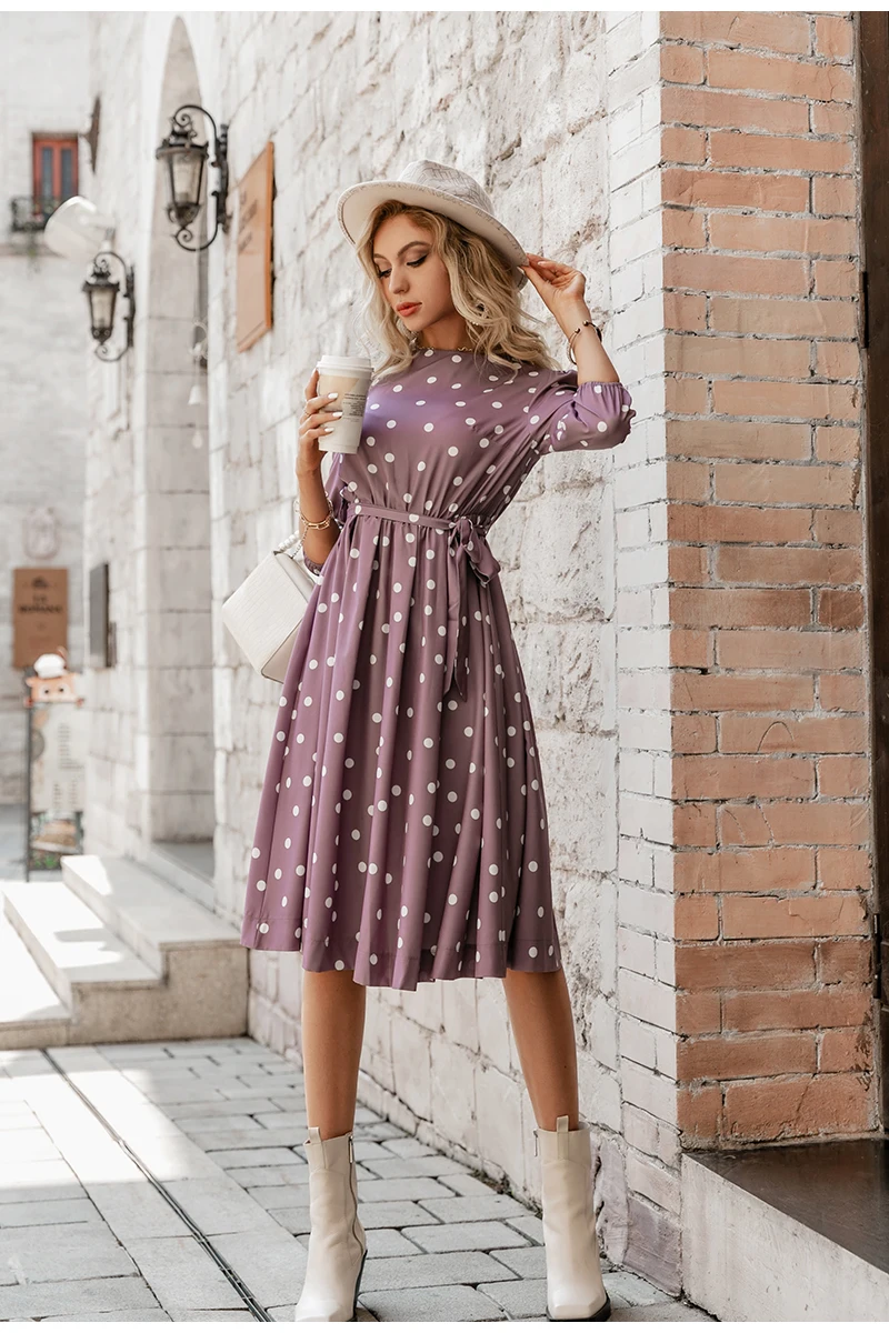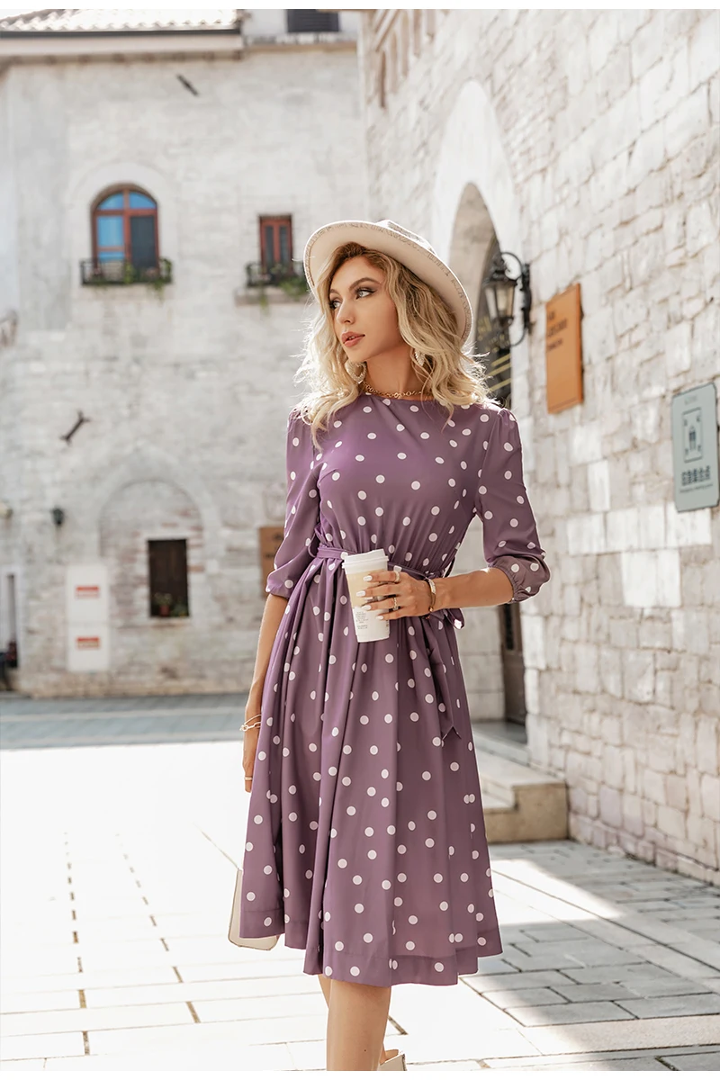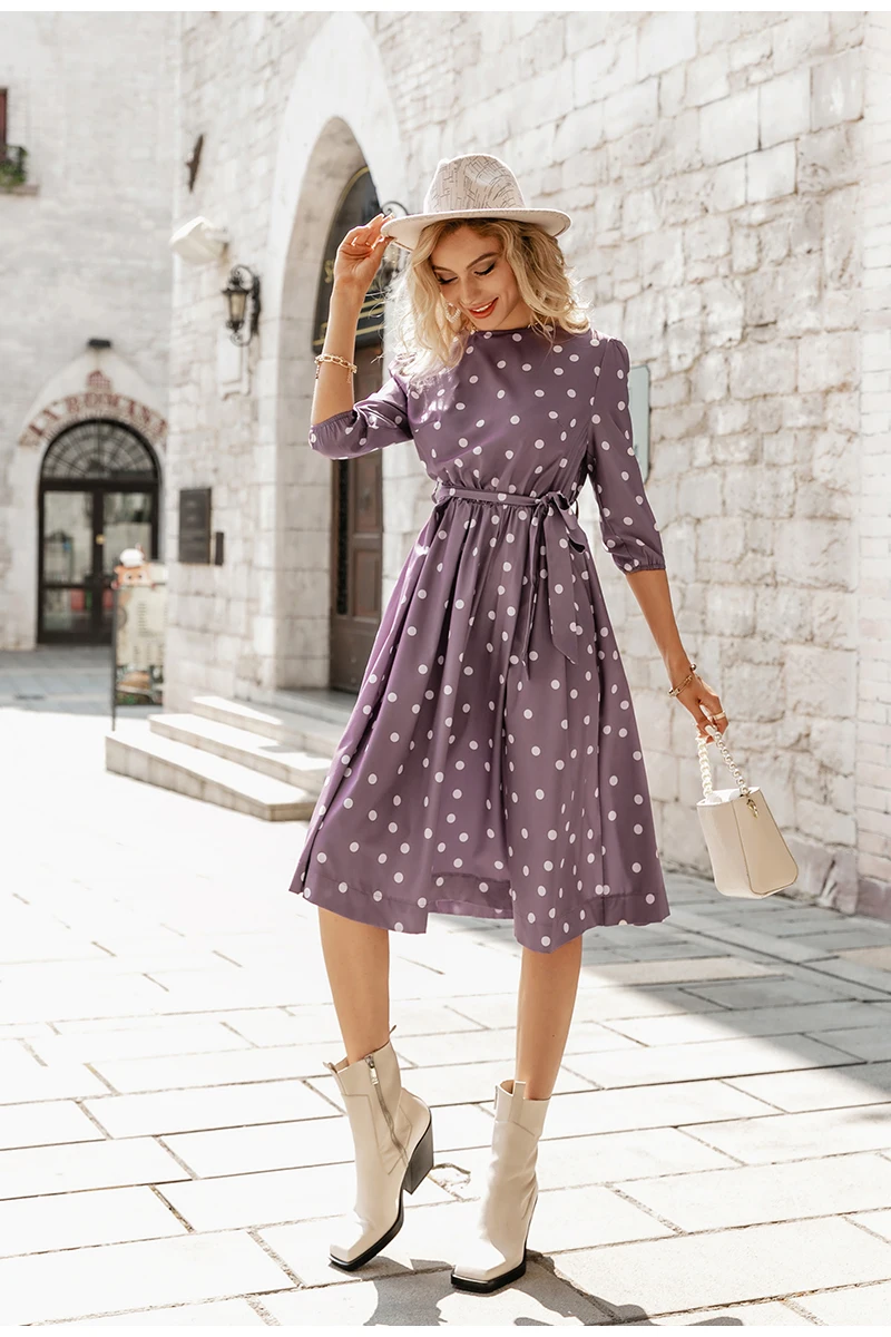 victoria’s vogue Elegant A-line polka dot women dress autumn Office lady o-neck belt women midi dresses Half sleeve female purple vestido