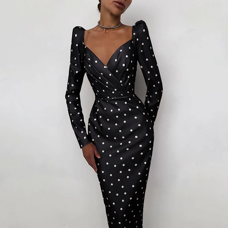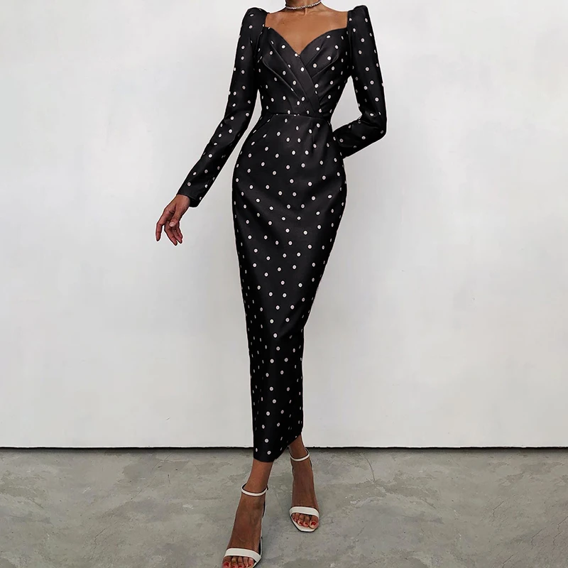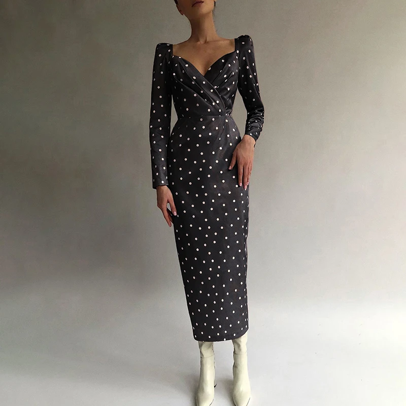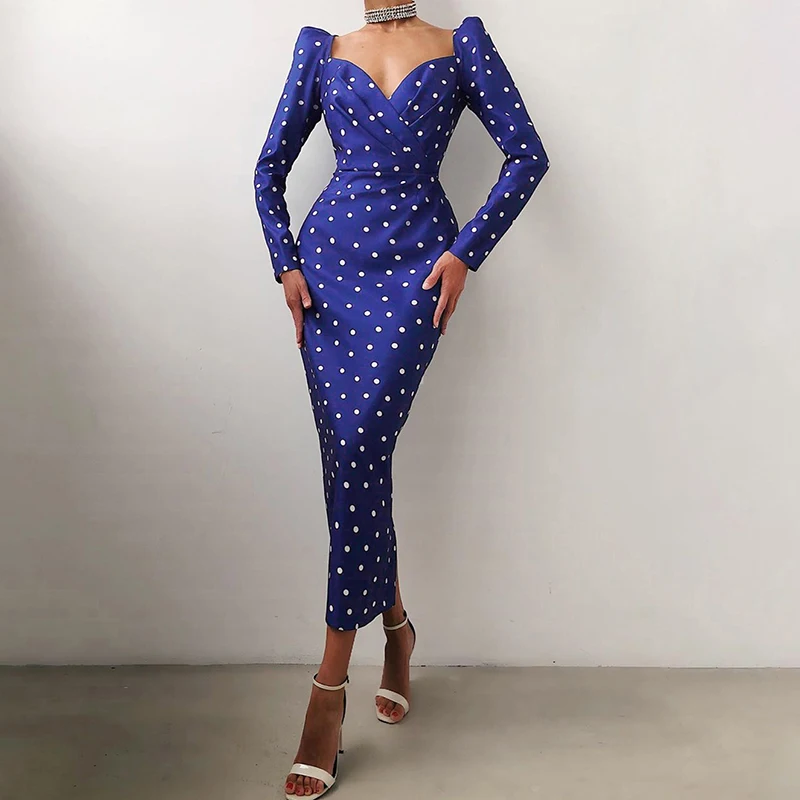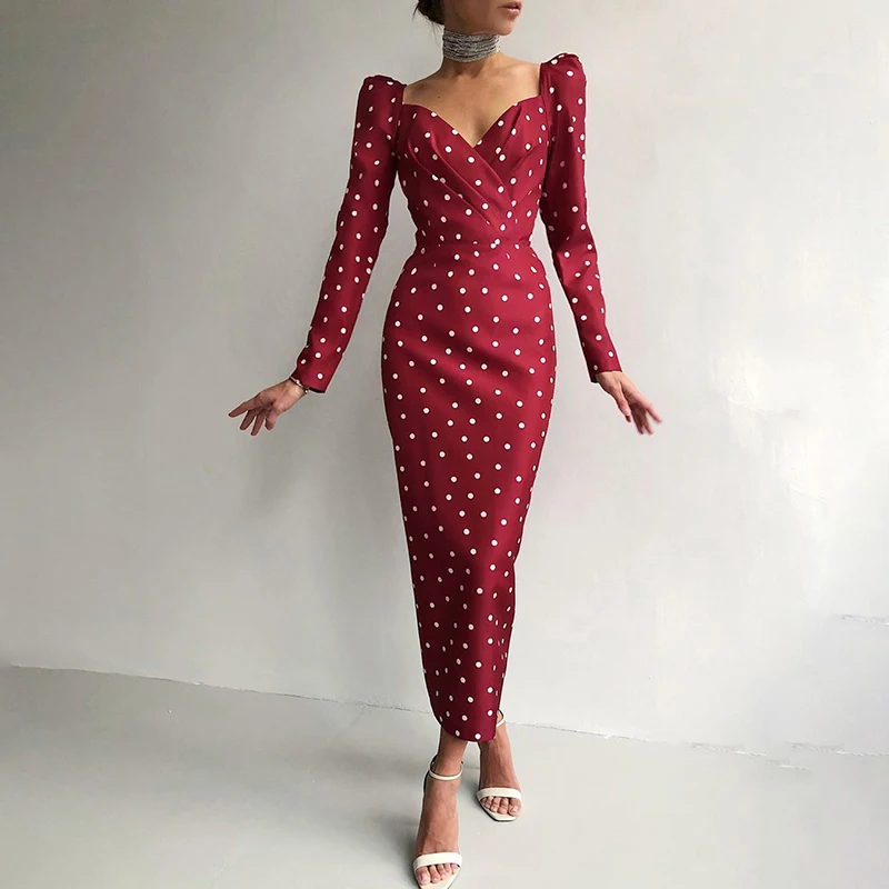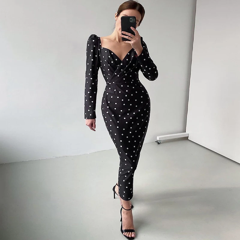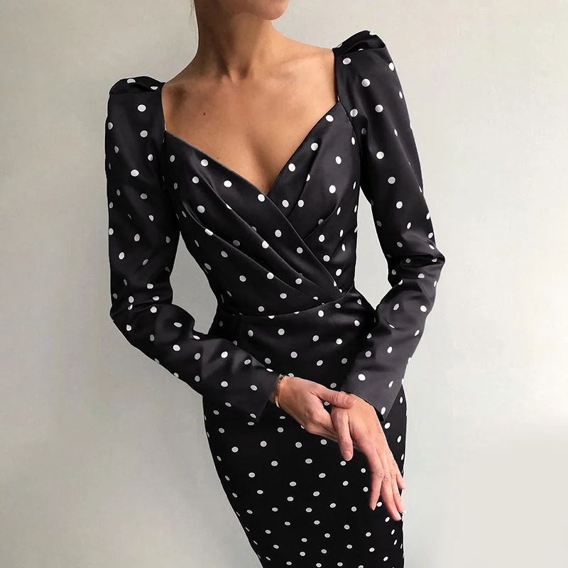 victoria’s vogue Elegant Party Women Dress Mid V Neck Long Sleeve Pencil Dress Hight Waist Casual Office Lady Dots Print Puff Sleeve