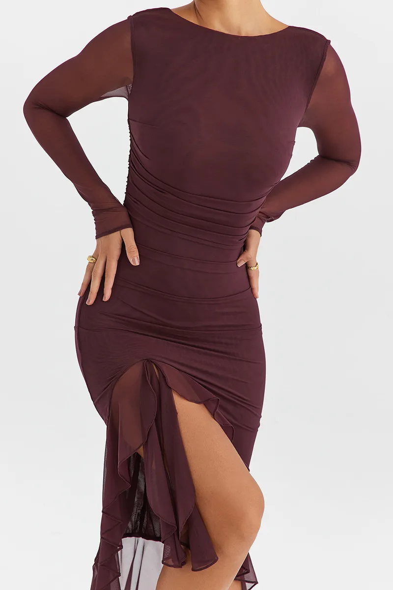 Victoria’s Vogue Elegant Ruffle Ruched Midi Dress For Women Robe Sheer Long Sleeve Backless Irregular Club Party Sexy Dress Vestido