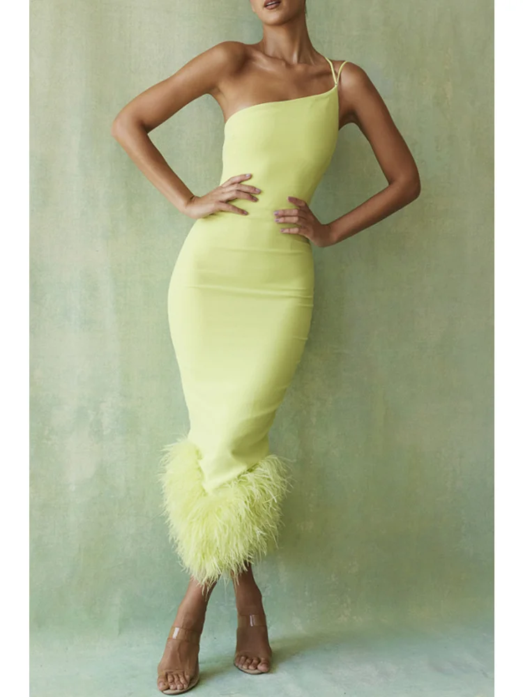 Victoria’s Vogue Elegant Spaghetti Strap Feather Midi Dress For Women Robe Fashion Sexy Backless Bodycon Club Party Dress Vestido/