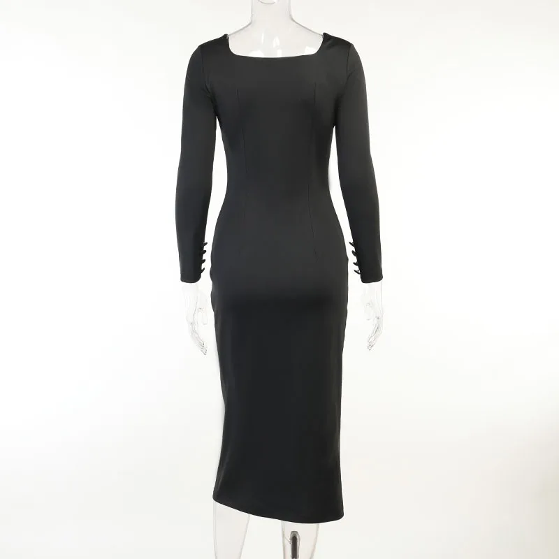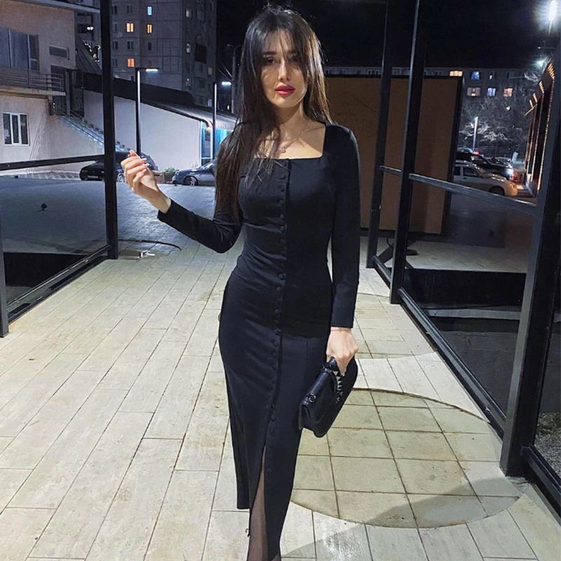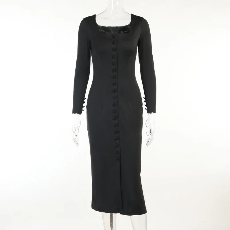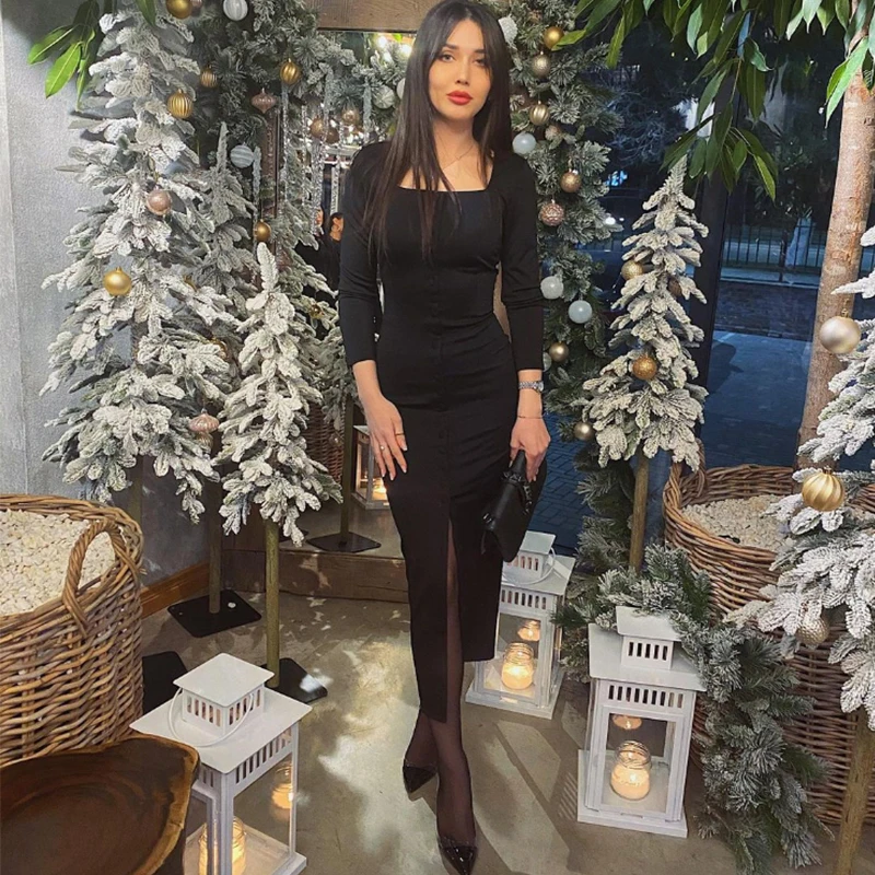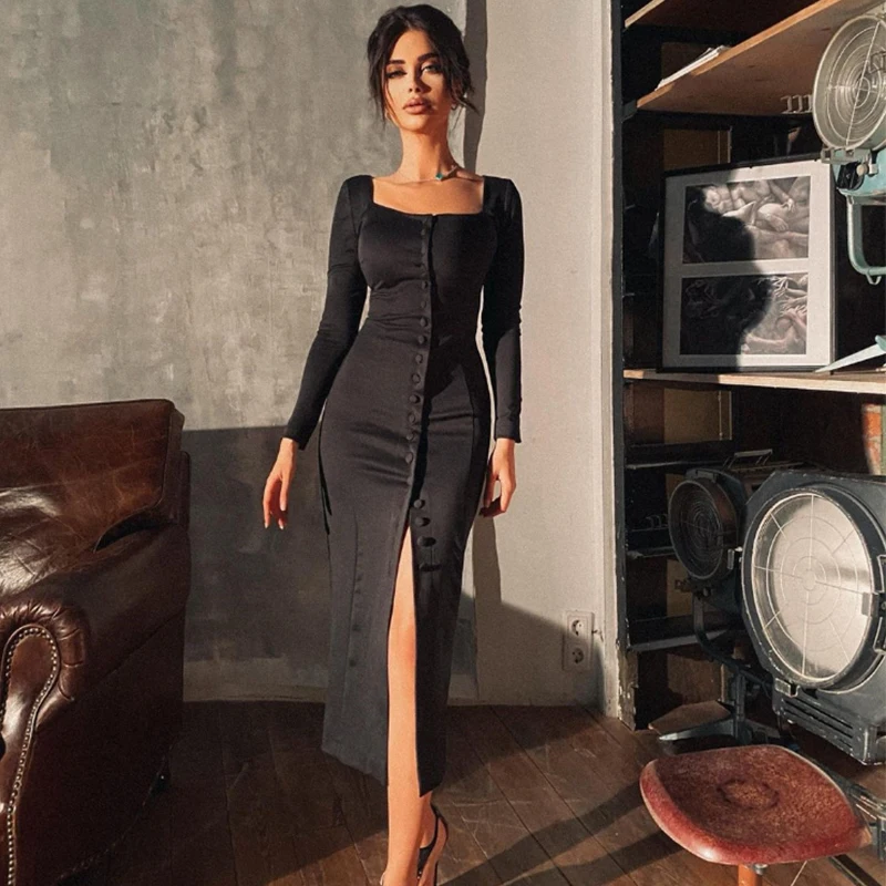 victoria’s vogue Fashion Midi Calf Dress For Women Square Collar Long Sleeve Button Elegant Sexy Casual Split Fashion Black Dress 2022