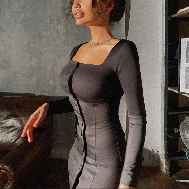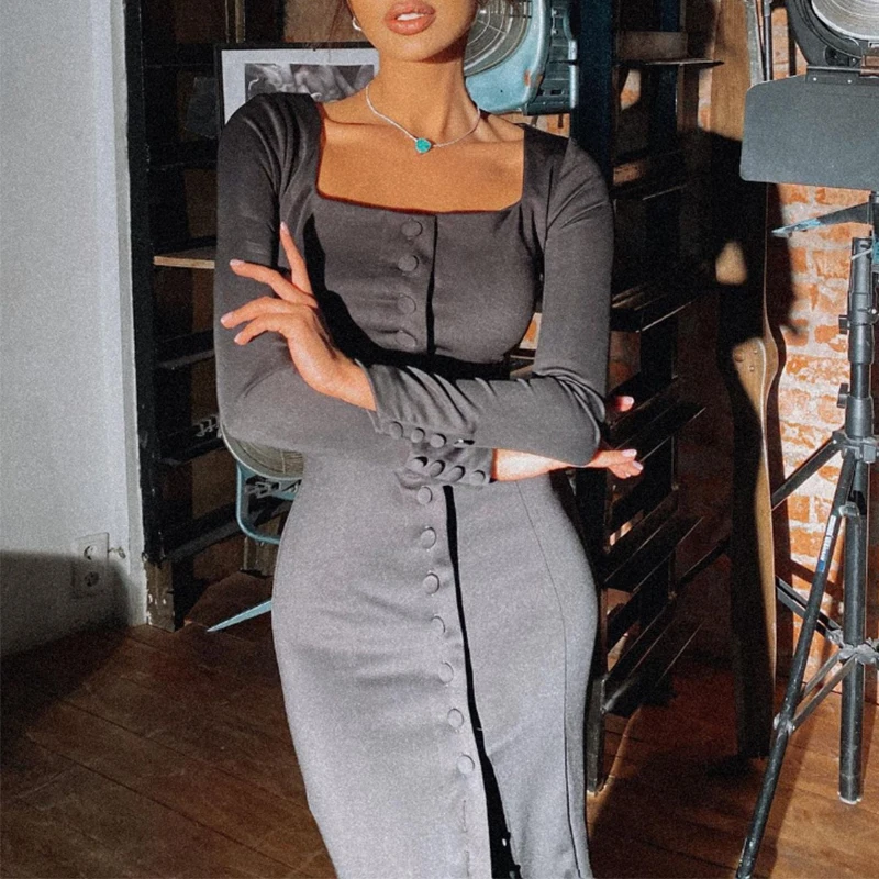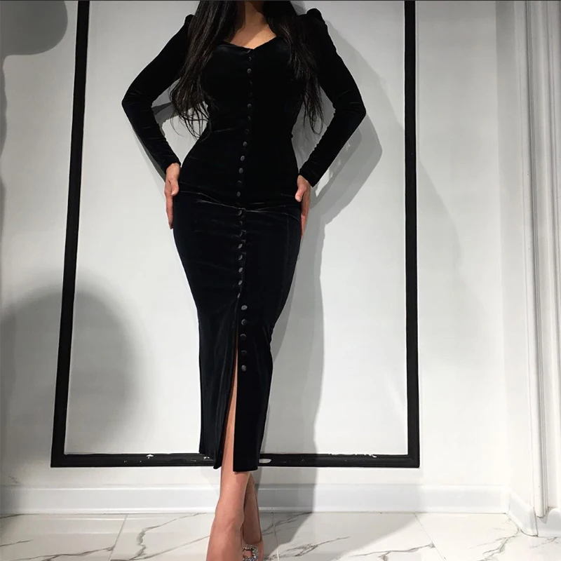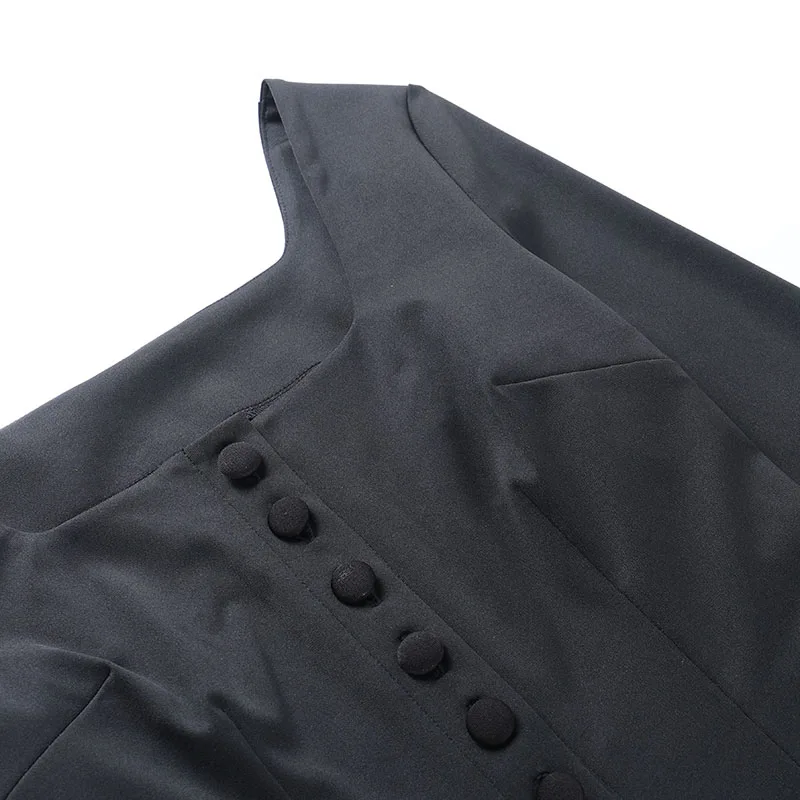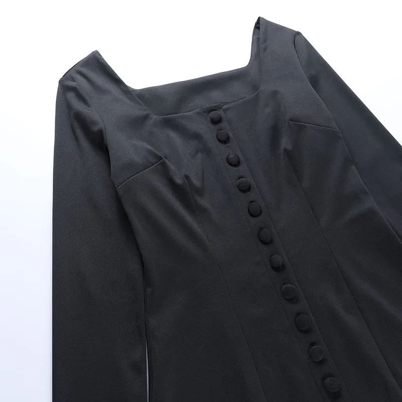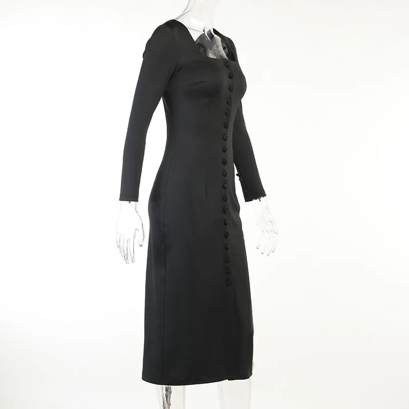 victoria’s vogue Fashion Midi Calf Dress For Women Square Collar Long Sleeve Button Elegant Sexy Casual Split Fashion Black Dress 2022