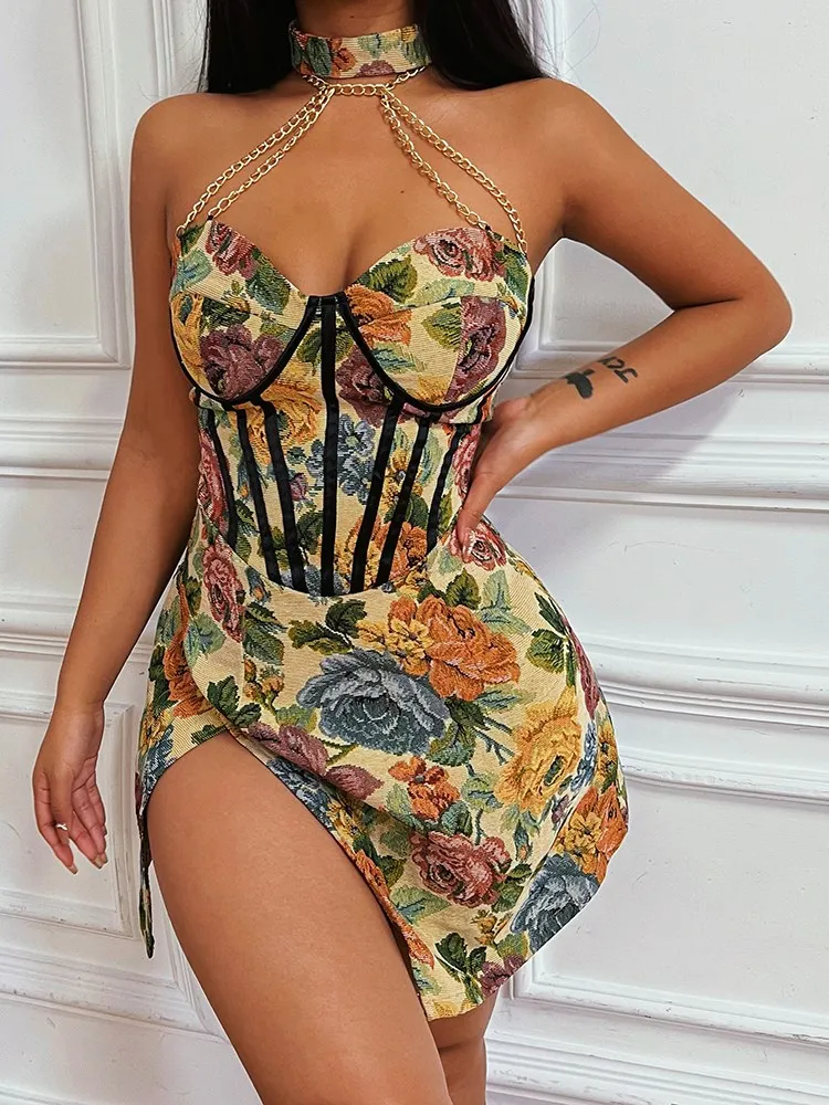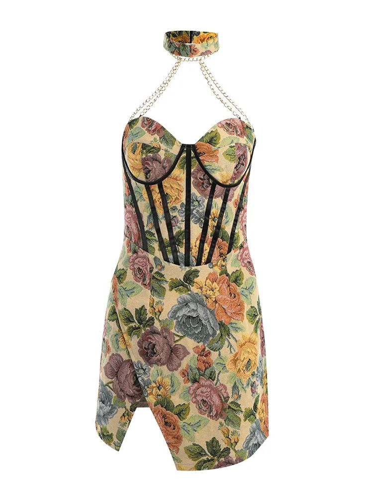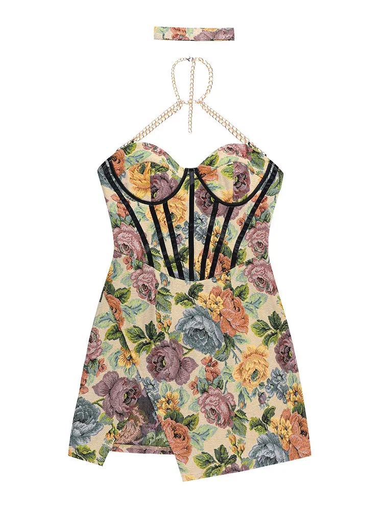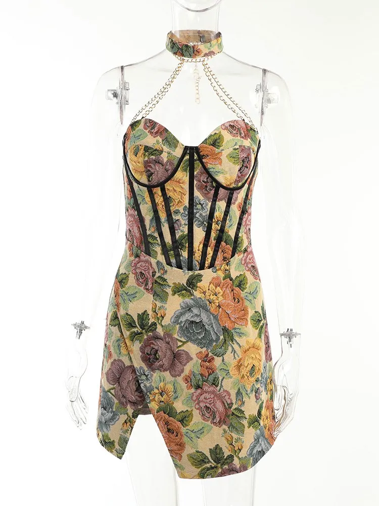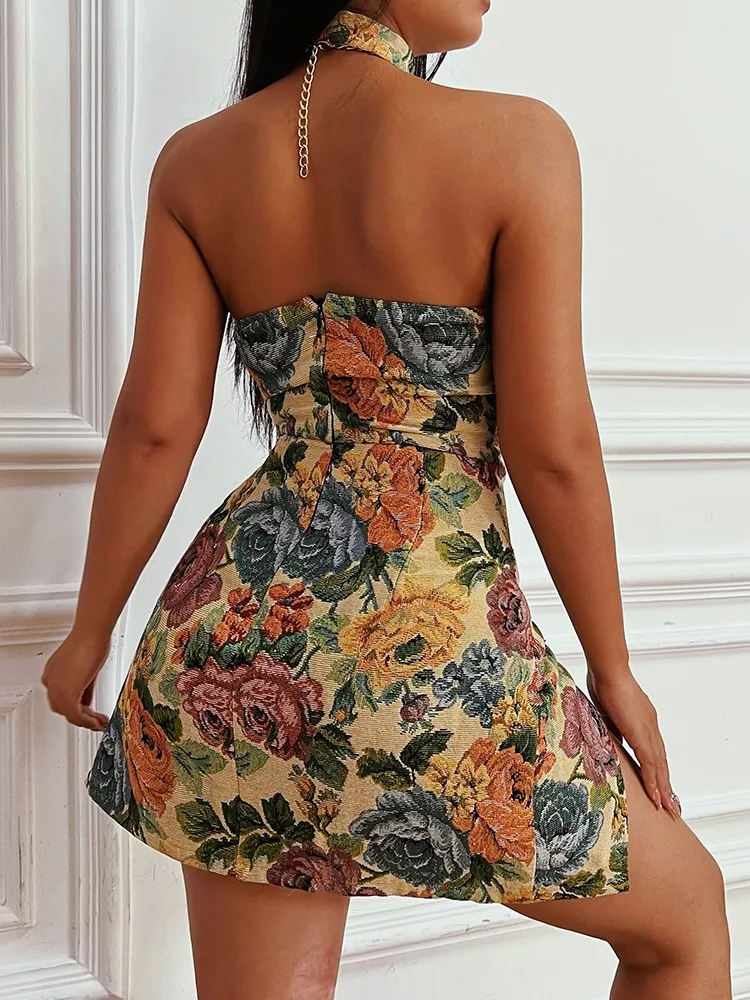 victoria’s vogue Floral Mini Dress Corsets Chain Halter Backless Dress Women Sexy Sleeveless Summer 2022 Streetwear Chic Party Clothes