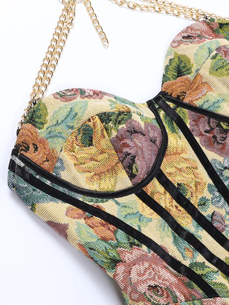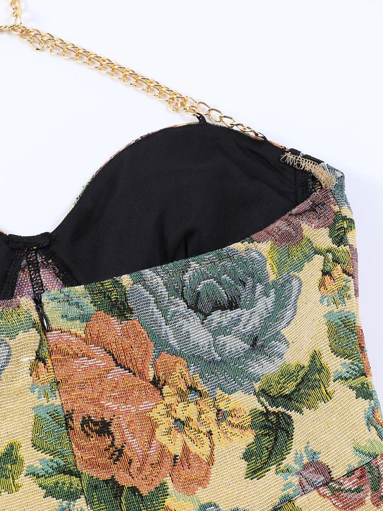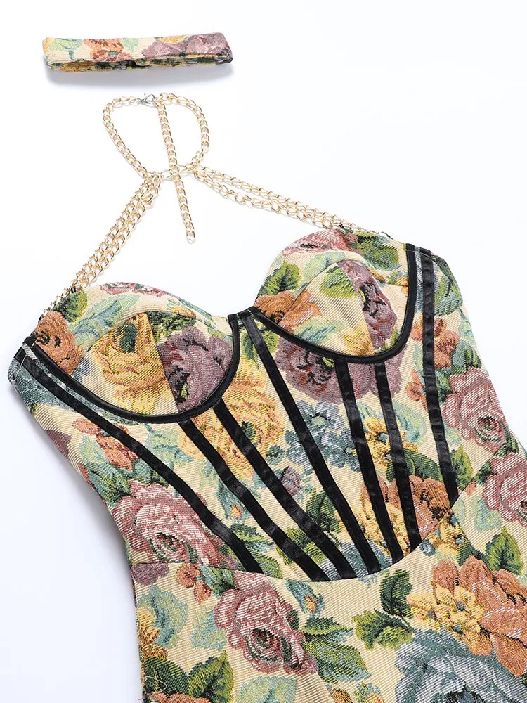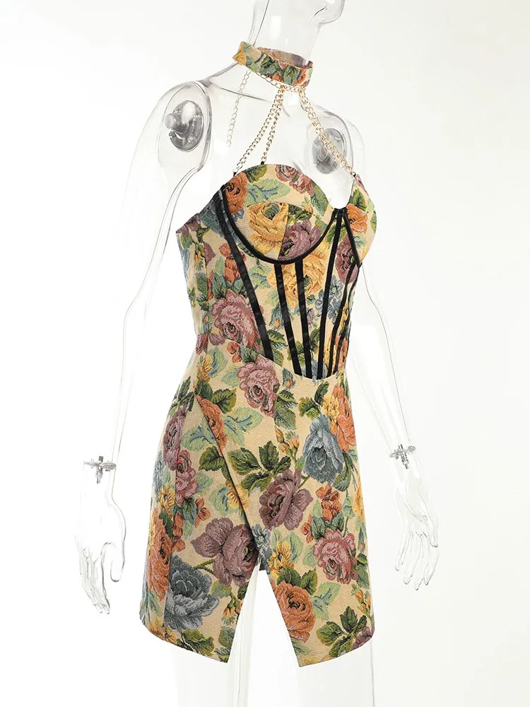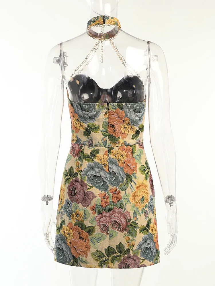 victoria’s vogue Floral Mini Dress Corsets Chain Halter Backless Dress Women Sexy Sleeveless Summer 2022 Streetwear Chic Party Clothes