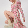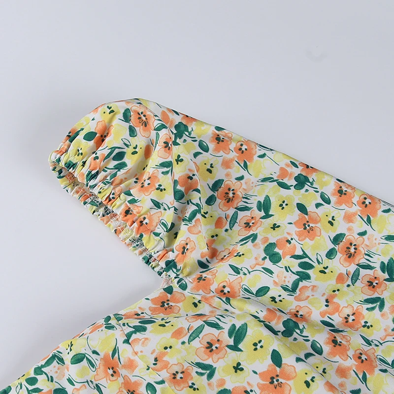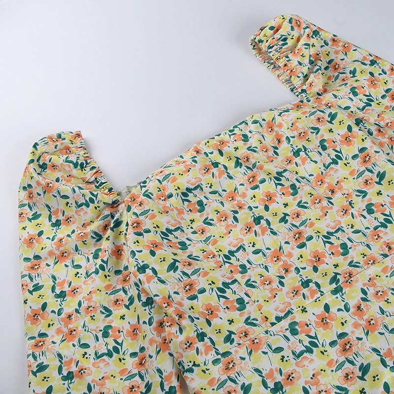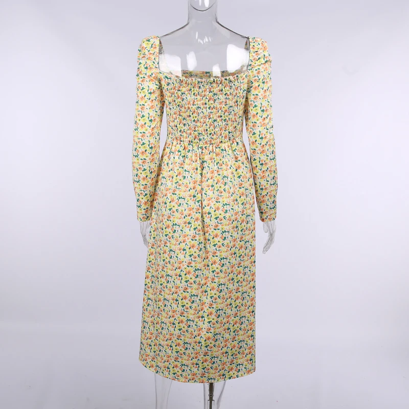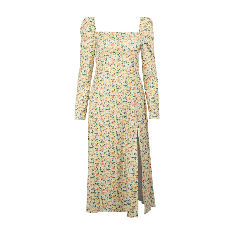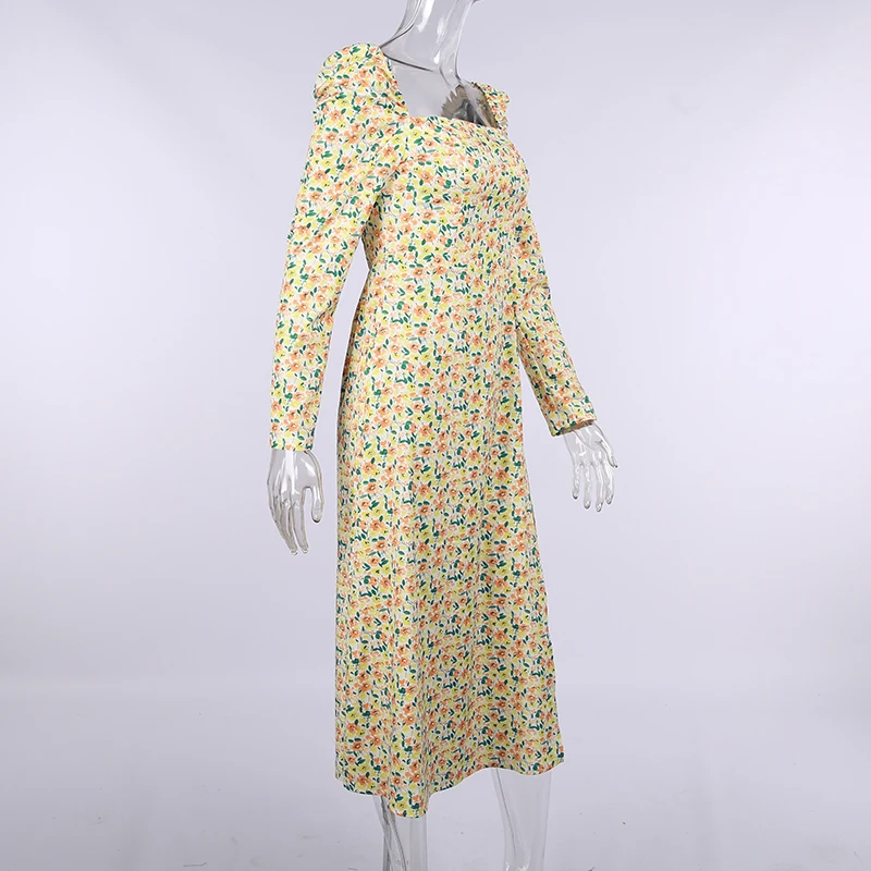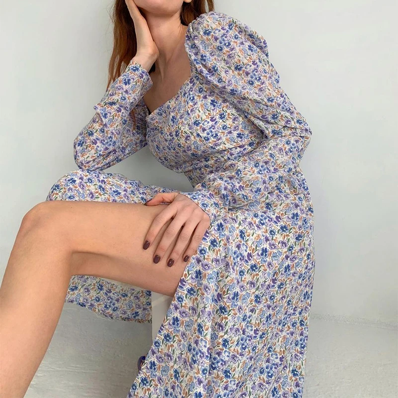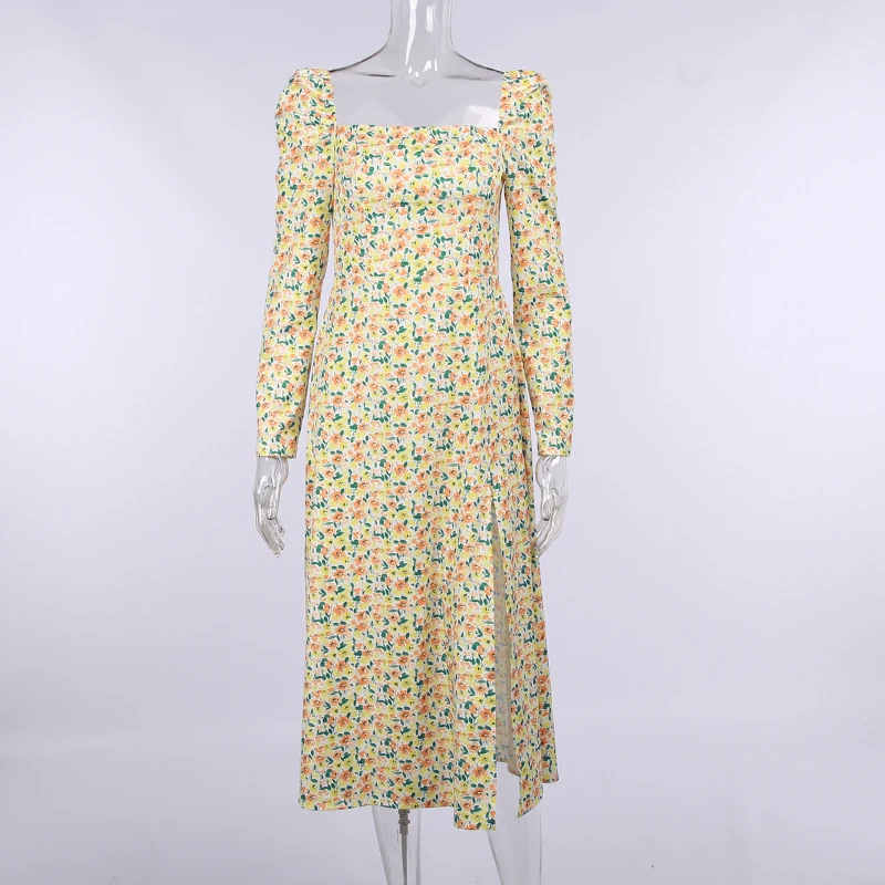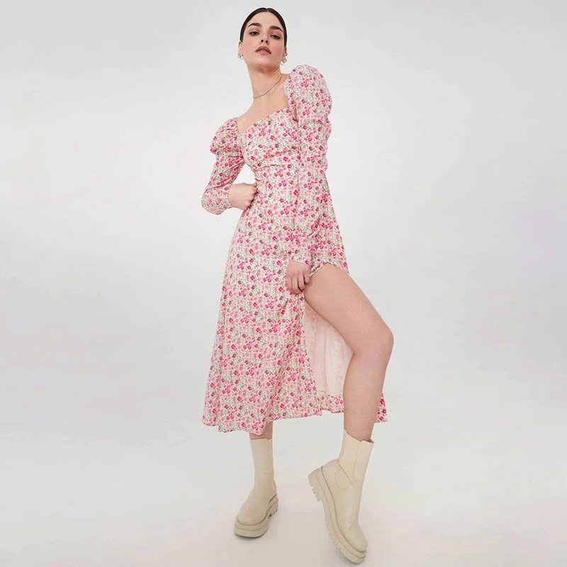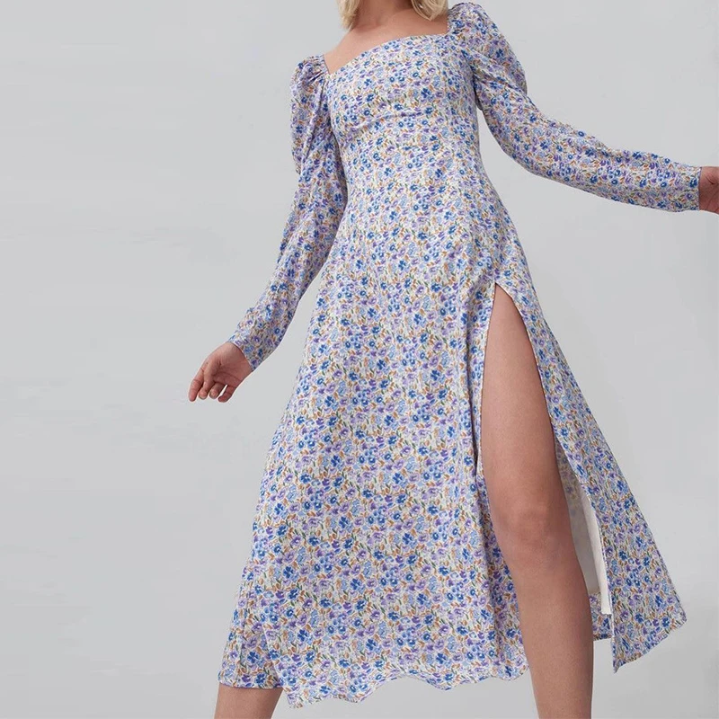 victoria’s vogue Floral Print Midi Dress Women Long Sleeve Puff Sleeve Side Split Lady Elegant Square Collar Casual Floral Long Dresses