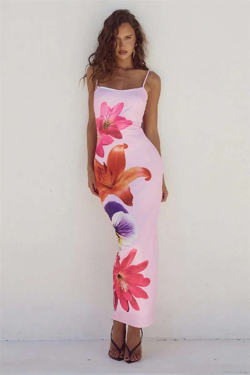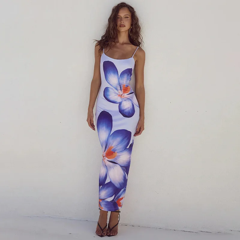 Victoria’s Vogue Floreal Print Long Dress For Women Gown Summer New Spaghetti Strap Sleeveless Backless Bodycon Sexy Midi Dress Elegant