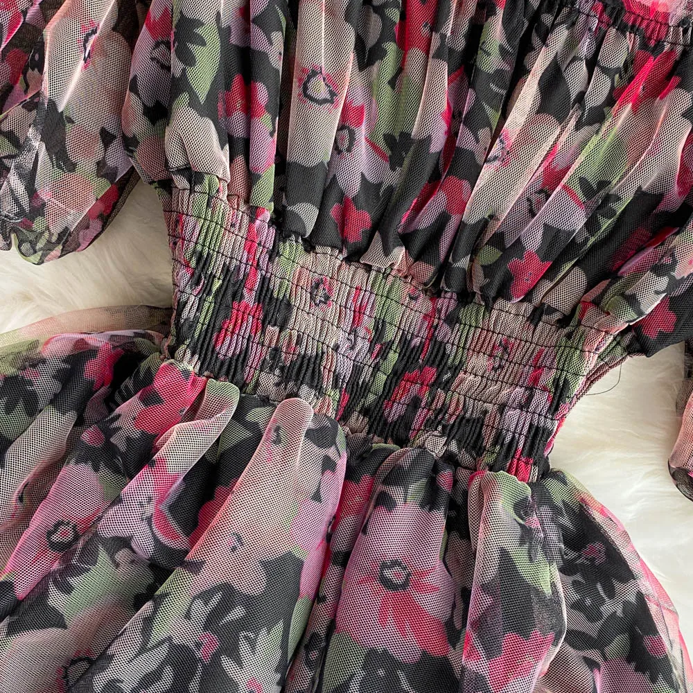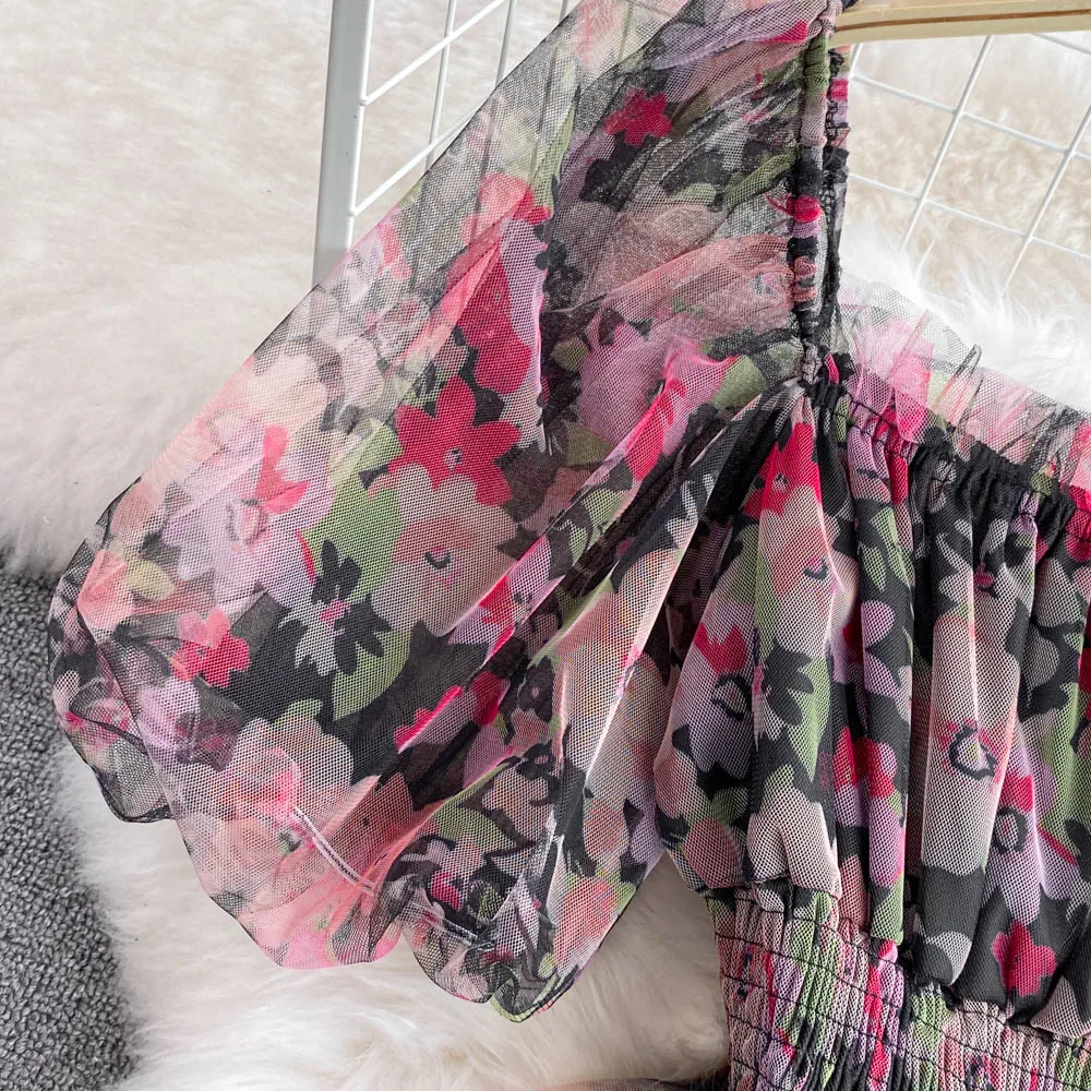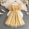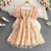Victoria’s Vogue French Chic Floral Printed Cake Dress Woman Square Collar Short Puff Sleeve Sweet Dresses Women Elastic High Waist Dropshipping
