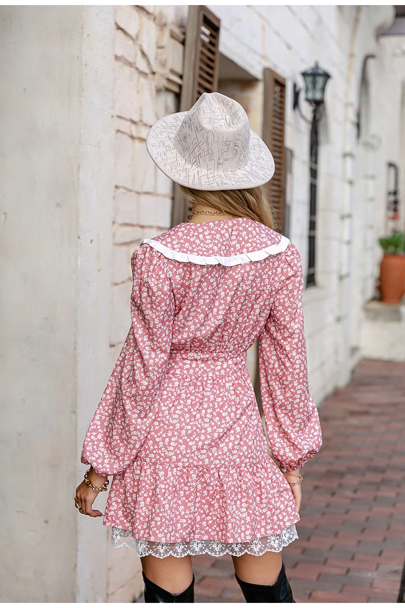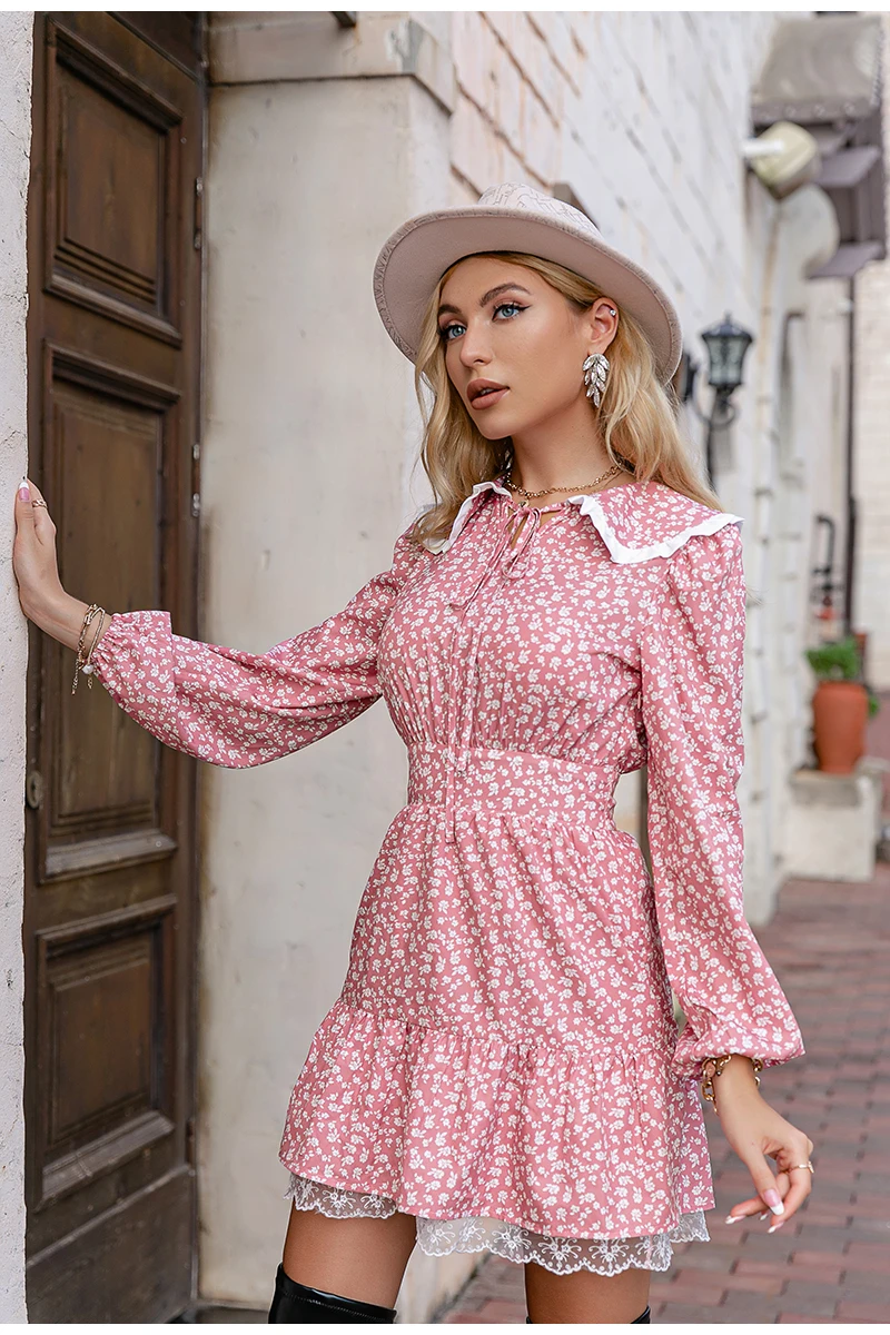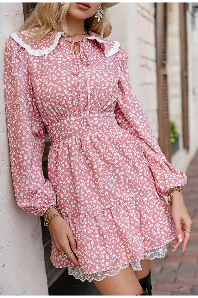 victoria’s vogue Holiday floral lace peter pan collar mini dress women Elegant ruffle high waist lace up vestidos Casual light pink dress