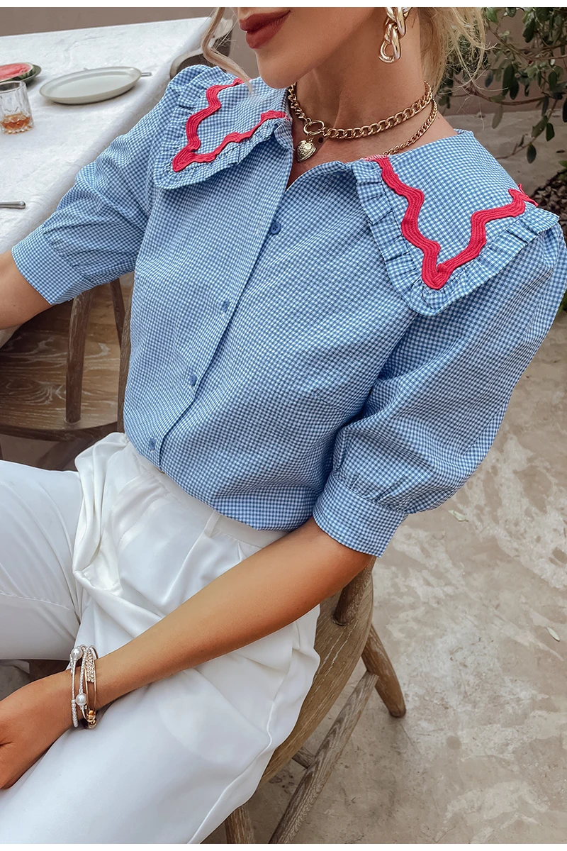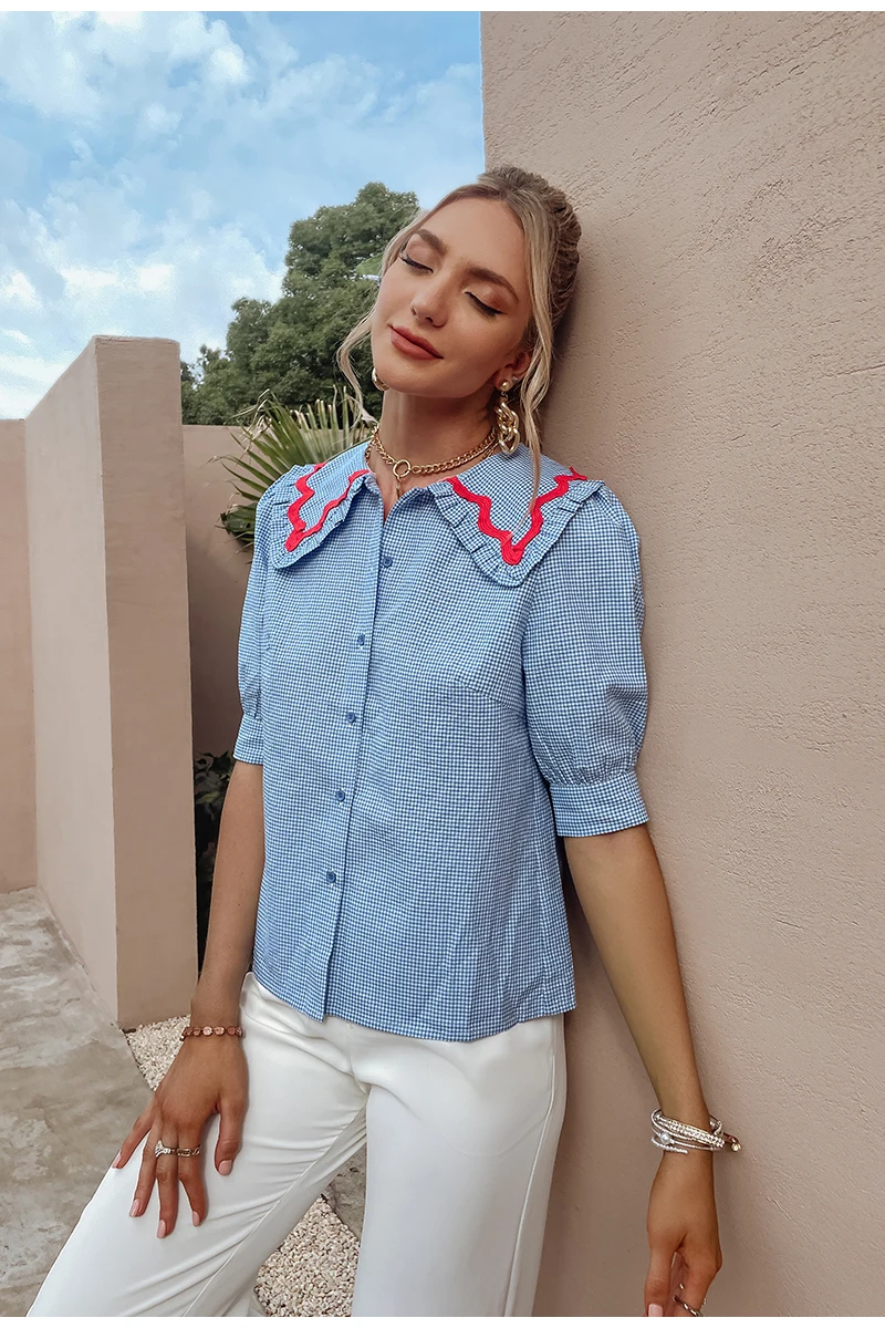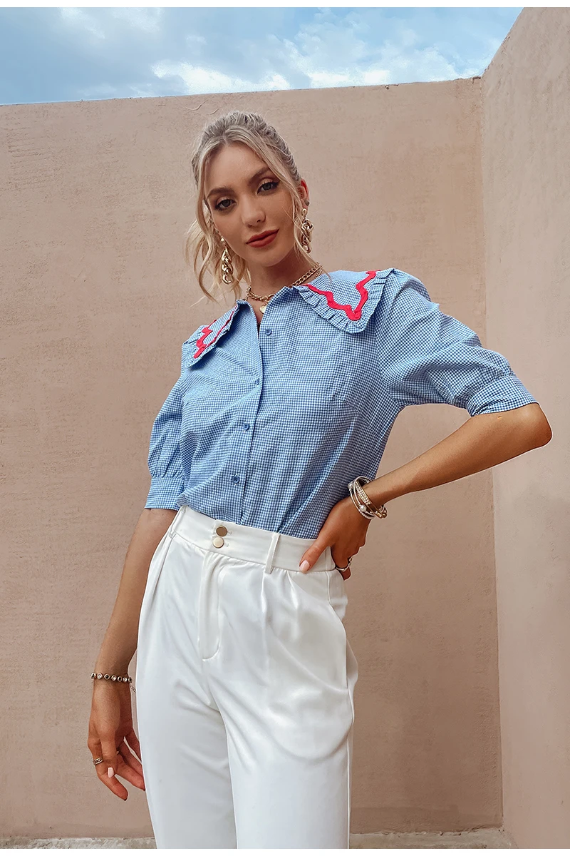 victoria’s vogue Holiday plaid cotton blouse shirt summer Girlish doll collar women’s short tops blue Soft three quarter sleeve blouses