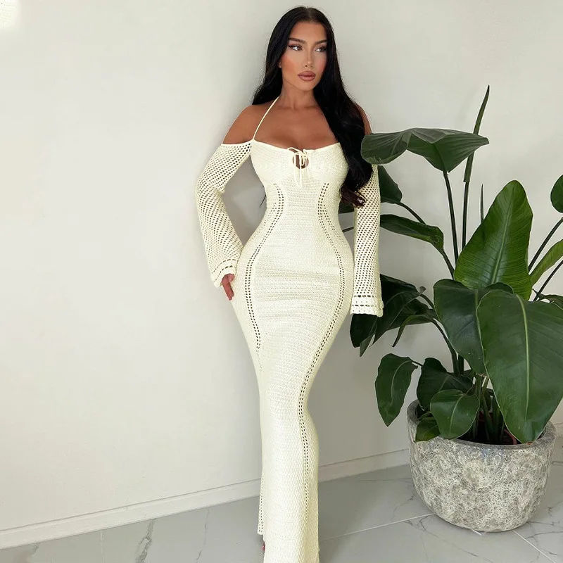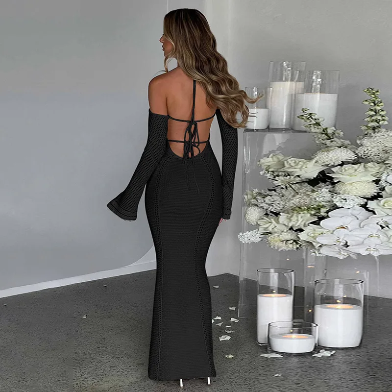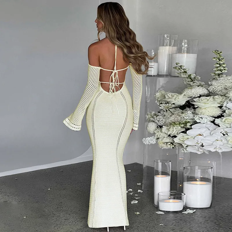 Victoria’s Vogue Hollow Out Backless Knitted Sexy Maxi Dress For Women Autumn New Off-shoulder Strapless Bodycon Long Dress Elegant
