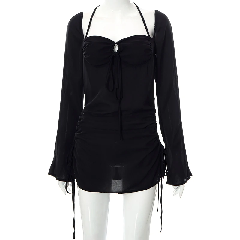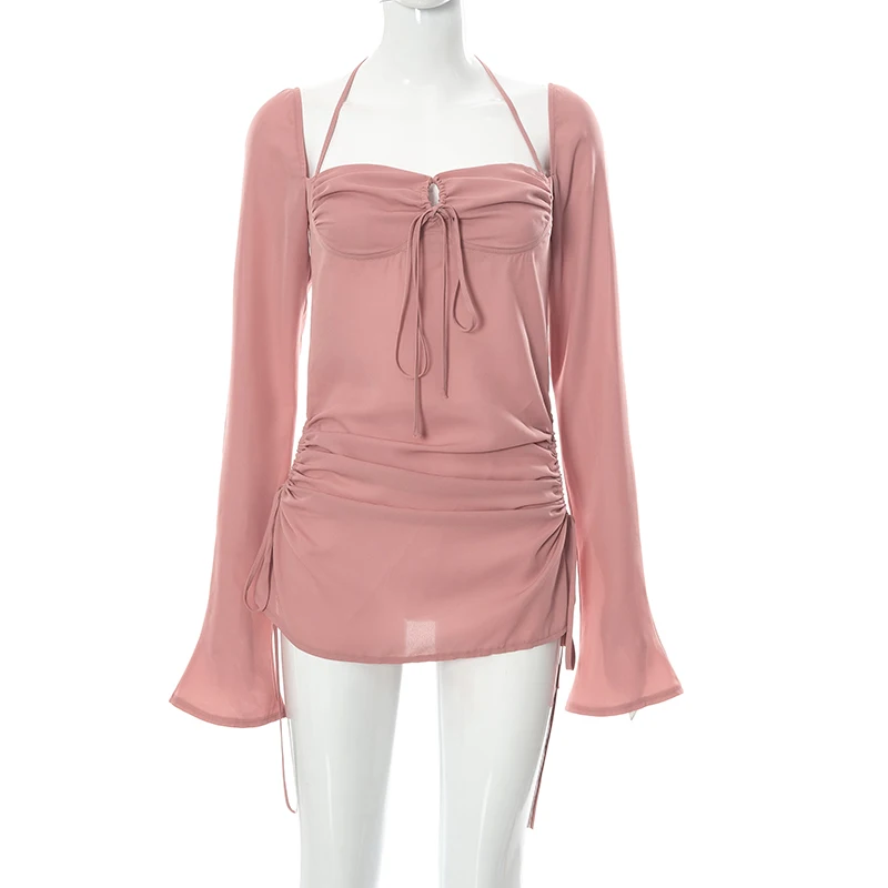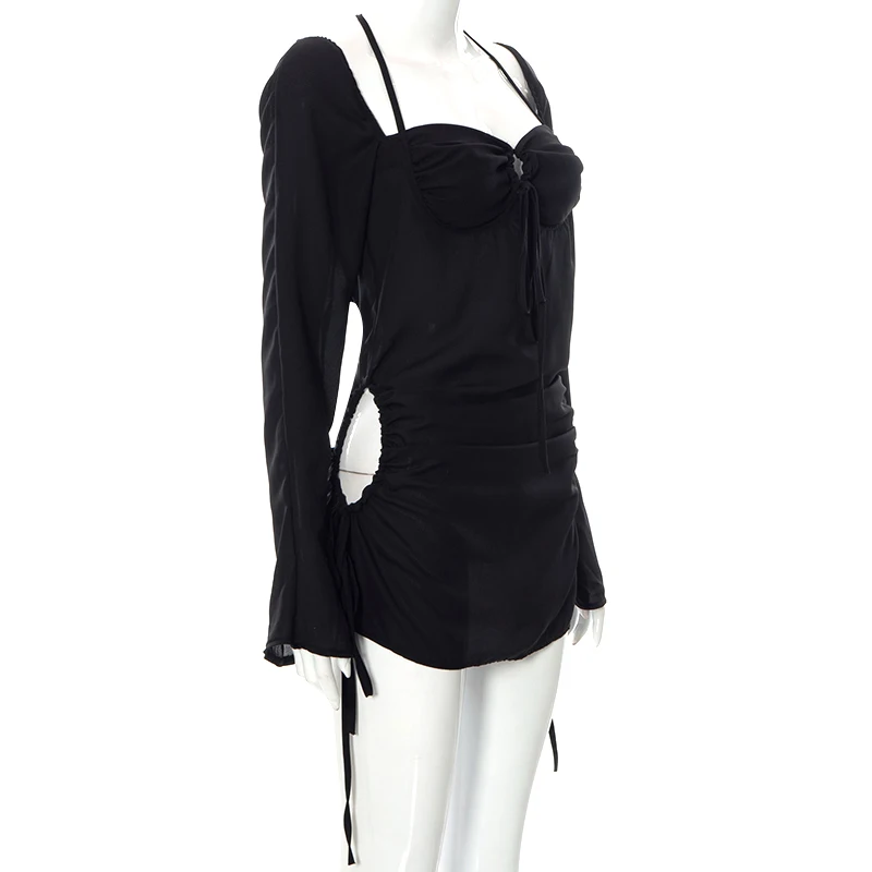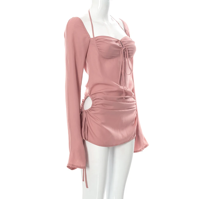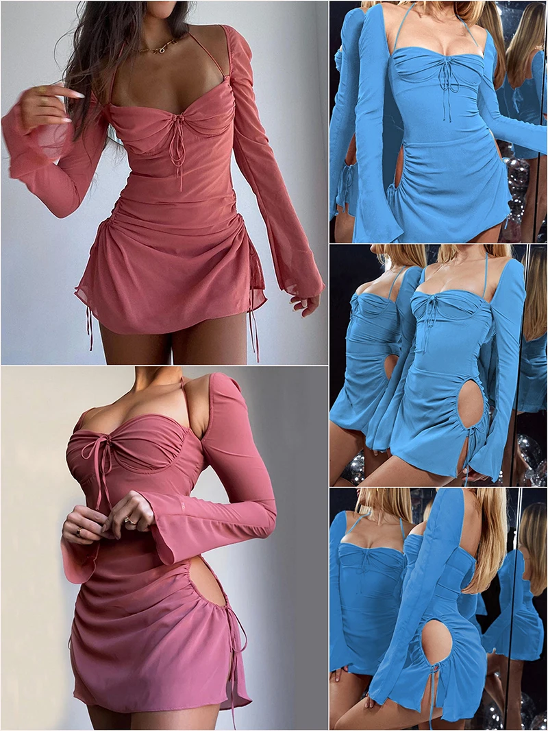 victoria’s vogue Hollow Out Ruched Dress Women 2022 Spring Sexy Slim Flare Sleeve Female Clothing Solid Backless Drawstring Dress Mini