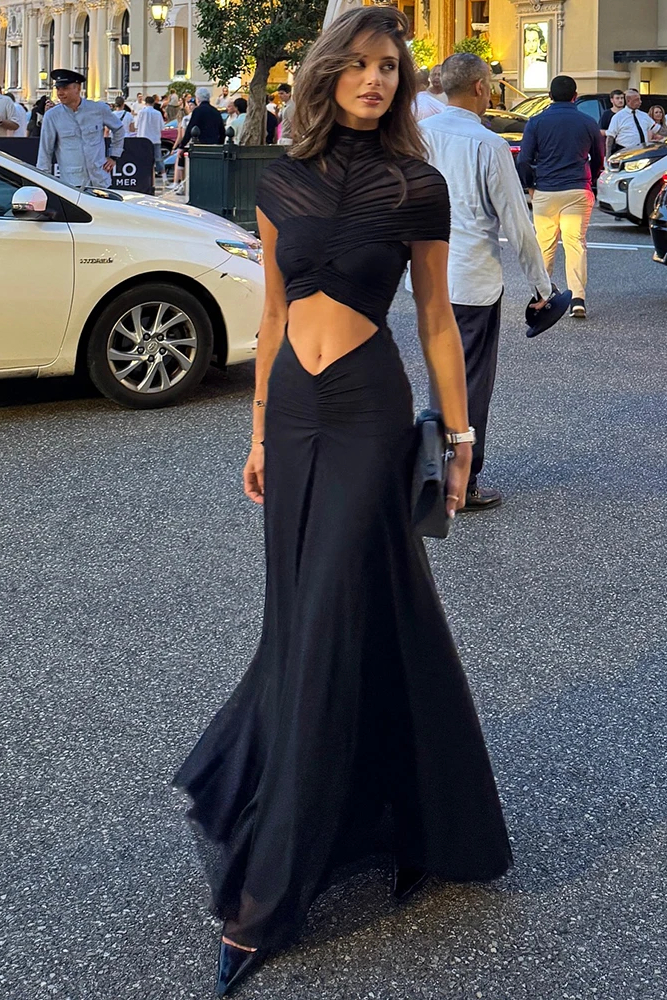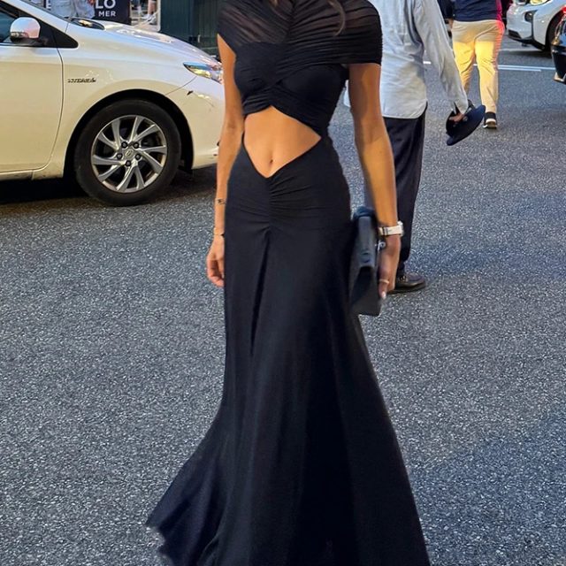 Victoria’s Vogue Hollow Out Short Sleeve Sexy Maxi Dress Women Fashion O Neck Ruched High Waist Bodycon Club Party Long Dress Female