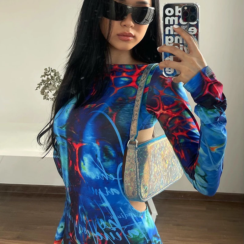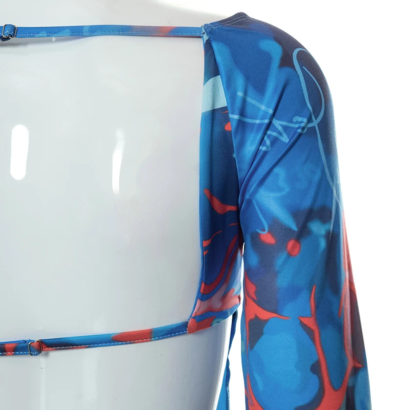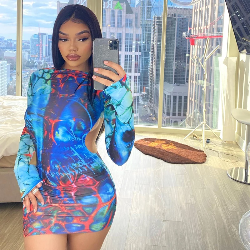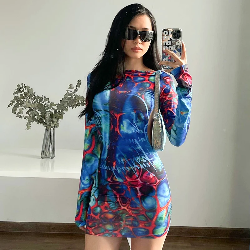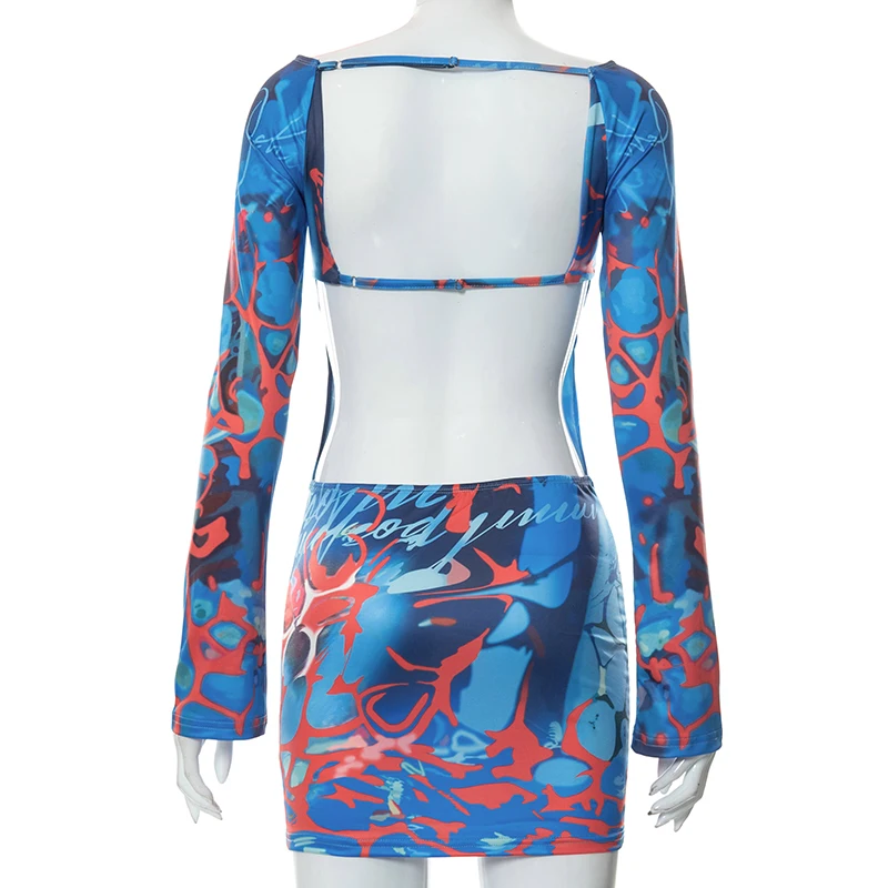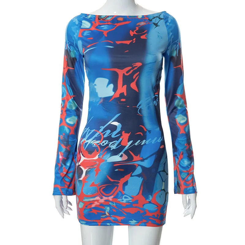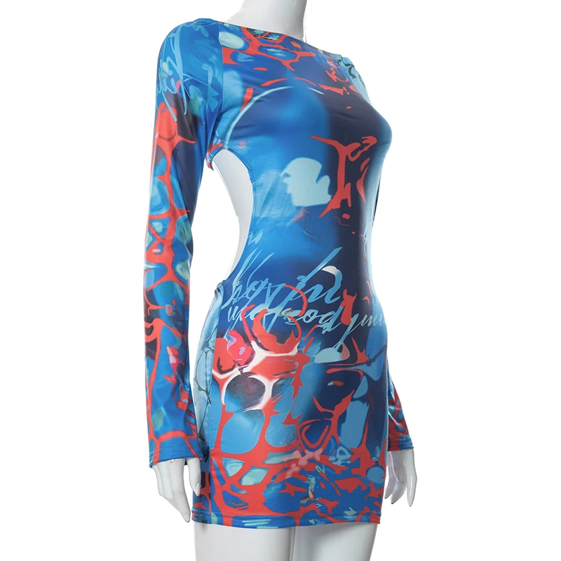 victoria’s vogue INS Open Back Long Sleeve Multicolor Printed Mini Dress Women Casual Comfortable Y2K