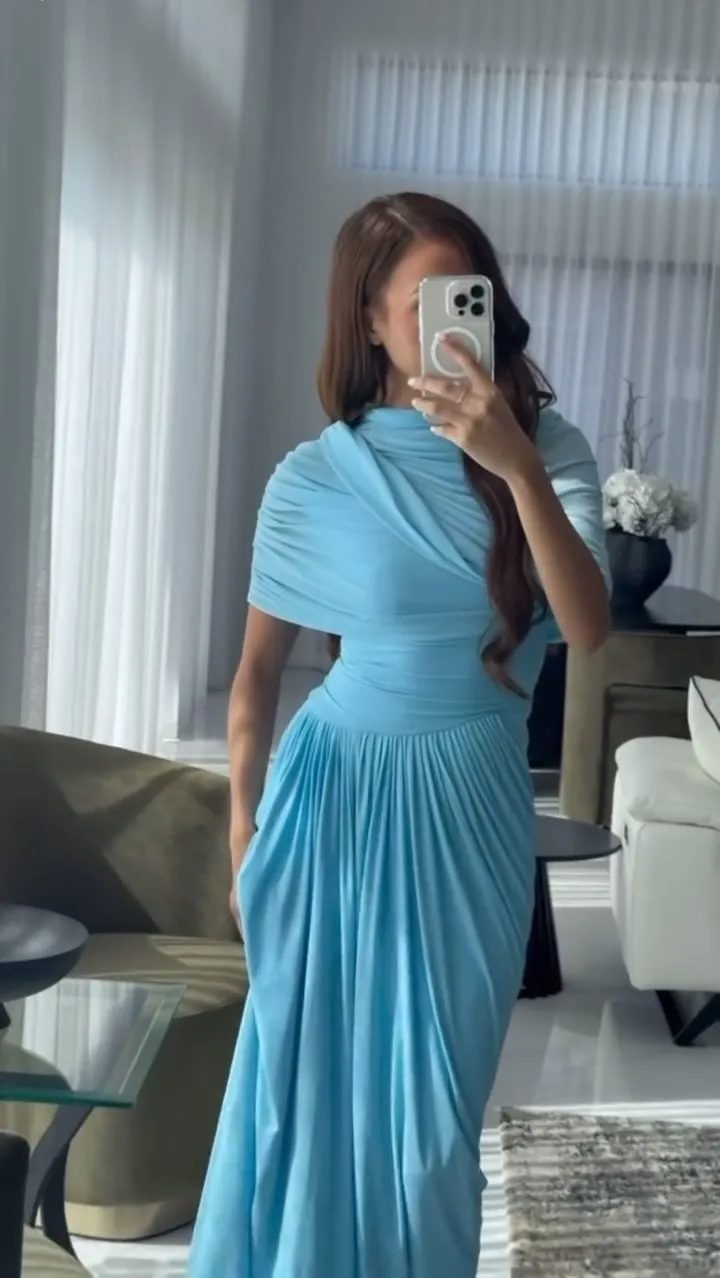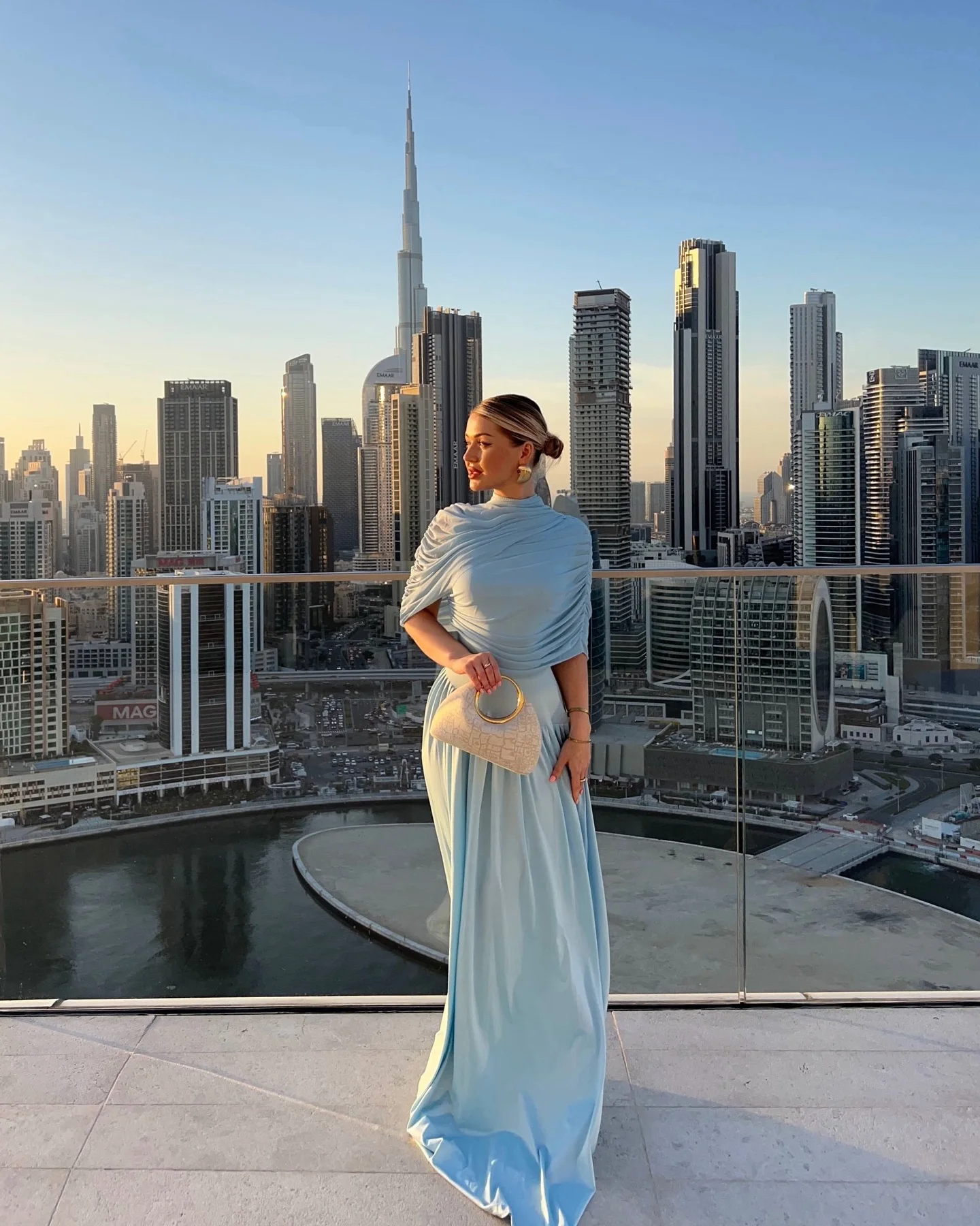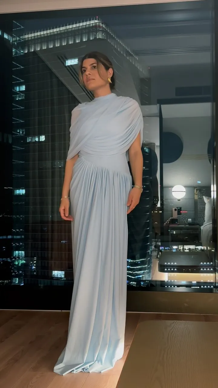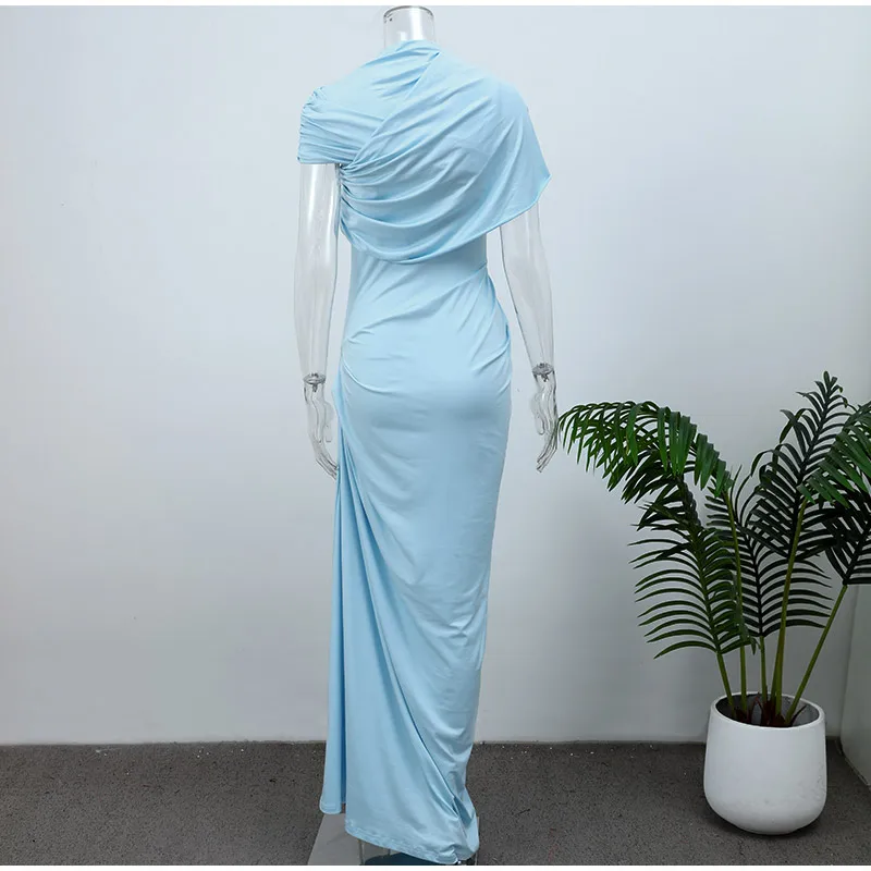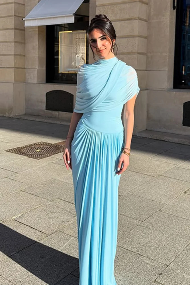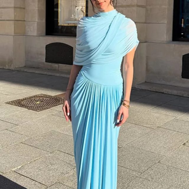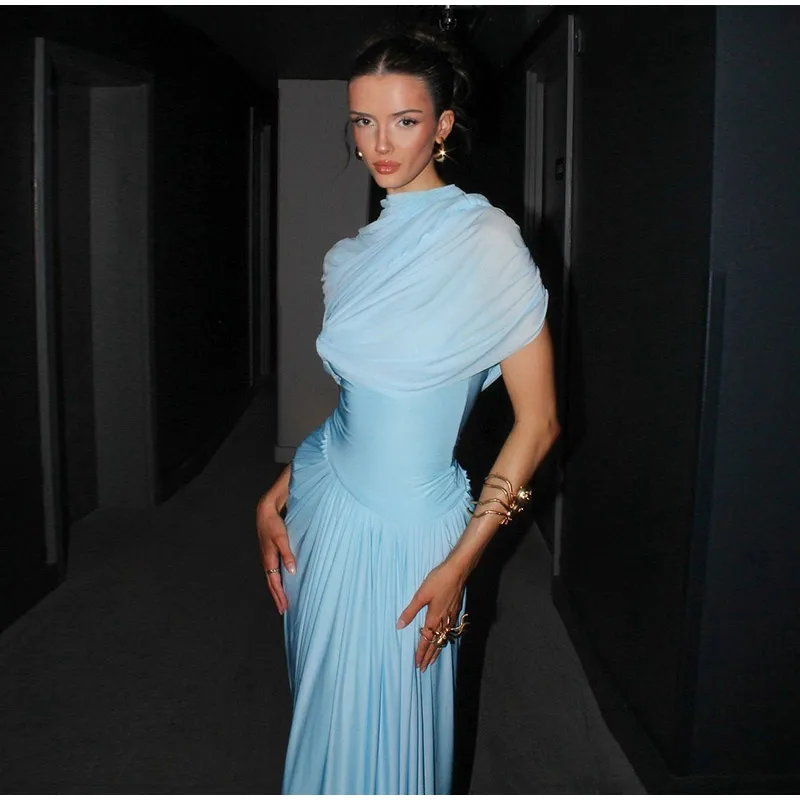 Victoria’s Vogue Irregular Shawl Blue Maxi Dress Women’s Fashion Turtleneck Slim Fit Pleated Vestidos 2025 New Lady Evening Party Robes Summer