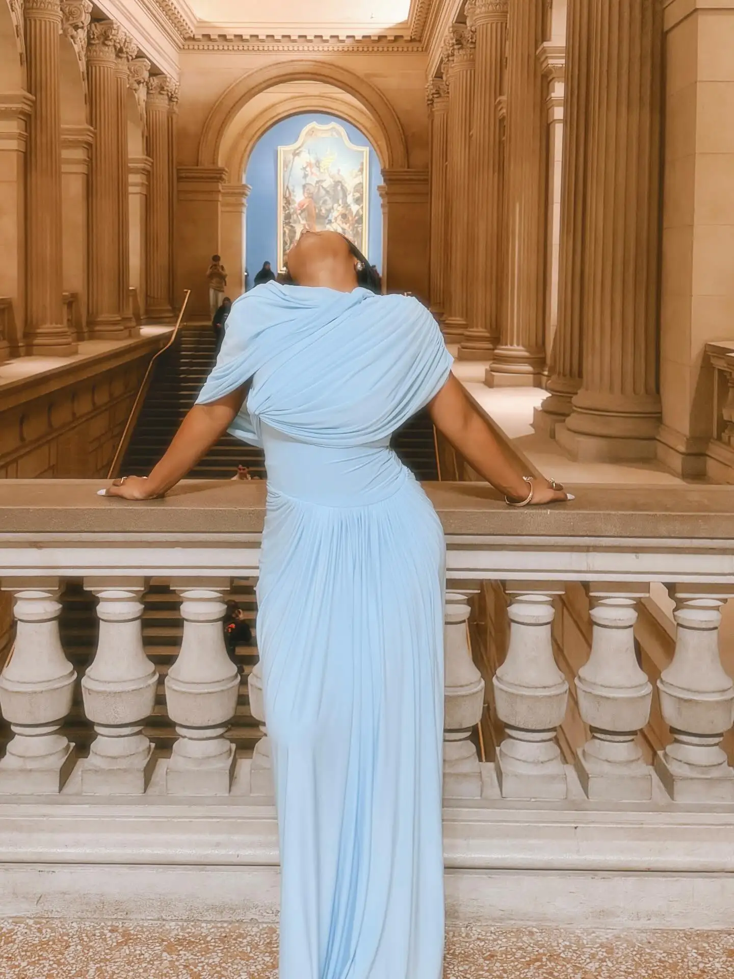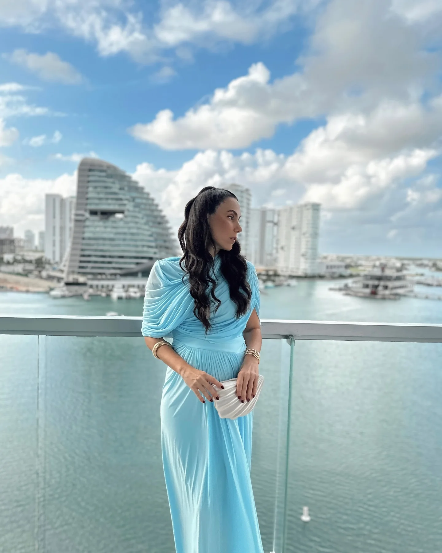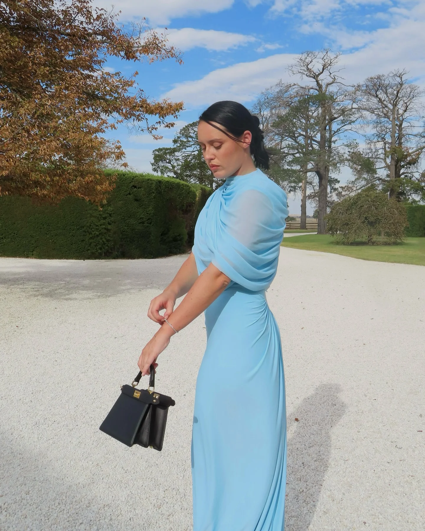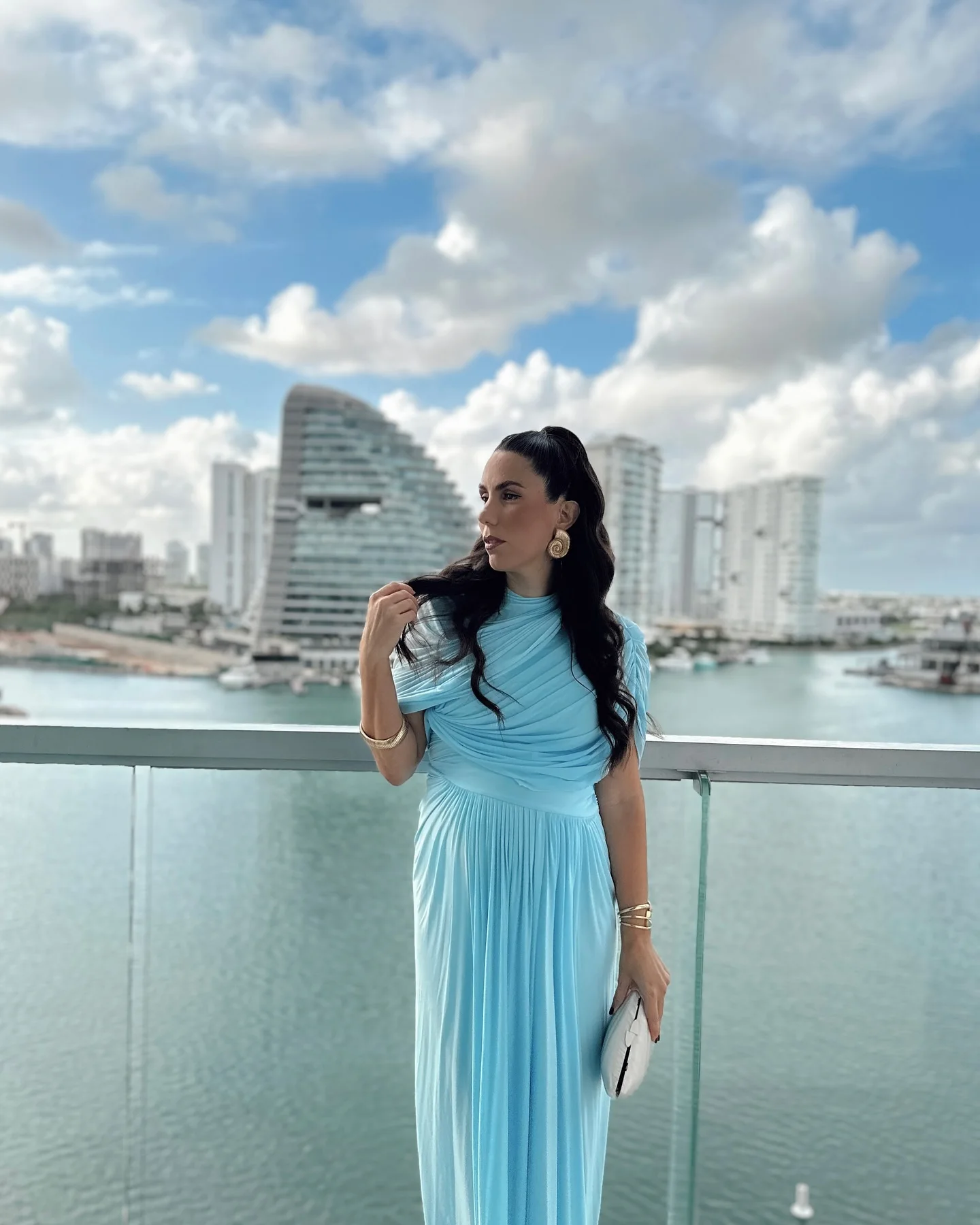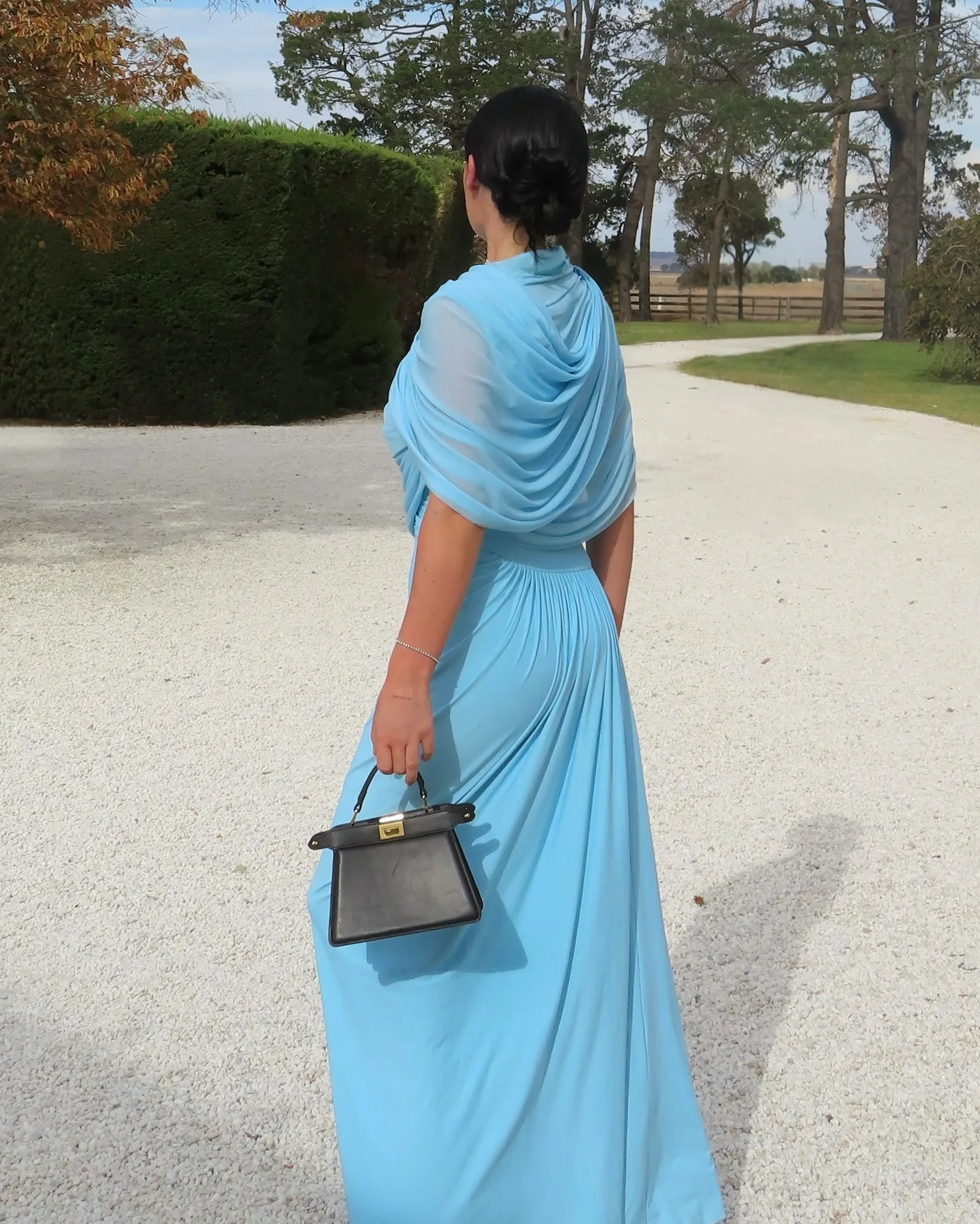 Victoria’s Vogue Irregular Shawl Blue Maxi Dress Women’s Fashion Turtleneck Slim Fit Pleated Vestidos 2025 New Lady Evening Party Robes Summer