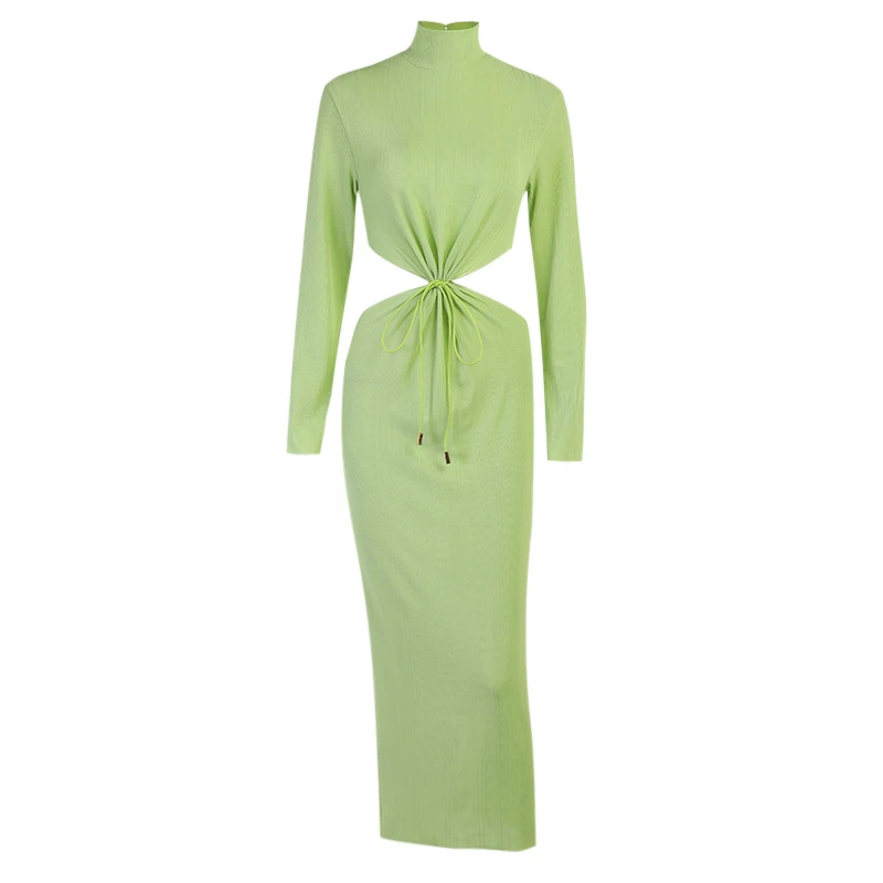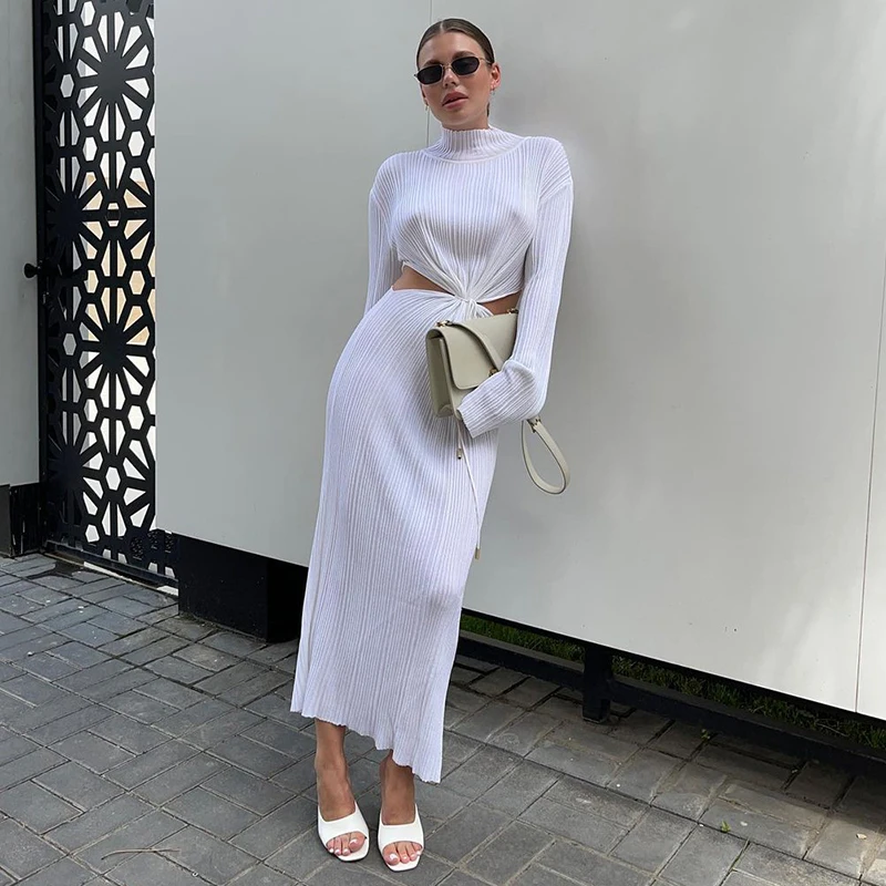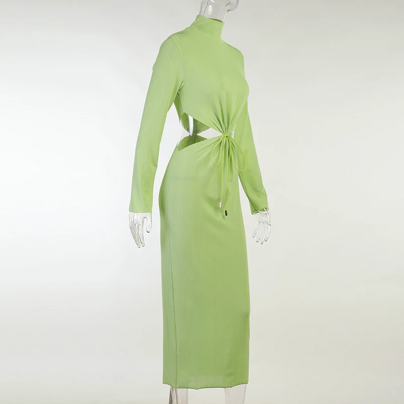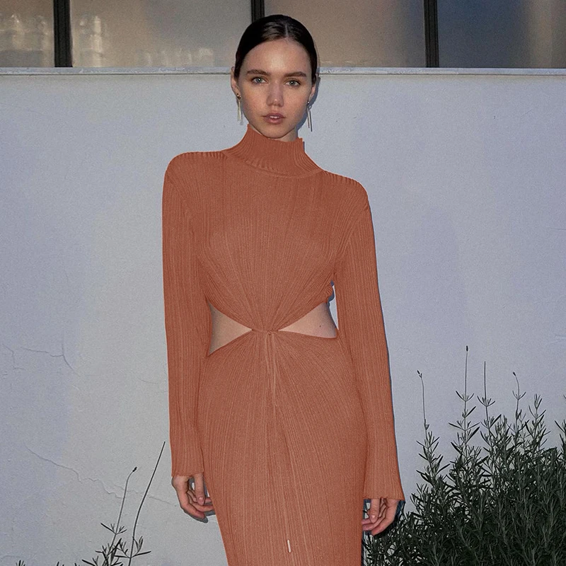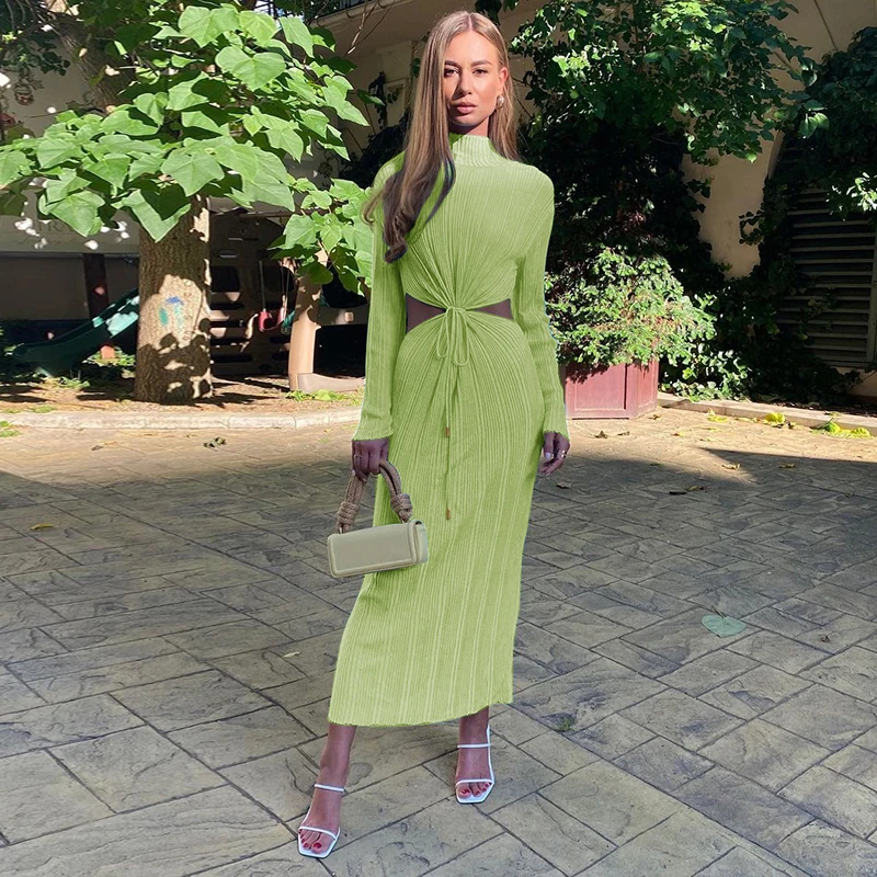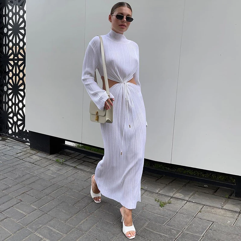 victoria’s vogue Knit Midi Woman Dresses Long Sleeve Cut Out Elegant Office Lady Twist Lace Up Turtleneck Sexy Dresses For Women