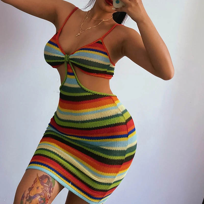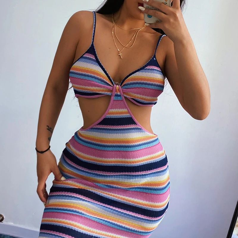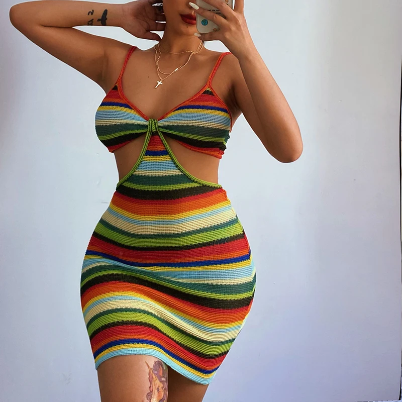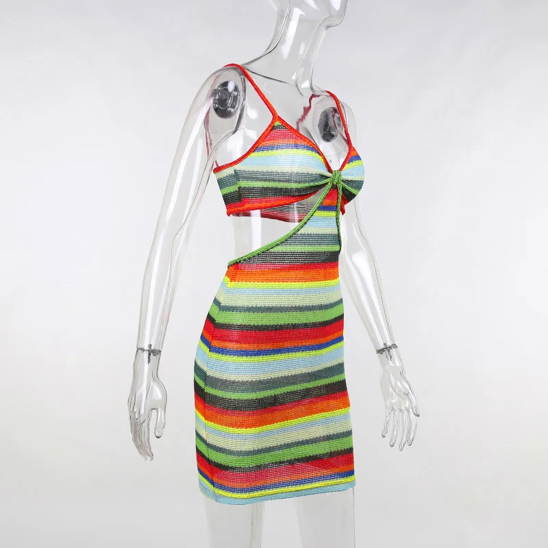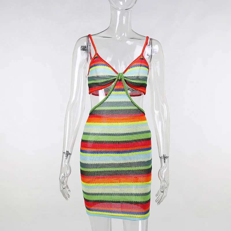 victoria’s vogue Knitted V-Neck Summer Strapdress For Women Sleeveless Hollow Out Sexy Summer Party Dress Women Stripe Mini Dresses2021