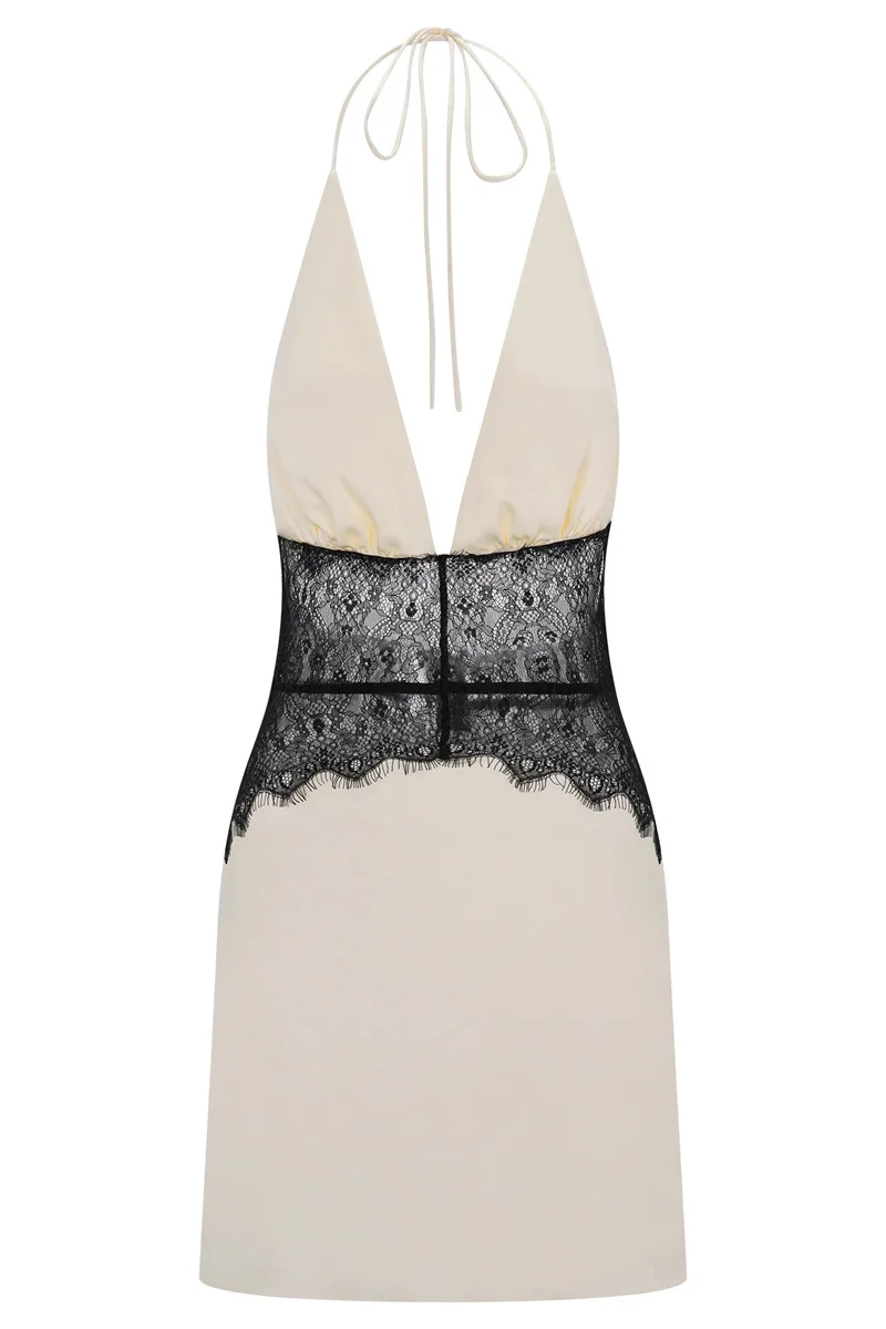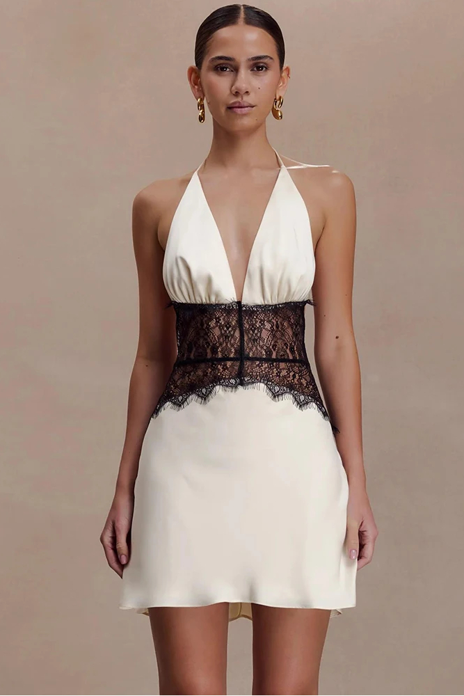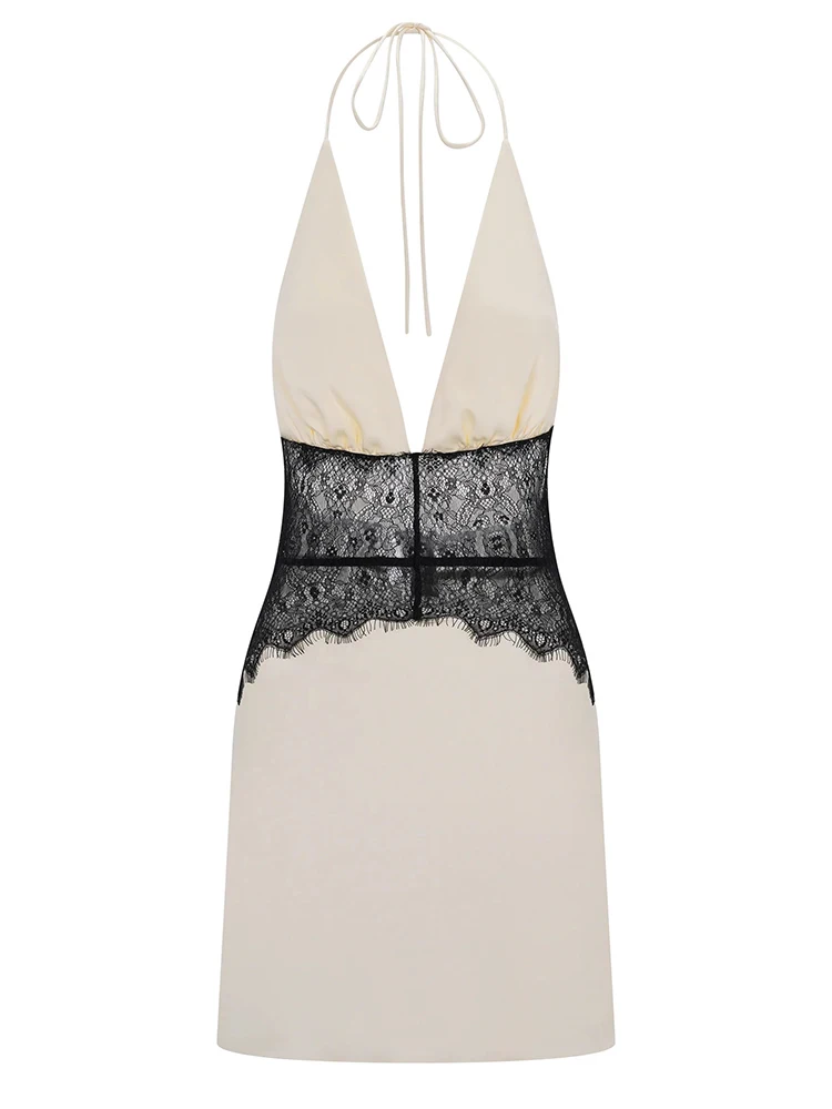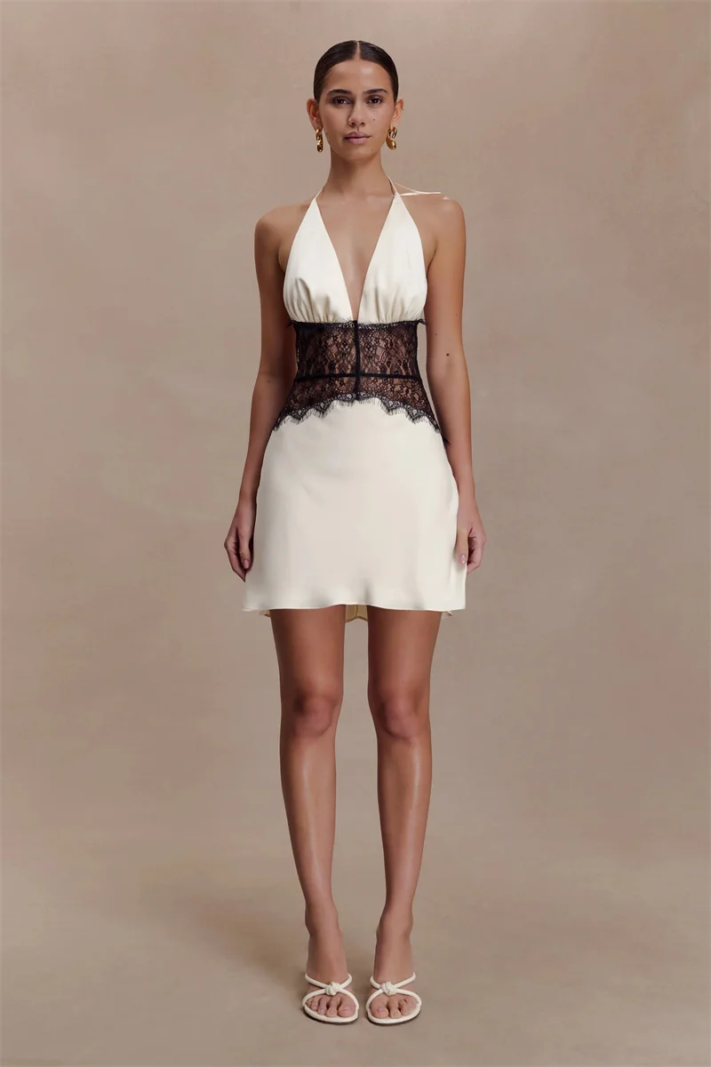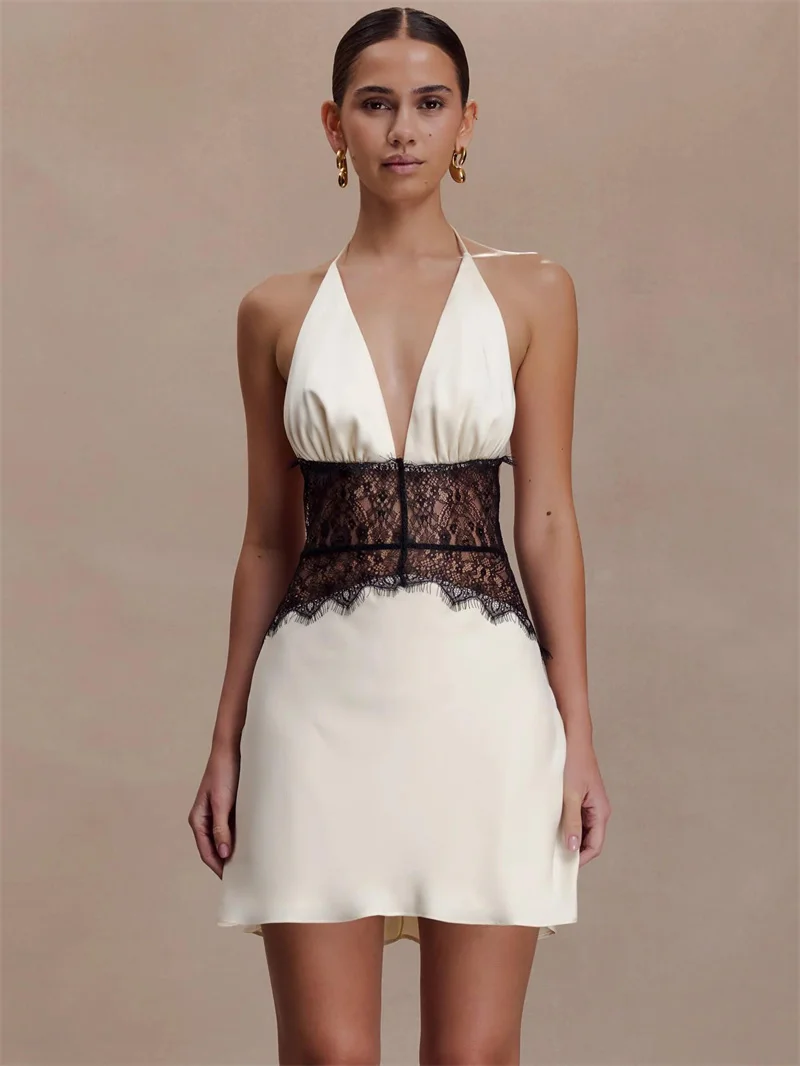 Victoria’s Vogue Lace Patchwork Sexy Mini Dress Women Gown Elegant Halter V Neck Sleeveless Backless High Waist Club Party Dresses