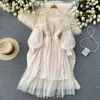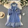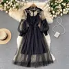 Victoria’s Vogue Ladies Dress Three-dimensional Flower Hook Mesh Temperament Stand Collar Lantern Sleeve High Waist Slim Female Dresses