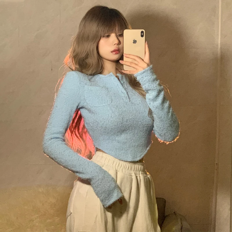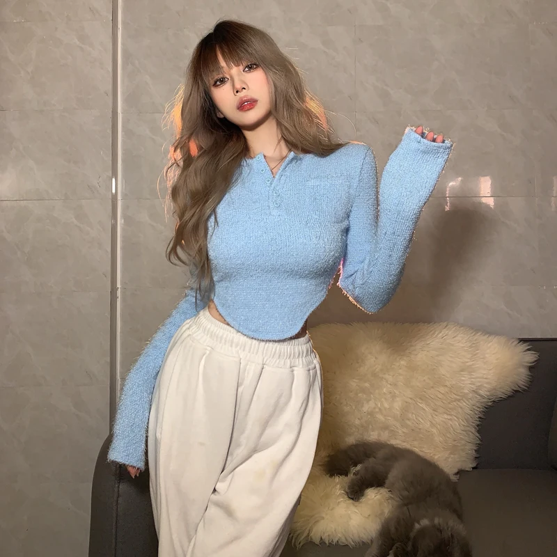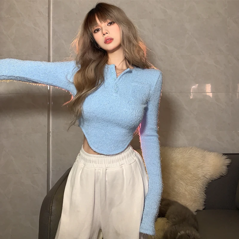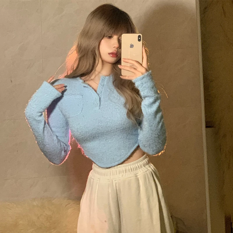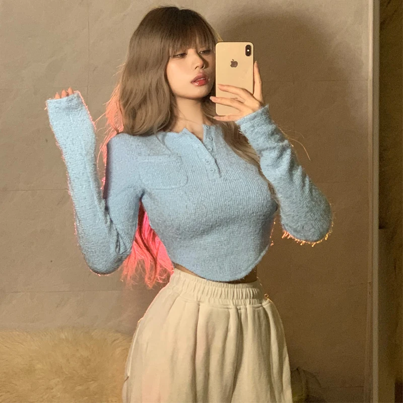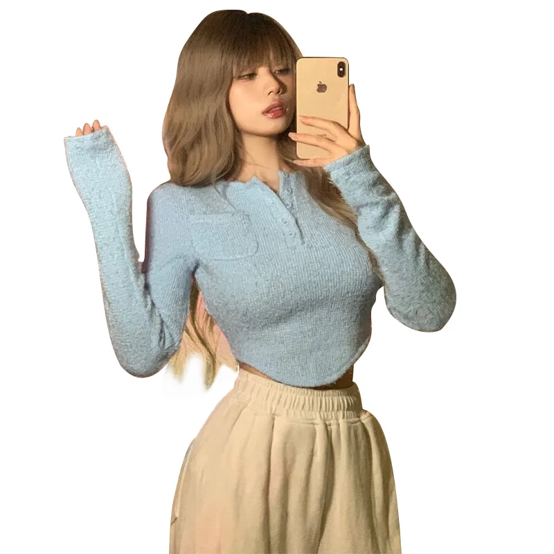 victoria’s vogue Long Sleeve Button Neck Crop Top Solid 2022 Fall Fashion Women Cute Elegant Streetwear Corset Y2K