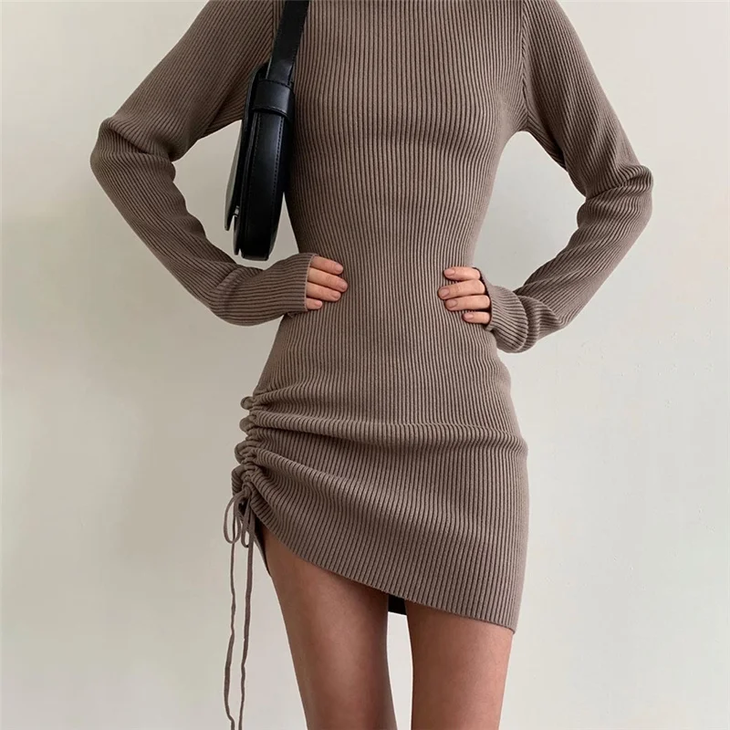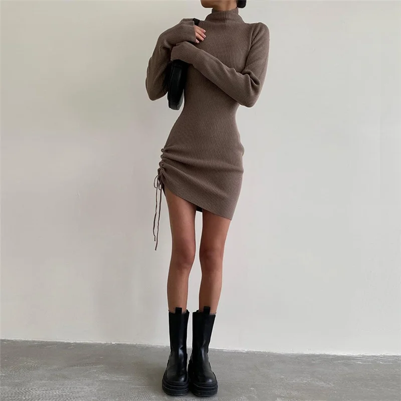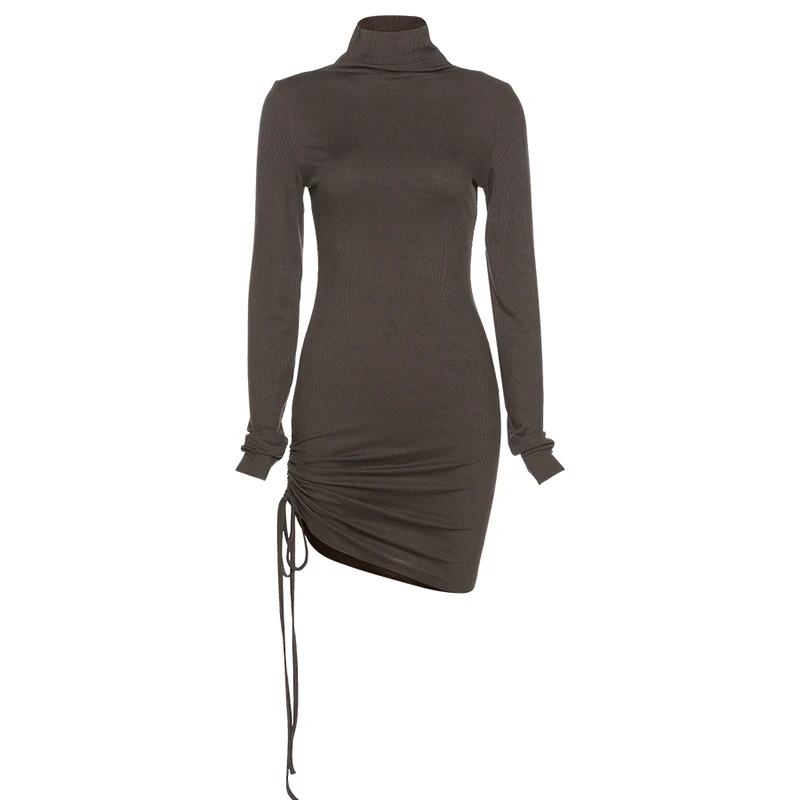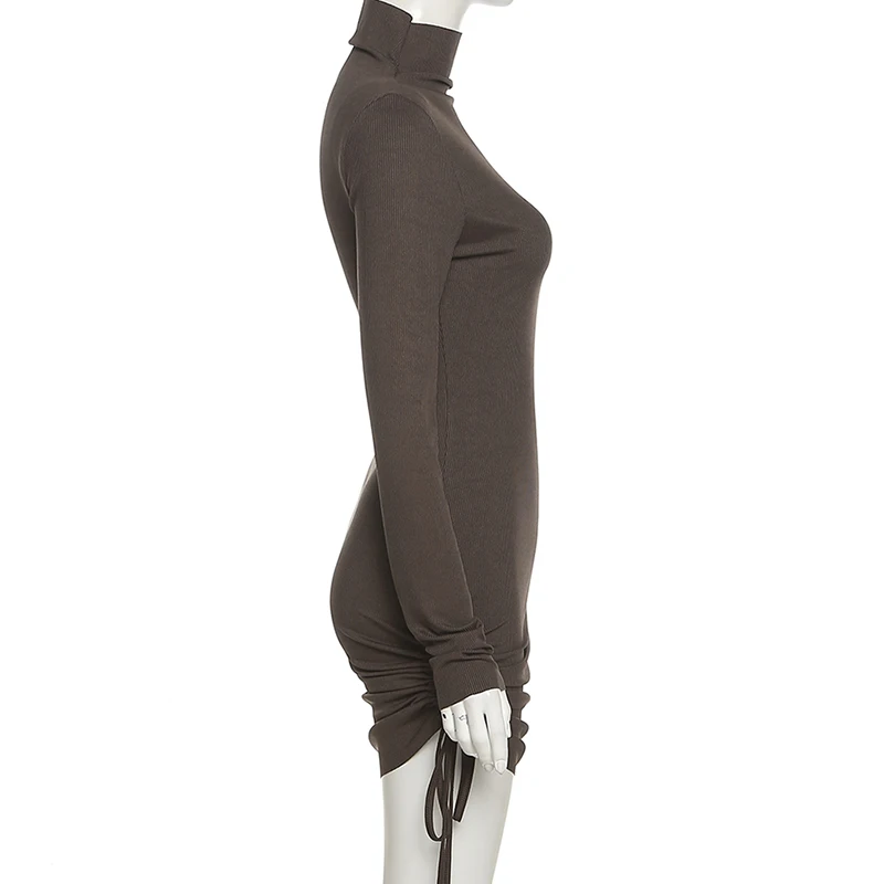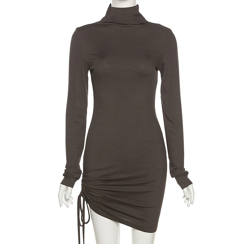 victoria’s vogue Long Sleeve Solid Drawstring Turtleneck Bandage Ruched Mini Dress 2022 Autumn Women Fashion Sexy Party Club Outfits