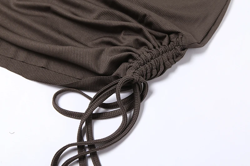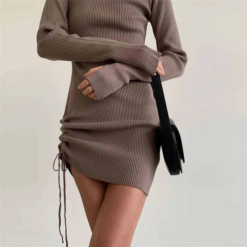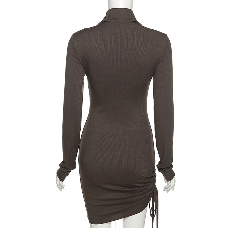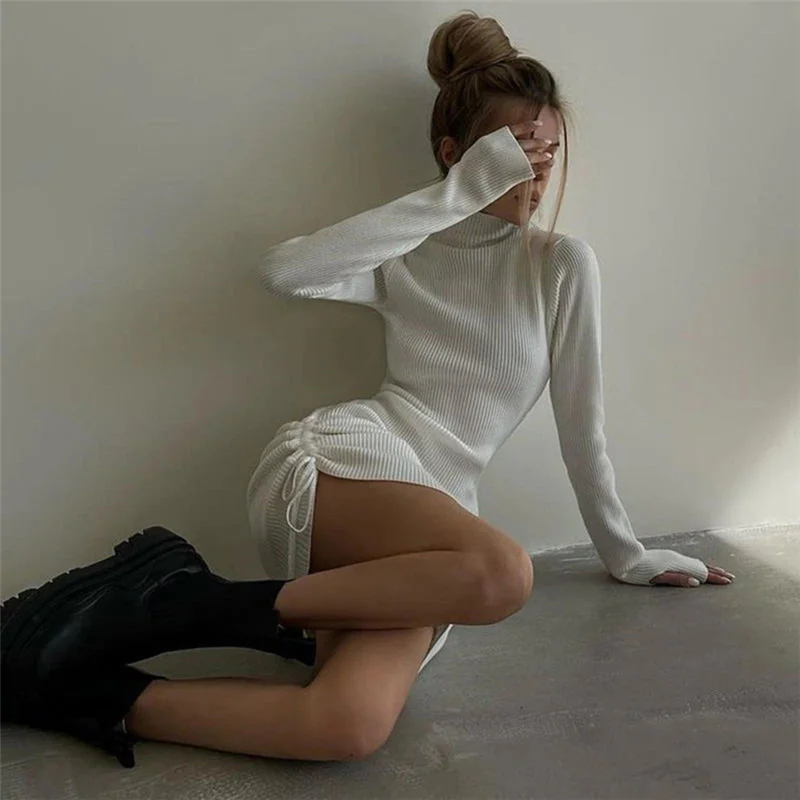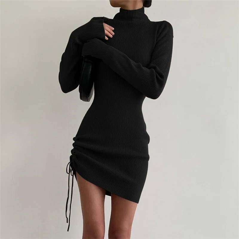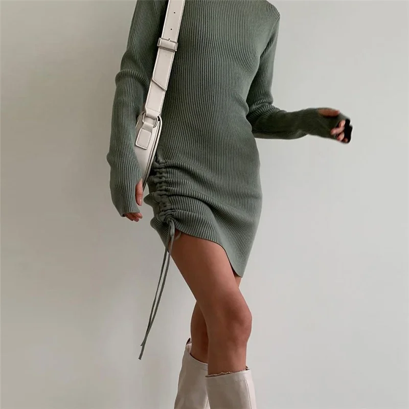 victoria’s vogue Long Sleeve Solid Drawstring Turtleneck Bandage Ruched Mini Dress 2022 Autumn Women Fashion Sexy Party Club Outfits