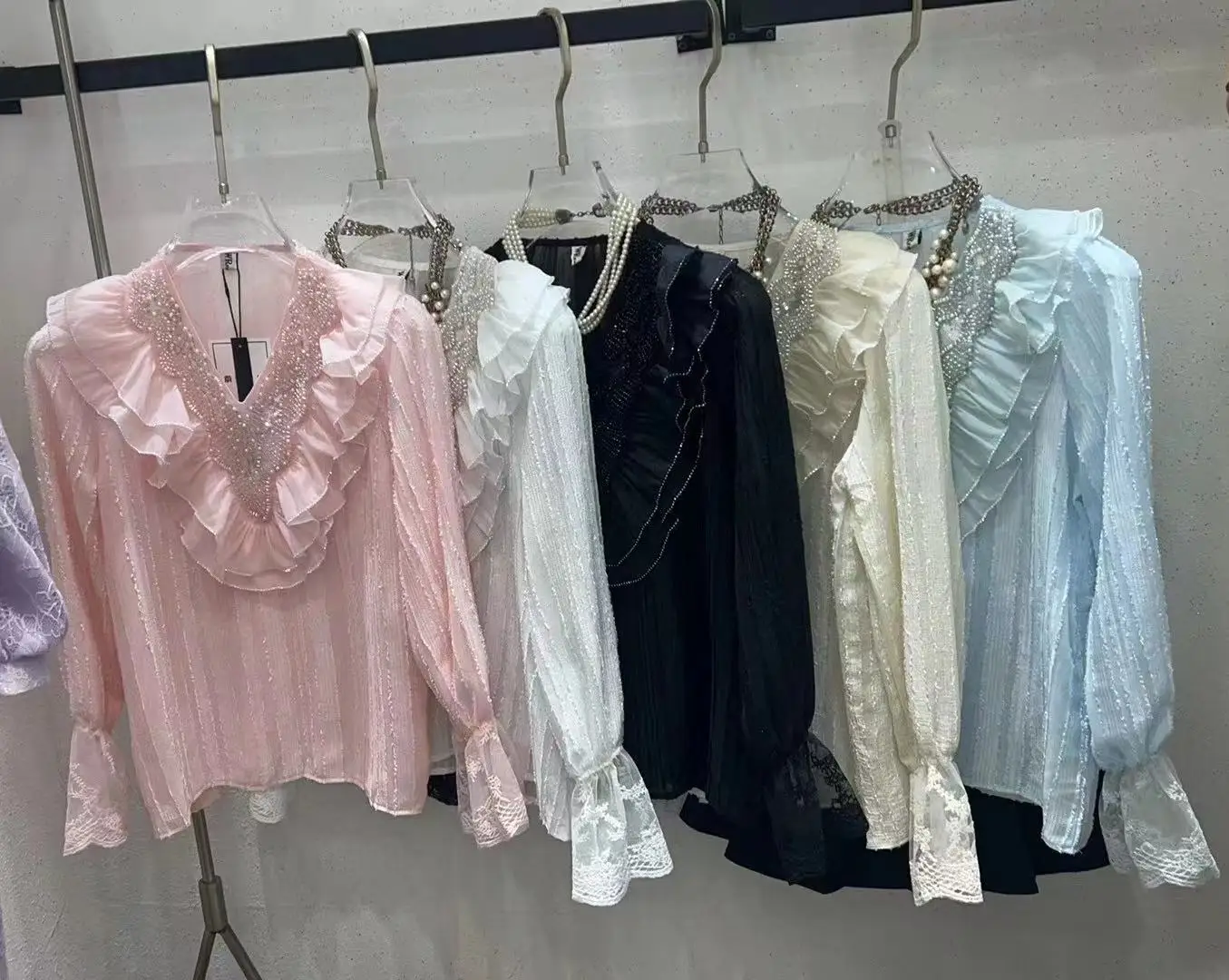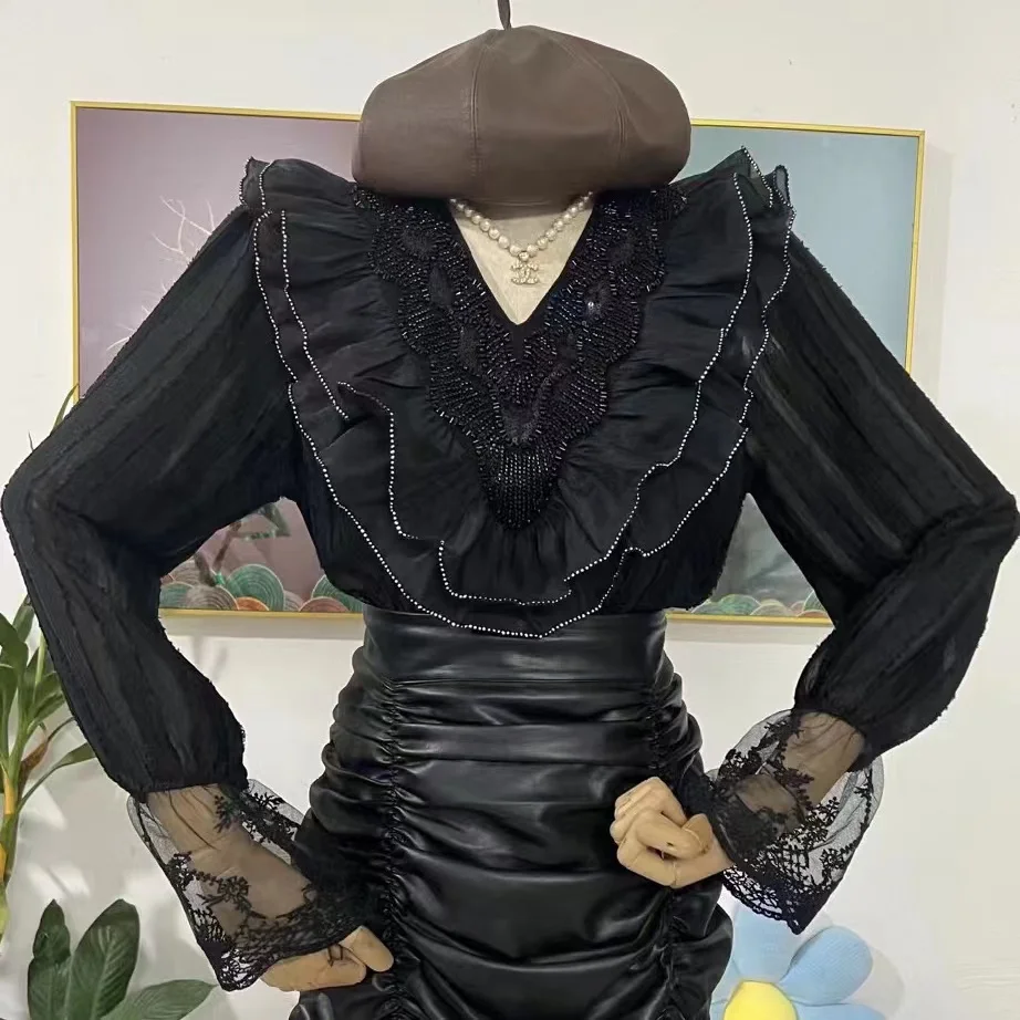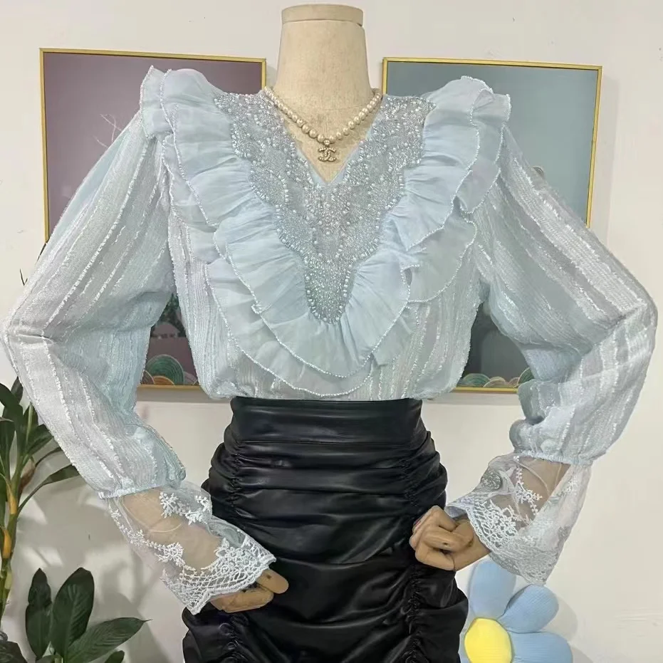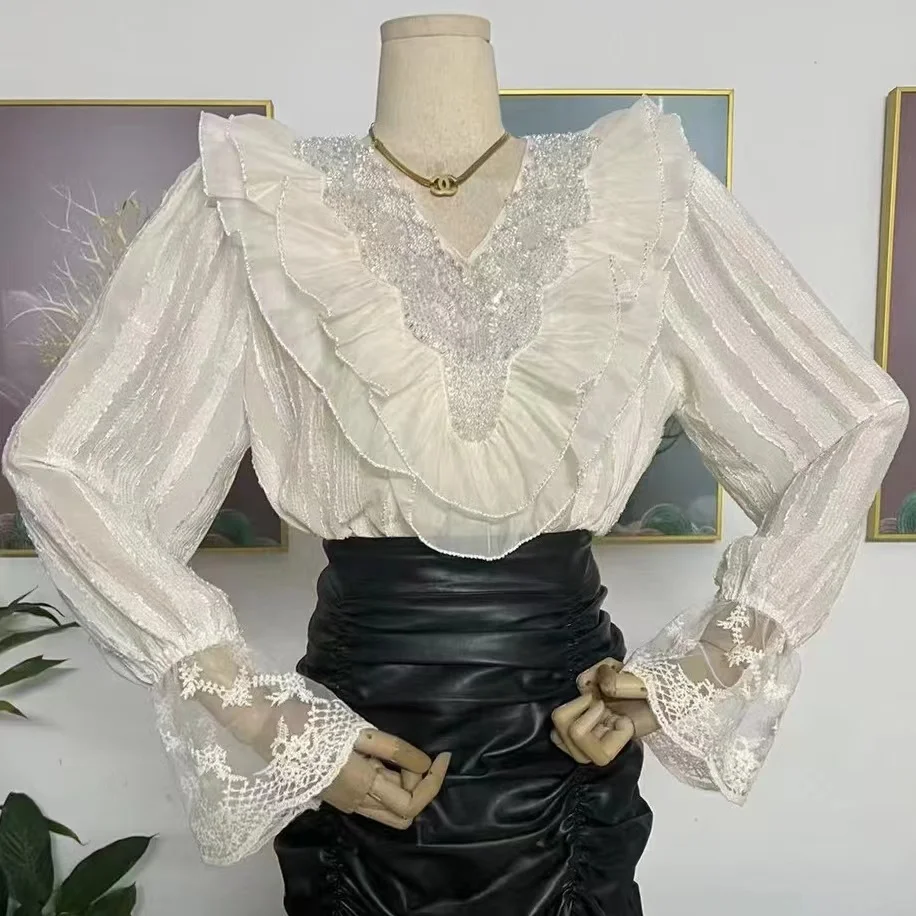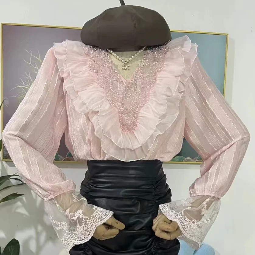 Victoria’s Vogue Luxury Beaded Sequined Stitch Lace White Black Pink Sexy Blouses Shirts For Women’s 2024 Spring Summer Long Sleeve Tops Blusas