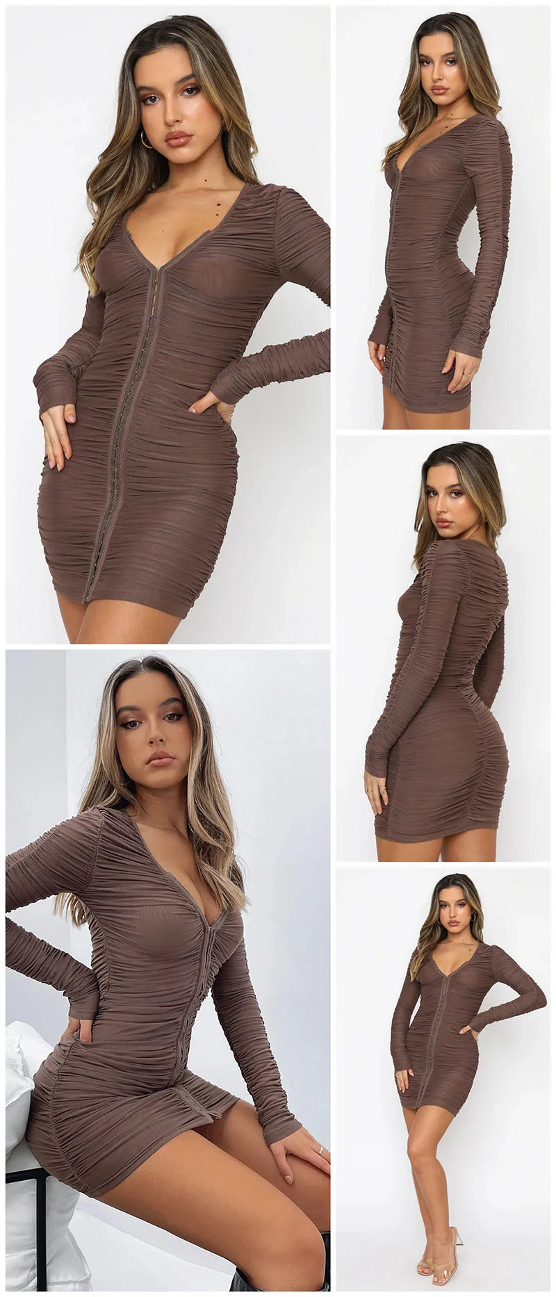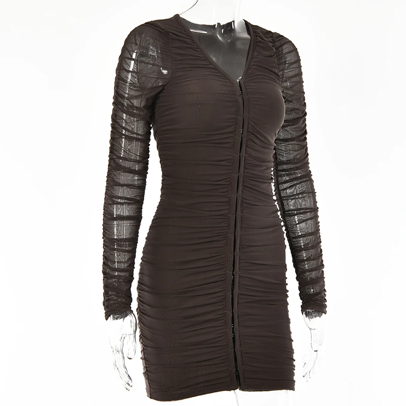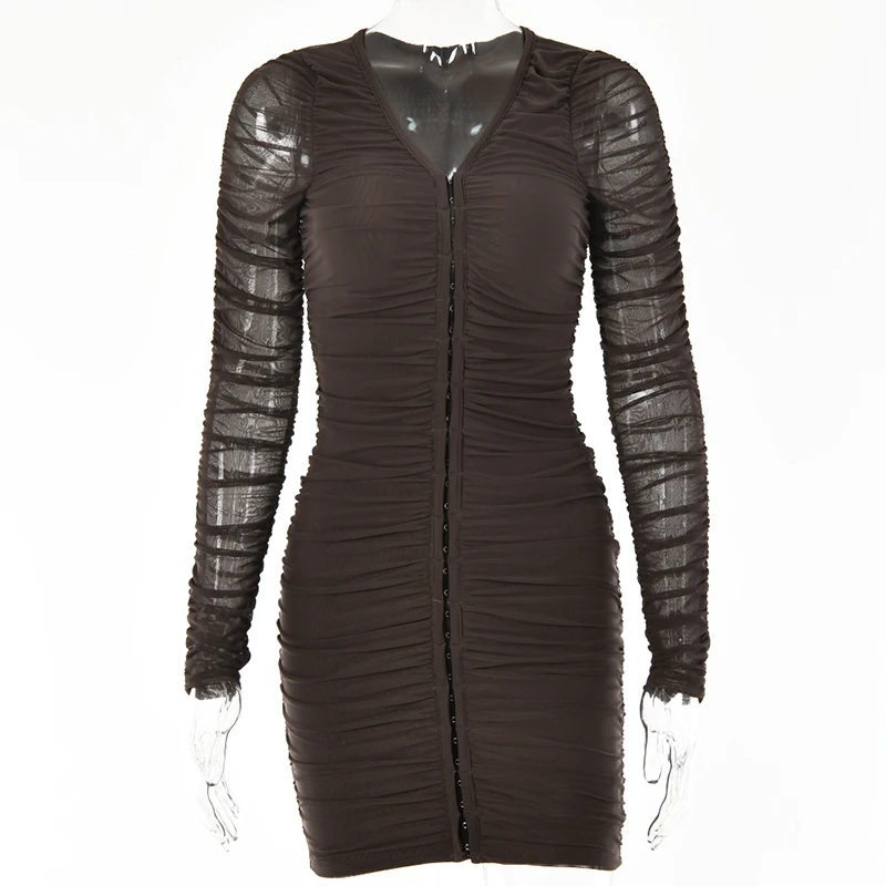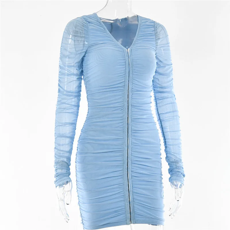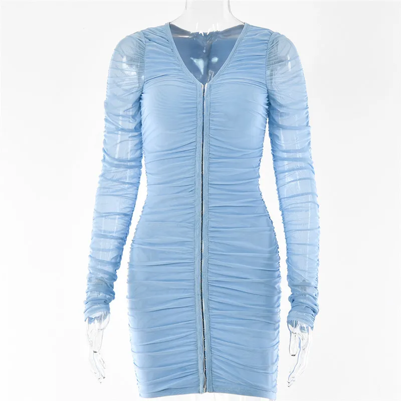 victoria’s vogue Mesh Double Layer Bodycon Mini Dress For Women Autumn V Neck Zipper Long Sleeve Skinny Draped Dress Vestidos Streetwear